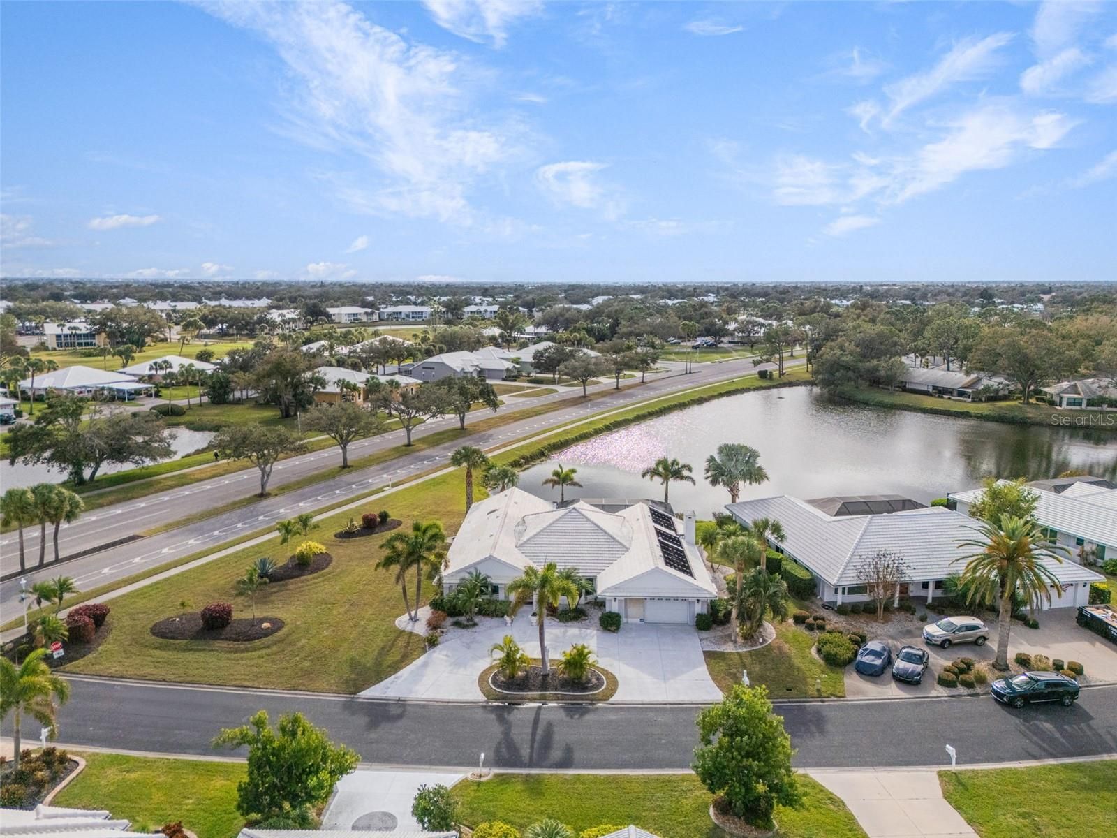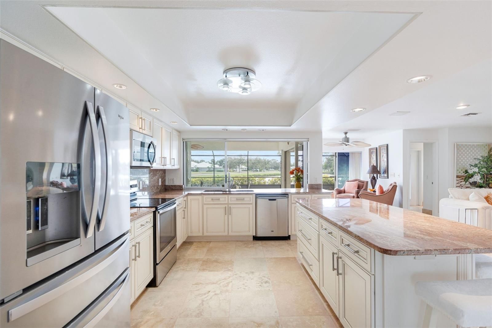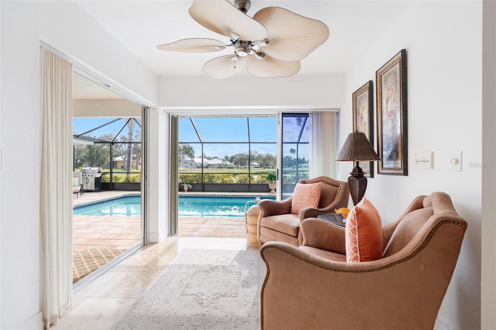 Exceptional Home in an Exceptional Neighborhood! Set on a prized corner lot with tranquil water views, this 2747 sq. ft TURNKEY residence offers the perfect blend of elegance, space and location. Polished Travertine floors throughout flow seamlessly throughout the home, creating a timeless cohesive look while enhancing the light filled interiors. Originally a model home, it features thoughtfully designed living spaces: an airy, light filled, sunken living room; a kitchen that boasts granite countertops, a walk in pantry, an island, and a pass through to the lanai; a spacious family room that shows off an inviting stone fireplace, tinted pocket doors, and a full bath that leads out to the pool. The elegant primary ensuite is complete with walk in closets and water views. Enjoy your private oasis in the large sparkling heated pool that overlooks a tranquil lakefront view. The pool was resurfaced in 2016 and a new pool cage was added in 2025. In addition, a new HVAC system was added in 2025. Located in the highly desirable Plantation Golf & Country Club, this home places you just minutes from beaches, the Atlanta Braves Spring Training Stadium, Downtown Wellen Park, shops and restaurants. Whether enjoying peaceful mornings overlooking the water or entertaining guests in a refined coastal setting, this property delivers the lifestyle that you deserve, in one of the area's most coveted locations. Call for an appointment today!