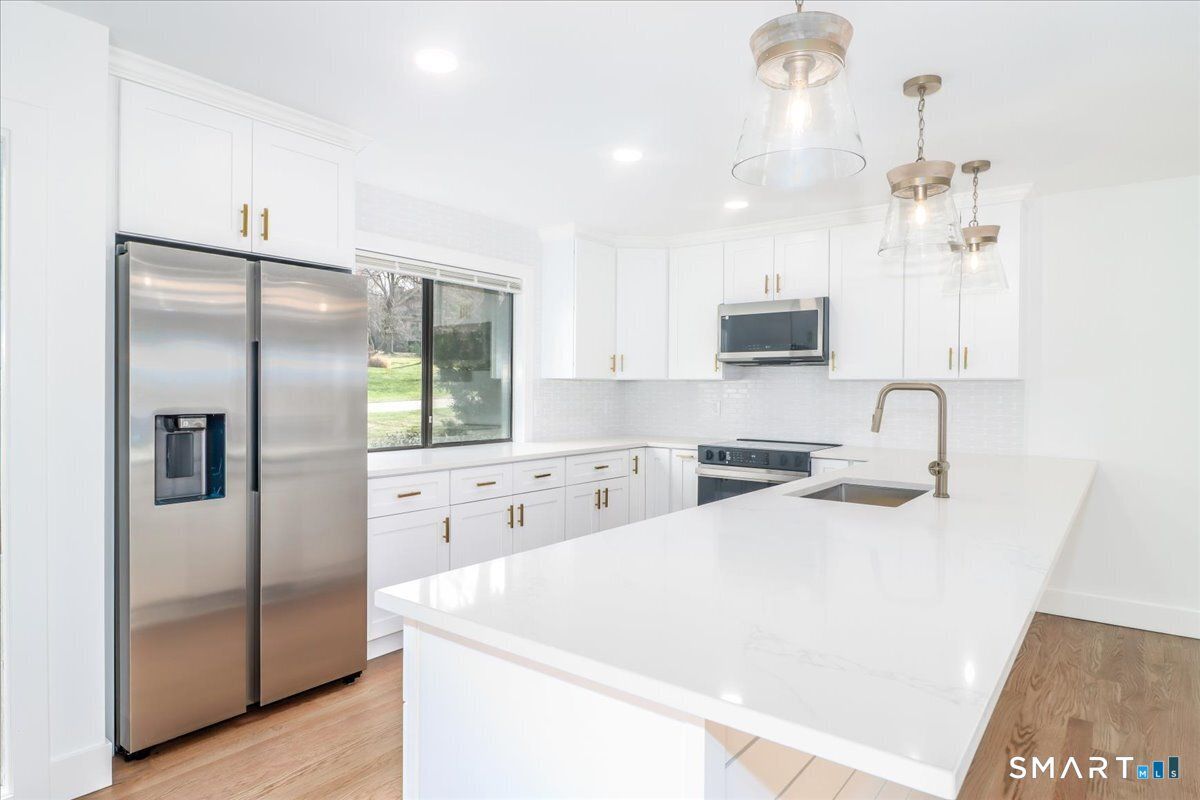 A beautifully designed/remodeled condo in the coveted adult community of Oronoque Village in Stratford, CT. Modern floor plan. Super convenient FRONT DOOR PARKING for the ease of carrying in groceries and welcoming guests to your home. Offering TWO Bedrooms and 2/1 Baths. The chef-inspired kitchen features a dramatic 13' Quartz countertop with seating for six. This completely remodeled kitchen features all new appliances. Open floor plan allowing for a combination living/dining room with Fireplace and sliders out to Deck. Hardwood Floors throughout. The Primary Bedroom Suite features a walk-in closet and beautifully remodeled Primary Bath with double sinks and spacious shower. Total square footage is 1,618.The lower level features a Bedroom, Full Bath and laundry hook up location. A truly special community with pools, many clubs, pickleball and tennis, to name a few. HOA fees include internet and cable. This condo: HOA fees are $462.77/month and Quarterly District Tax of $547.99.