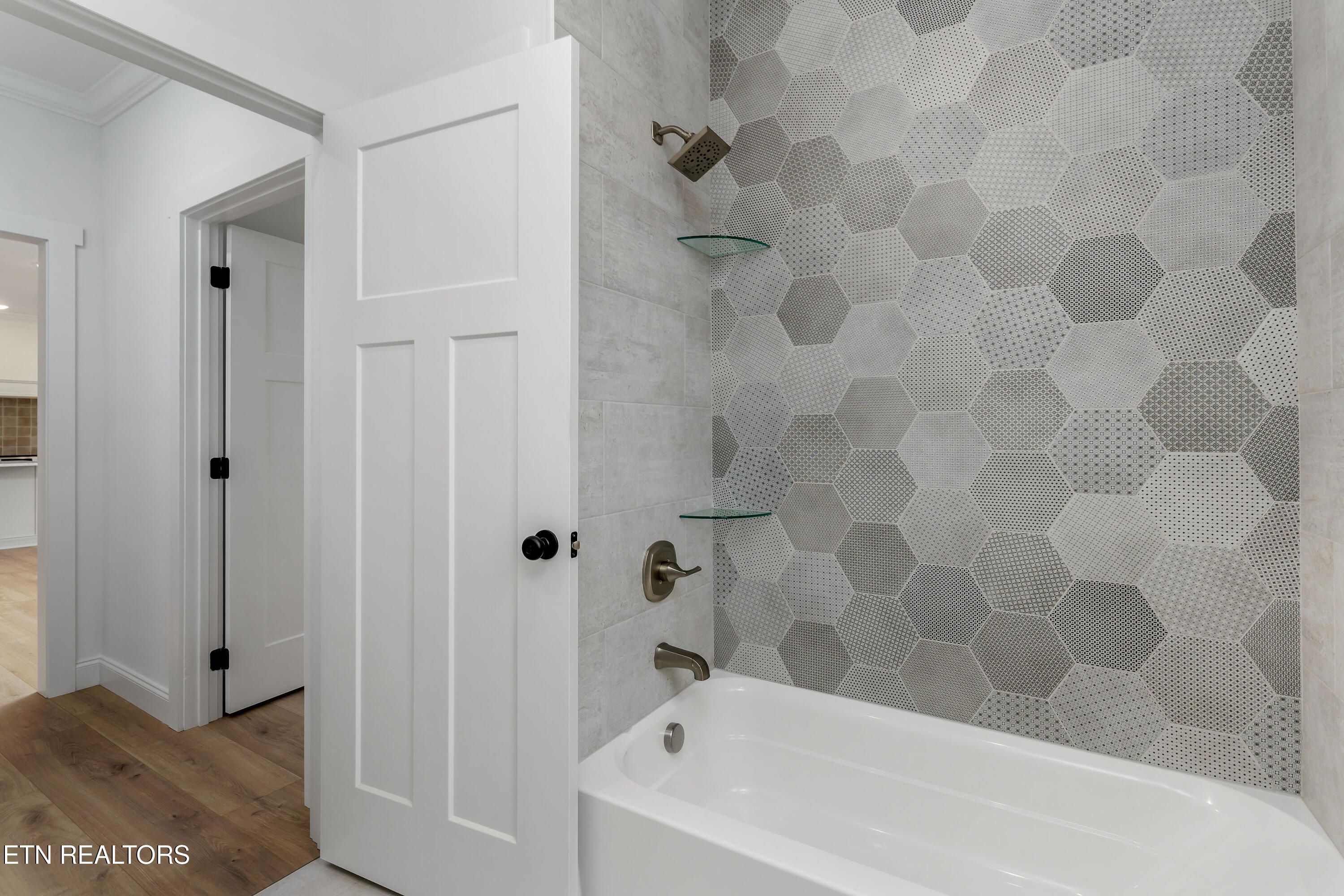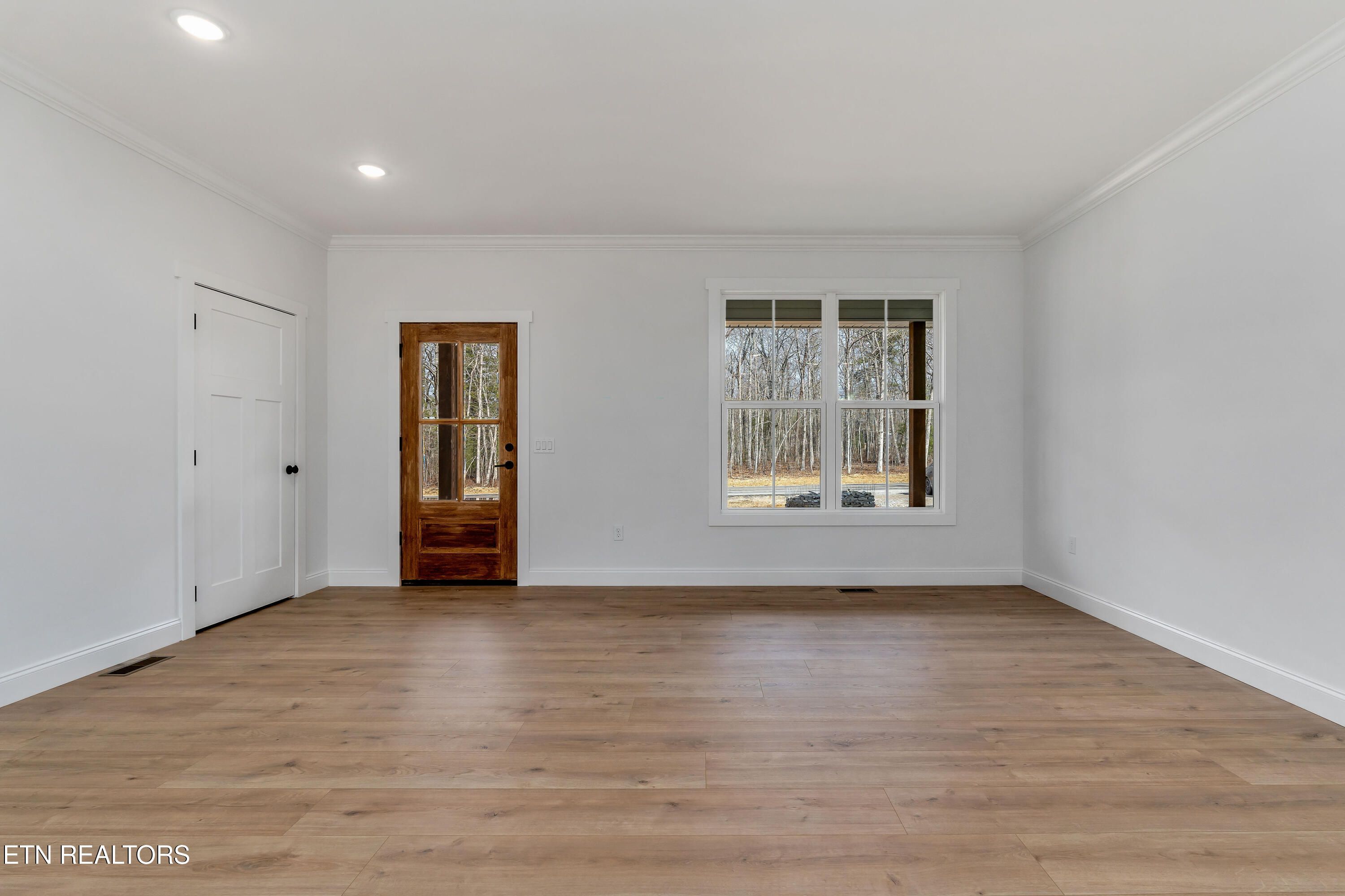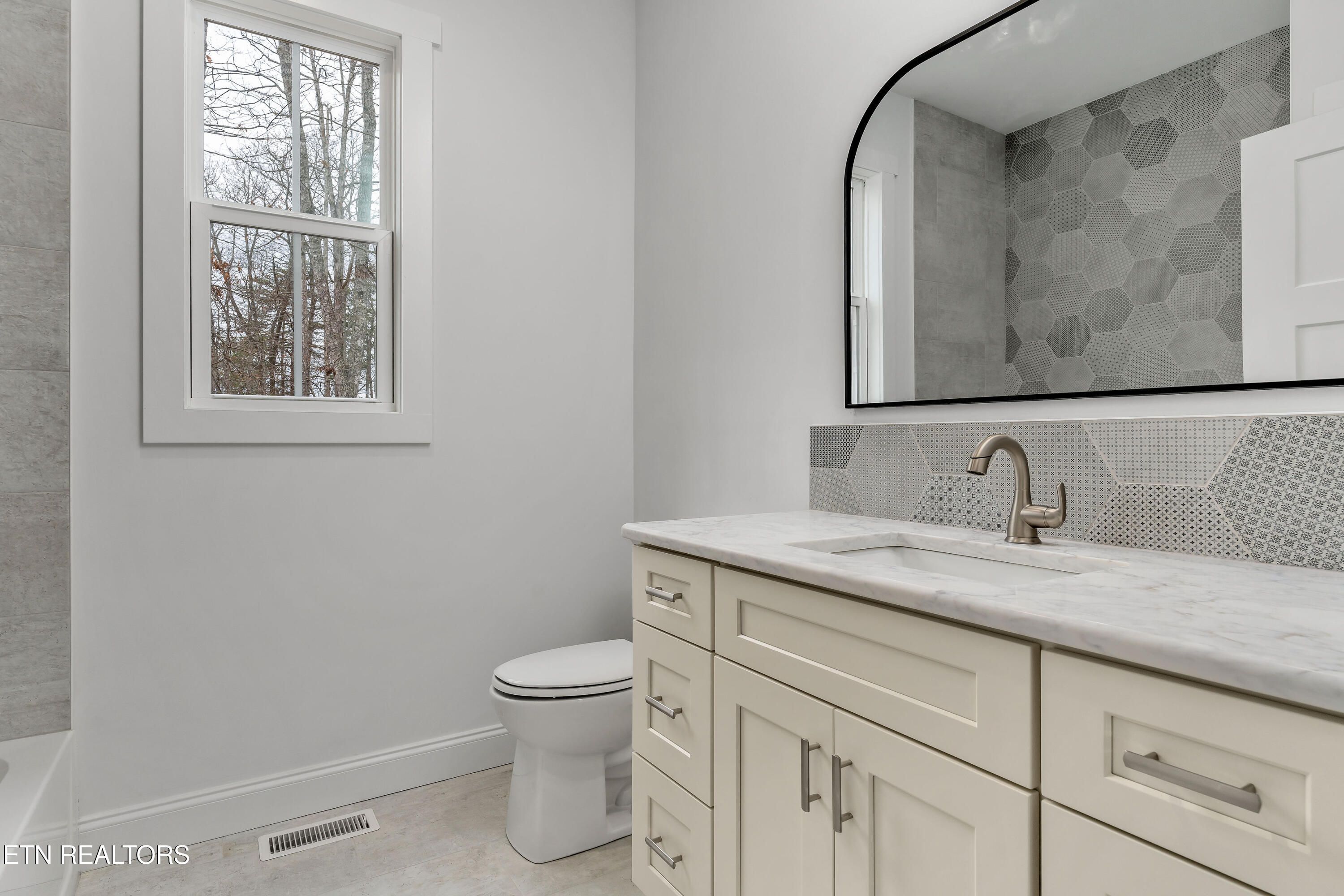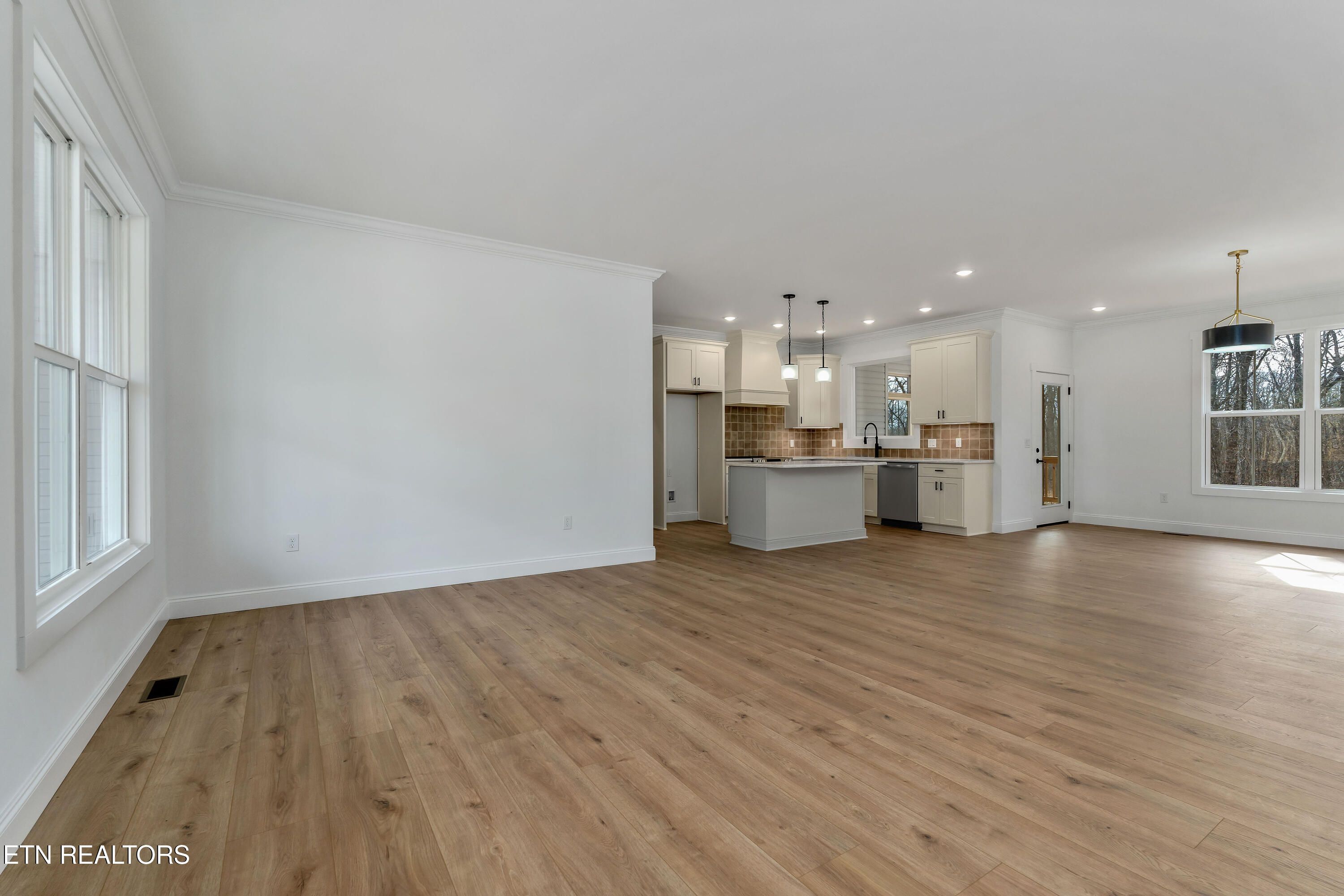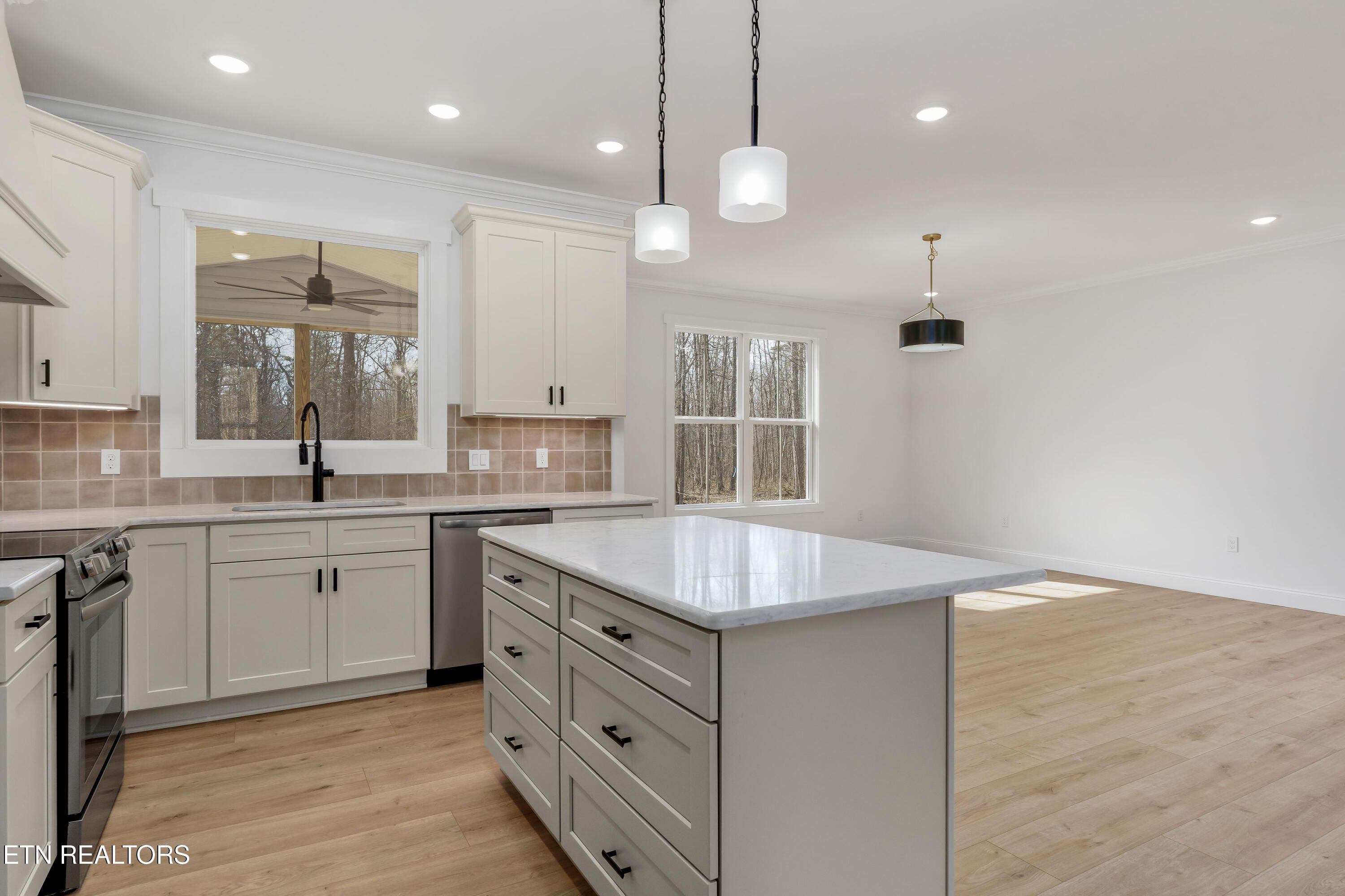 This professionally designed home, situated on a large lot, combines modern elegance with functionality. The open floor plan is complemented by 9-inch wide waterproof plank laminate flooring, providing both durability and a stylish look throughout. The expansive primary suite features a luxurious bath with a tile shower, water closet, and a generous walk-in closet. The kitchen showcases beautiful and elegant composure quartz countertops and a convenient butler's pantry for added storage. With 1,826 square feet of living space, this home also offers an oversized garage and a screened-in porch, perfect for relaxation and entertaining. The exterior boasts sleek grey vinyl siding accented with local Appalachian blue slate stone, adding both modern appeal and natural charm. Two guest bedrooms and a well-appointed bathroom complete the home, offering both comfort and convenience.