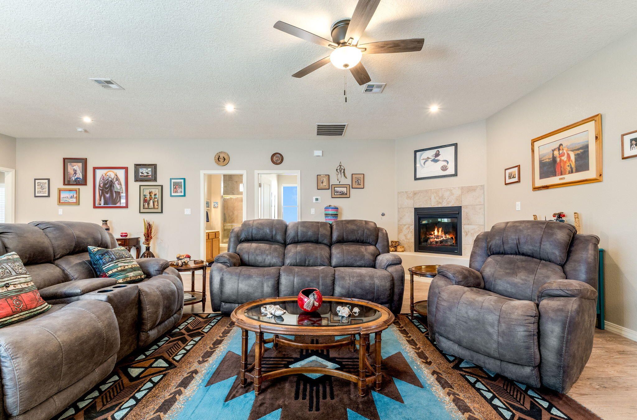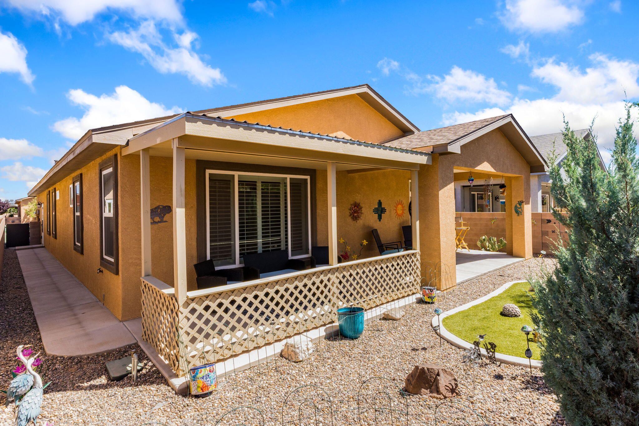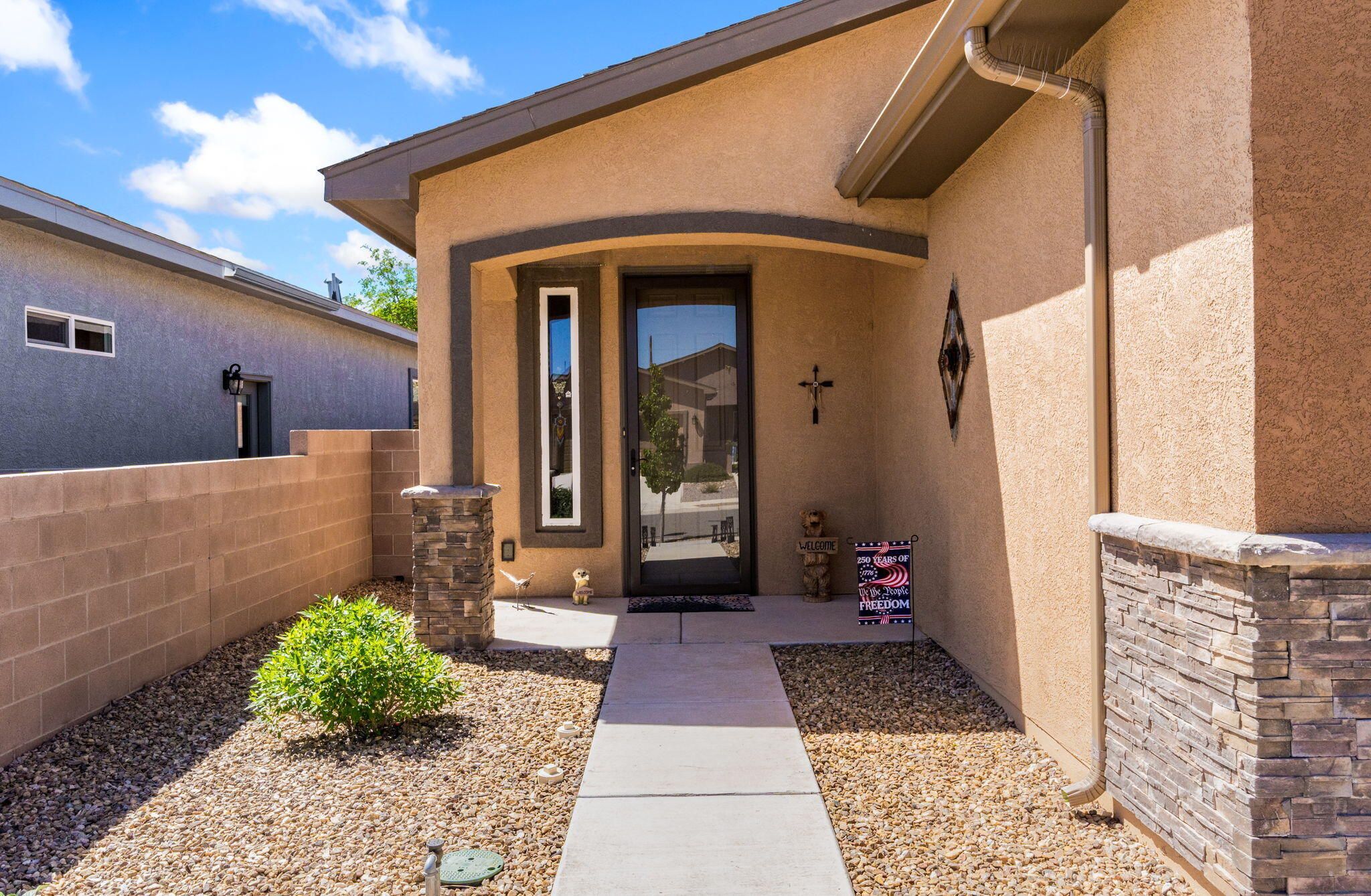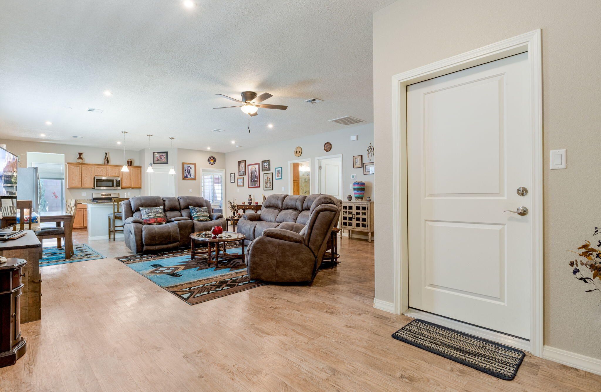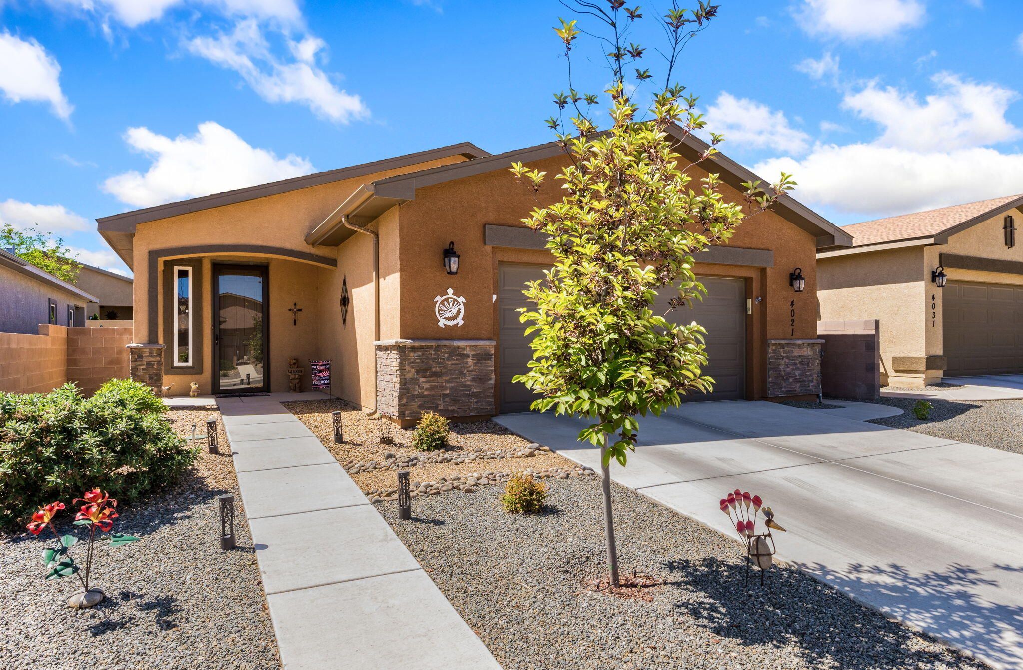 Situated in the desirable Jubilee gated community in Los Lunas, this well-maintained home features inviting curb appeal with beautifully landscaped front and back yards that offer a warm and welcoming outdoor space, paired with a layout designed for comfortable, modern living. The open floorplan creates an easy flow between the living, dining, and kitchen spaces, complemented by recessed lighting, ceiling fans, refrigerated air, and a cozy fireplace. The kitchen features a large island, ample cabinetry, a pantry, and included appliances. The primary suite provides a relaxing retreat with an ensuite bath featuring a double sink vanity, separate shower, and a soaking tub. An oversized garage includes a thoughtfully placed laundry area for added convenience. A perfect place to call home!