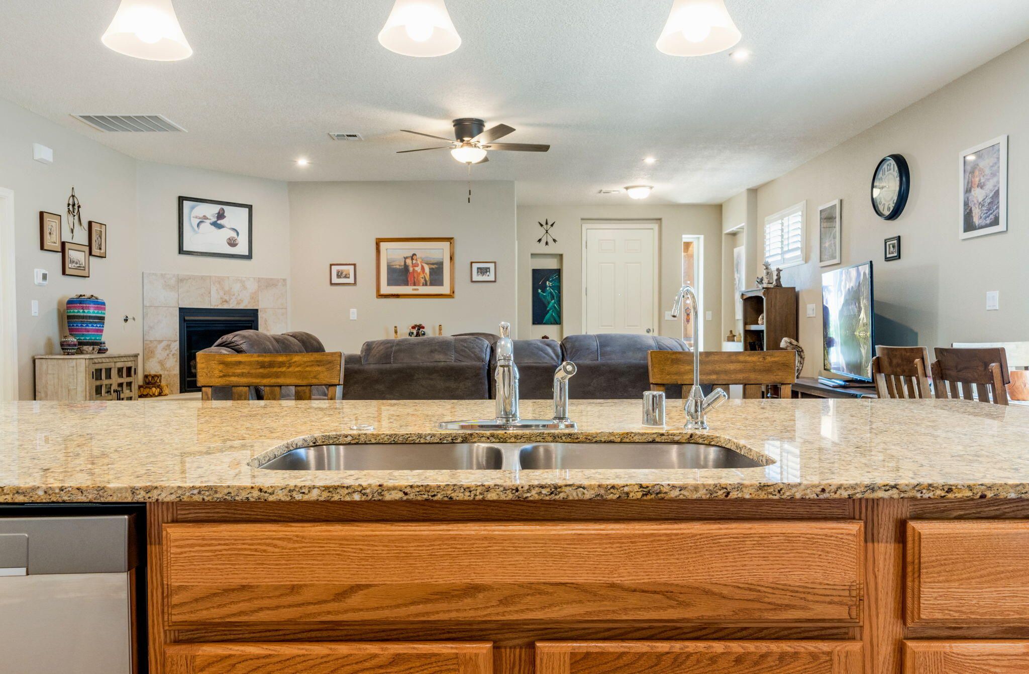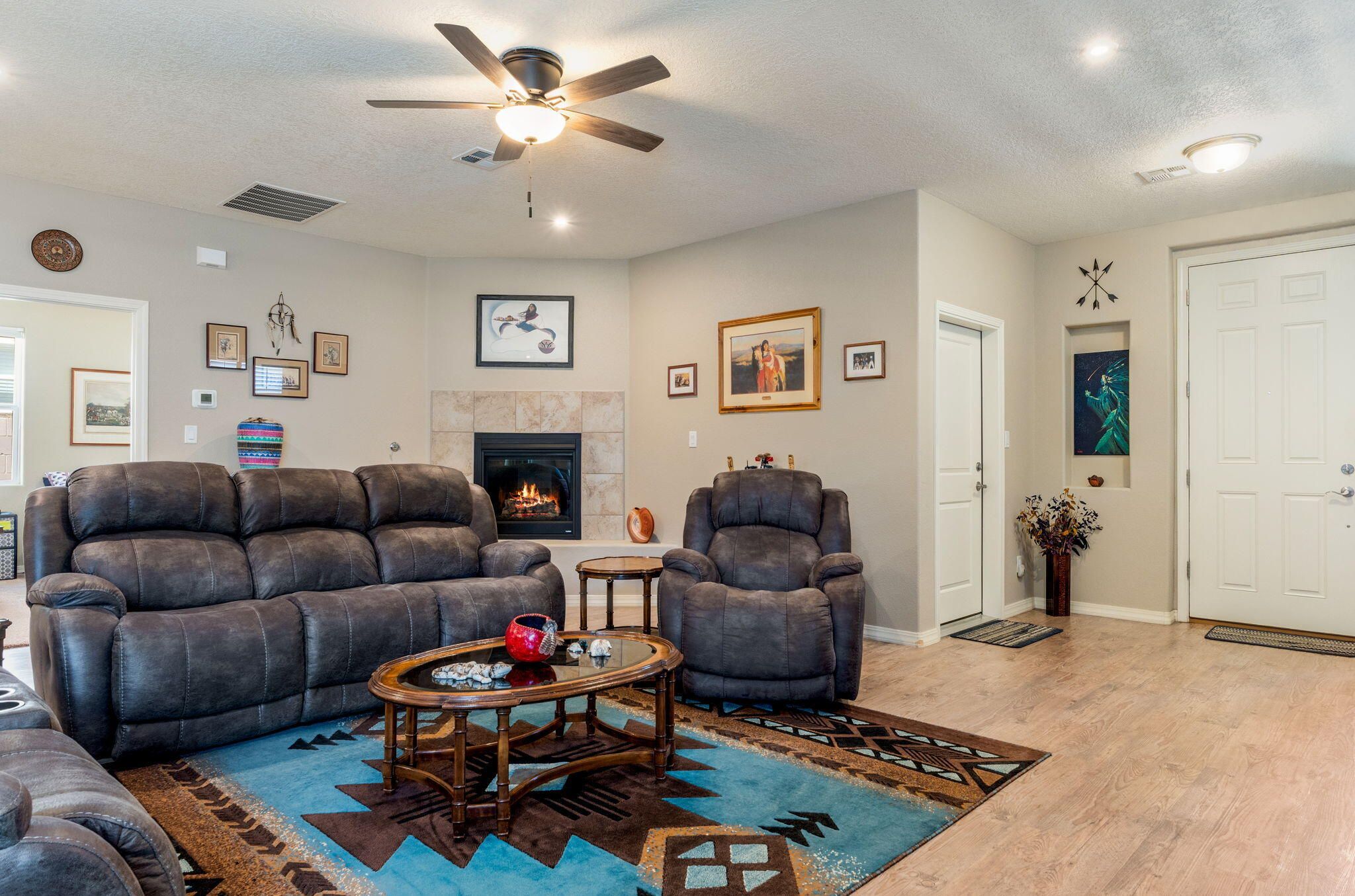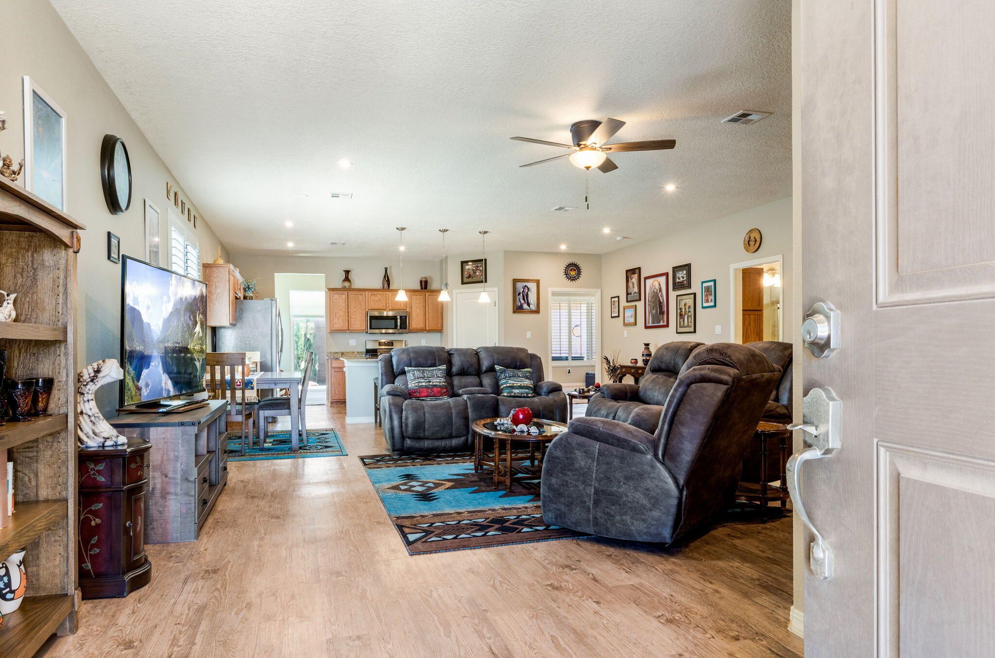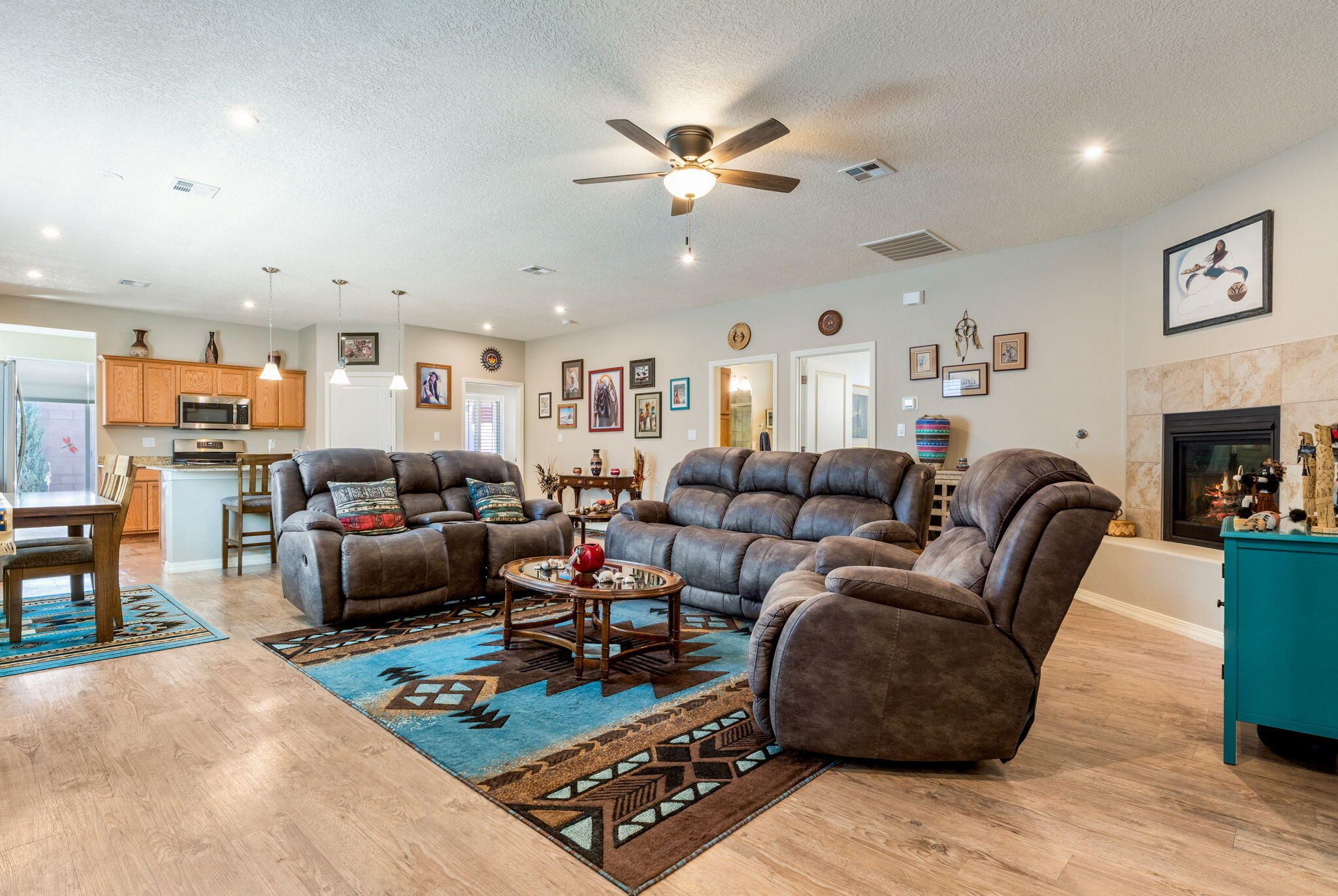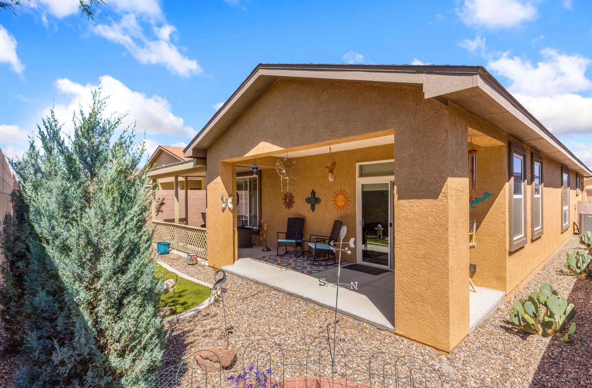 Situated in the desirable Jubilee gated community in Los Lunas, this well-maintained home features inviting curb appeal with beautifully landscaped front and back yards that offer a warm and welcoming outdoor space, paired with a layout designed for comfortable, modern living. The open floorplan creates an easy flow between the living, dining, and kitchen spaces, complemented by recessed lighting, ceiling fans, refrigerated air, and a cozy fireplace. The kitchen features a large island, ample cabinetry, a pantry, and included appliances. The primary suite provides a relaxing retreat with an ensuite bath featuring a double sink vanity, separate shower, and a soaking tub. An oversized garage includes a thoughtfully placed laundry area for added convenience. A perfect place to call home!