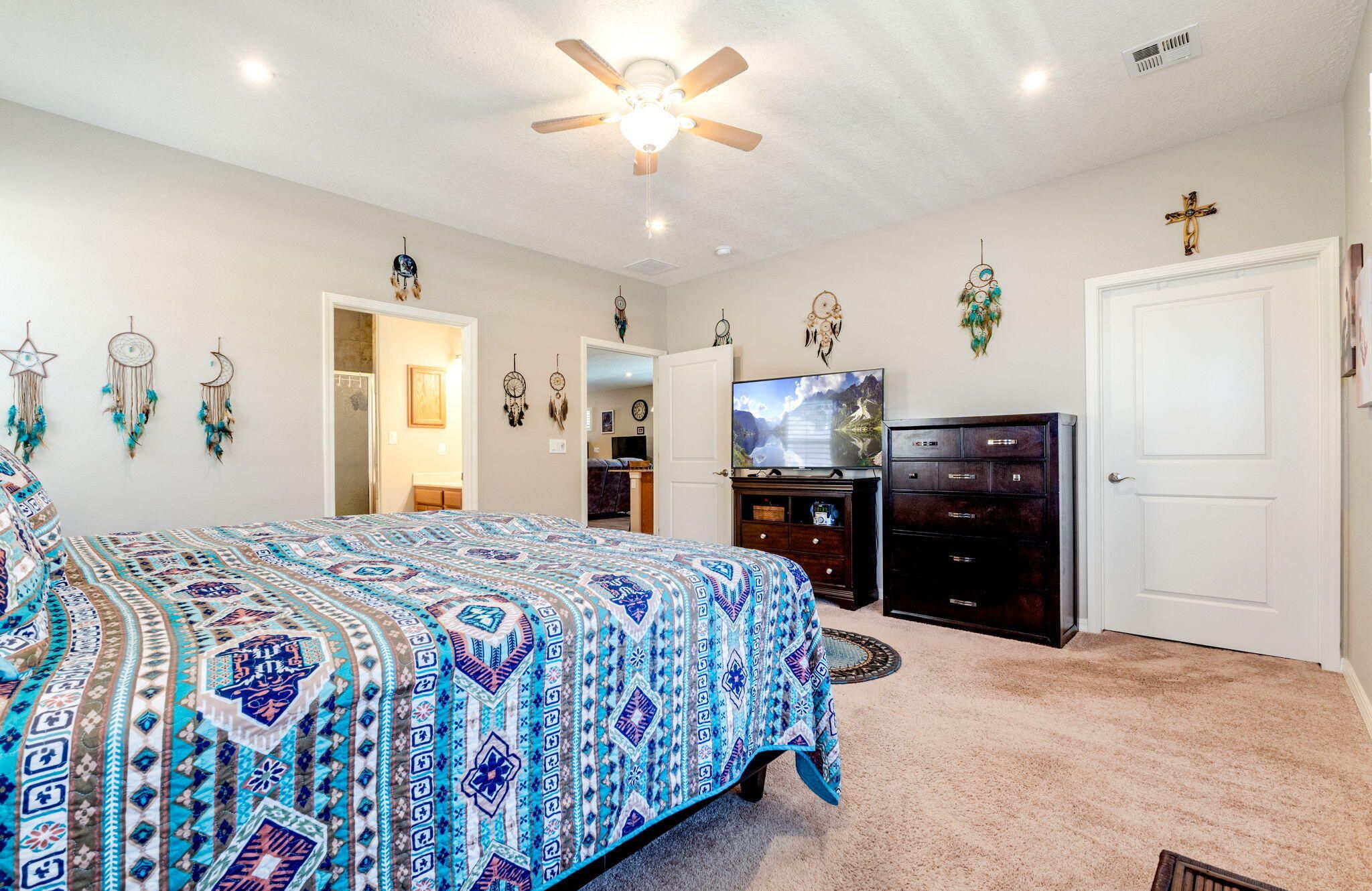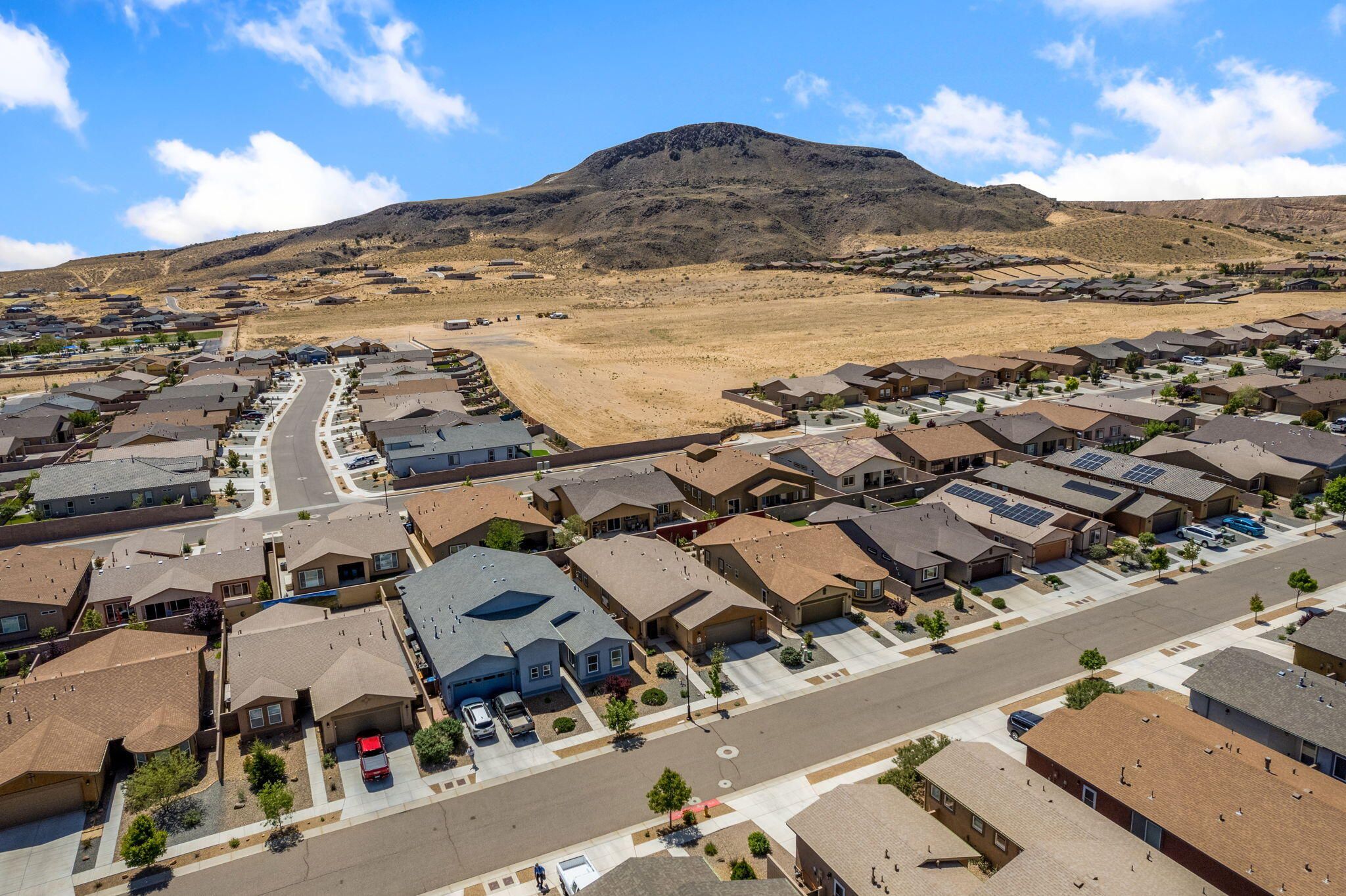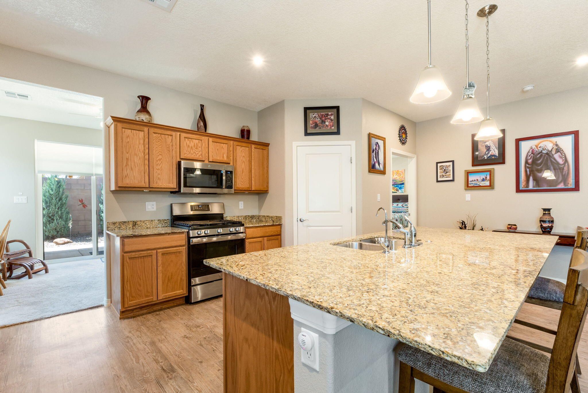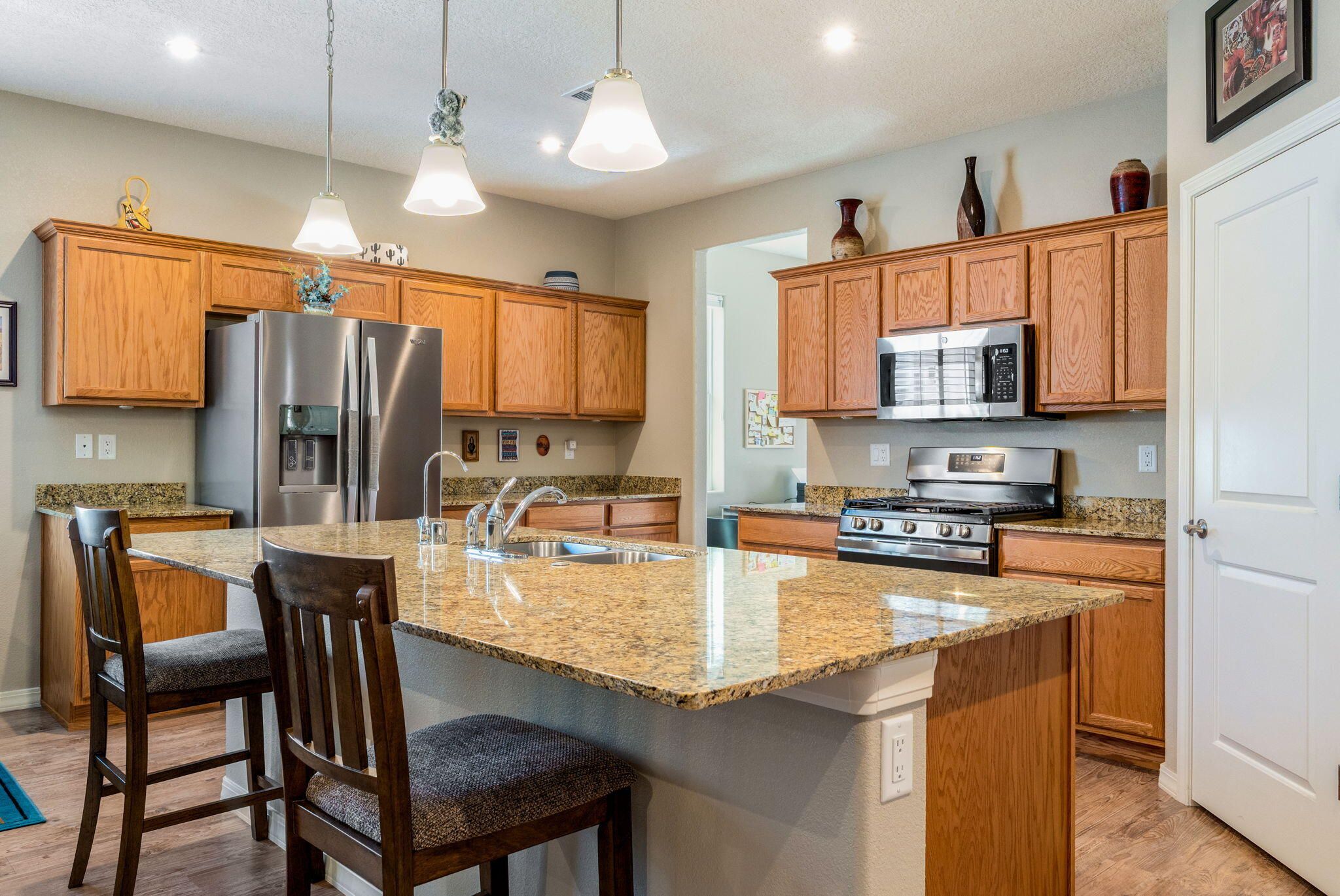 Situated in the desirable Jubilee gated community in Los Lunas, this well-maintained home features inviting curb appeal with beautifully landscaped front and back yards that offer a warm and welcoming outdoor space, paired with a layout designed for comfortable, modern living. The open floorplan creates an easy flow between the living, dining, and kitchen spaces, complemented by recessed lighting, ceiling fans, refrigerated air, and a cozy fireplace. The kitchen features a large island, ample cabinetry, a pantry, and included appliances. The primary suite provides a relaxing retreat with an ensuite bath featuring a double sink vanity, separate shower, and a soaking tub. An oversized garage includes a thoughtfully placed laundry area for added convenience. A perfect place to call home!