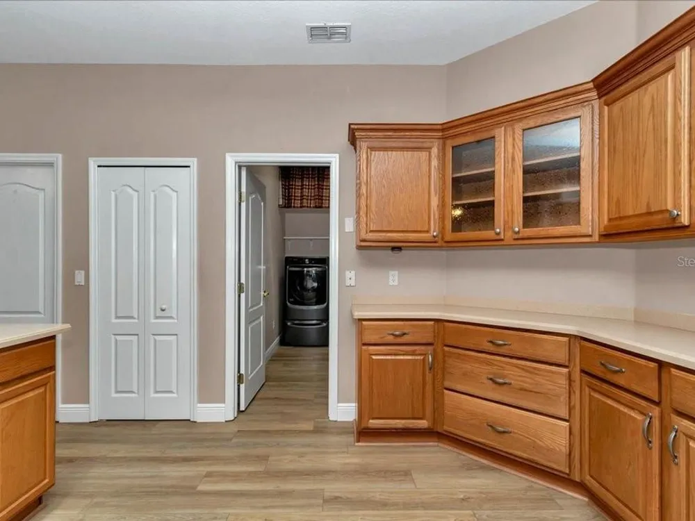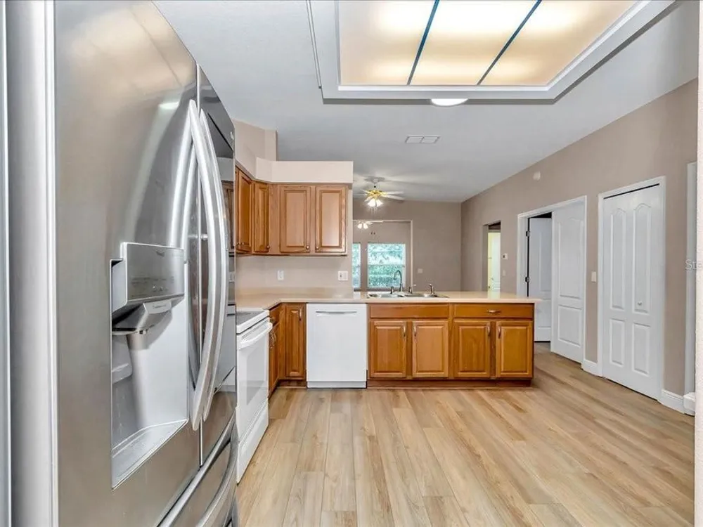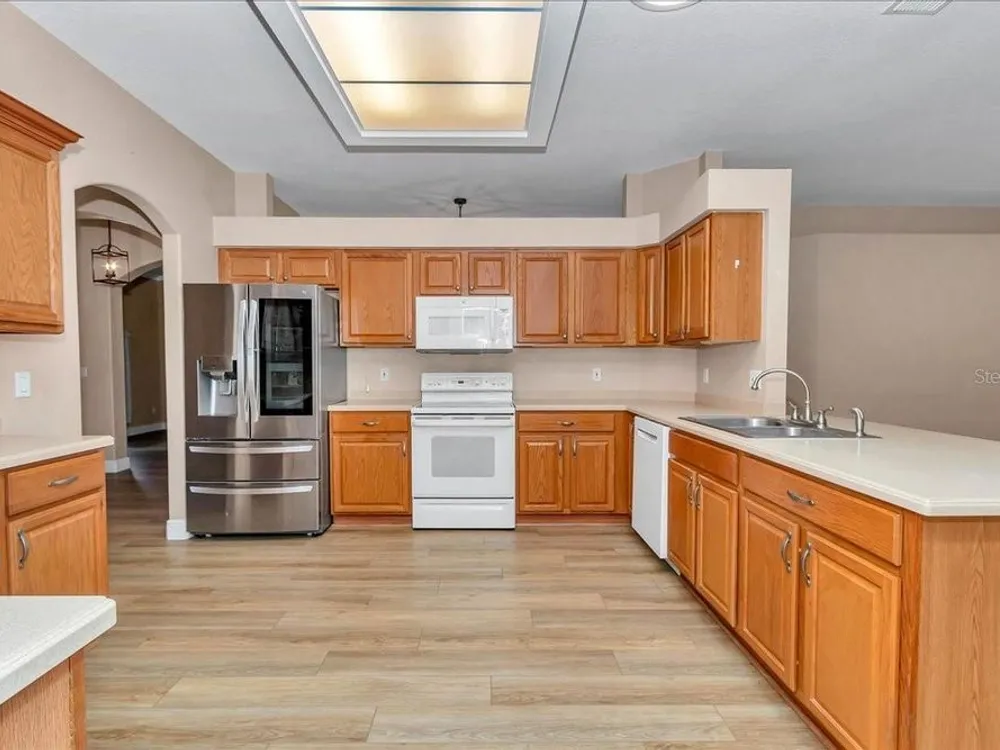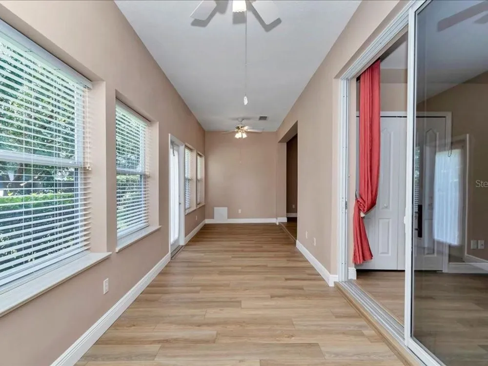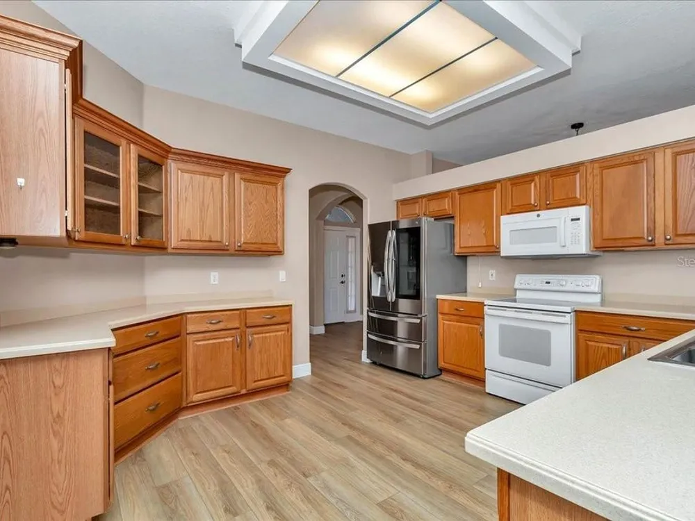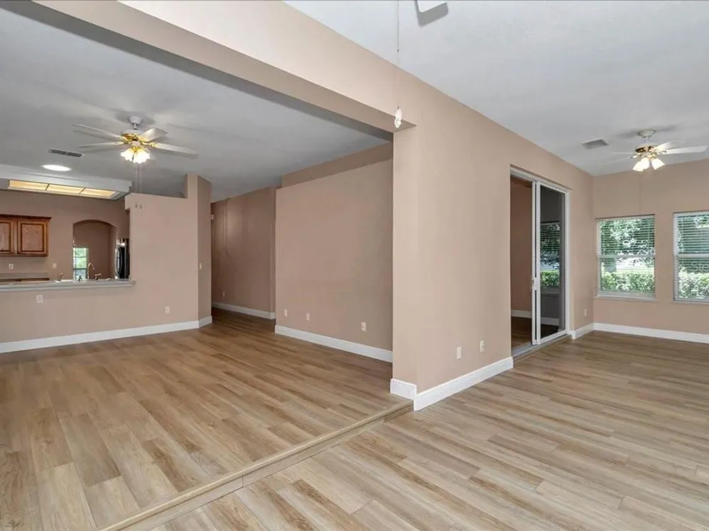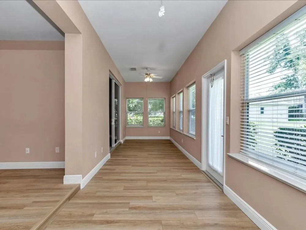 Welcome to the highly sought-after 55+ Kings Ridge golf community! This well-maintained 2-bedroom, 2-bath home features a versatile den, formal dining room, and an enclosed Florida room—perfect for year-round enjoyment. You'll love the new floors installed in 2024, and the kitchen offers extra cabinetry and extended countertops for added functionality. Situated on one of the larger lots in the neighborhood, the expansive yard provides added privacy and room to relax outdoors. The open floorplan offers natural light and flexible living areas to suit your lifestyle. Located in a guard-gated community with resort-style amenities, including golf courses, clubhouse, pools, pickleball, and dozens of social clubs—plus convenient golf cart access to shopping and dining. Don’t miss this rare opportunity in Kings Ridge!