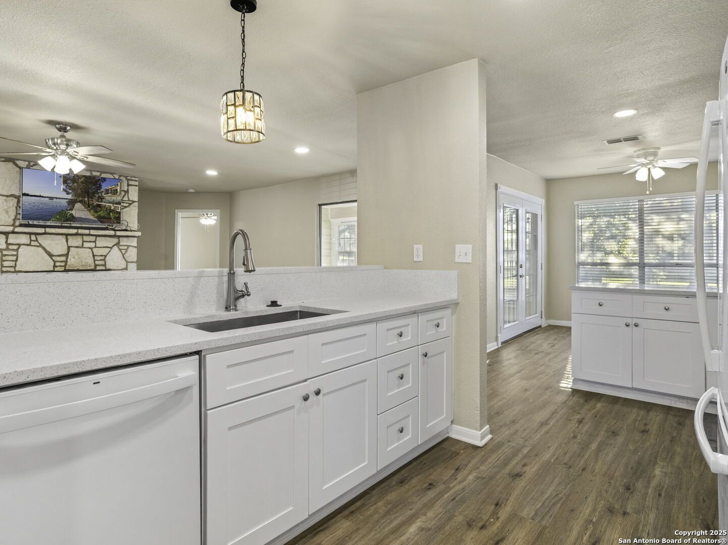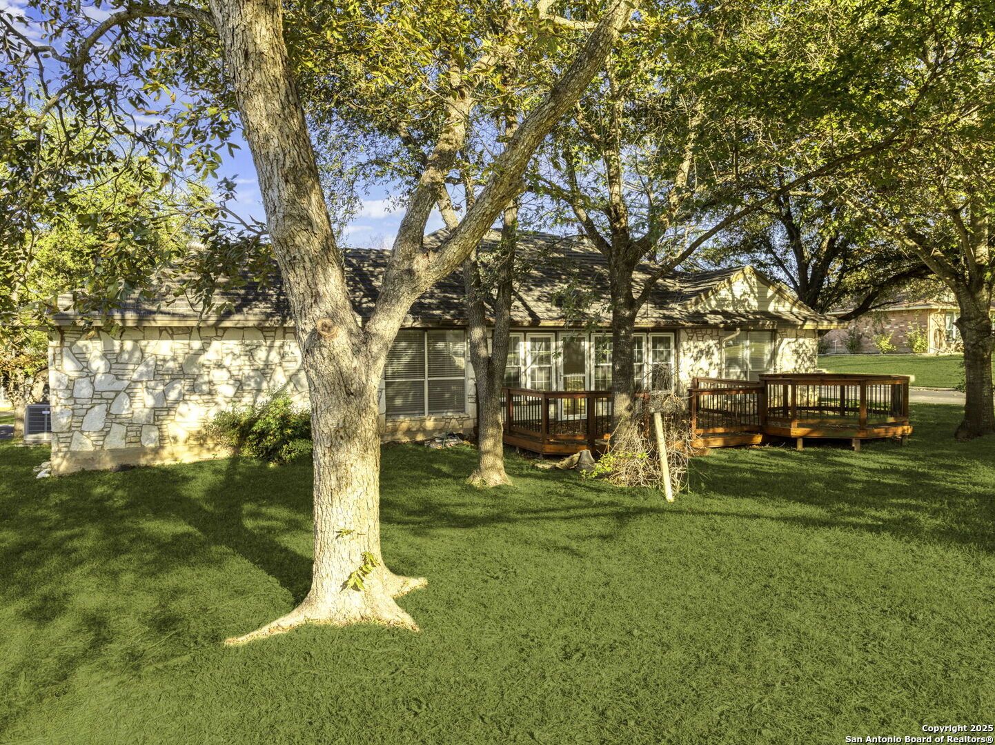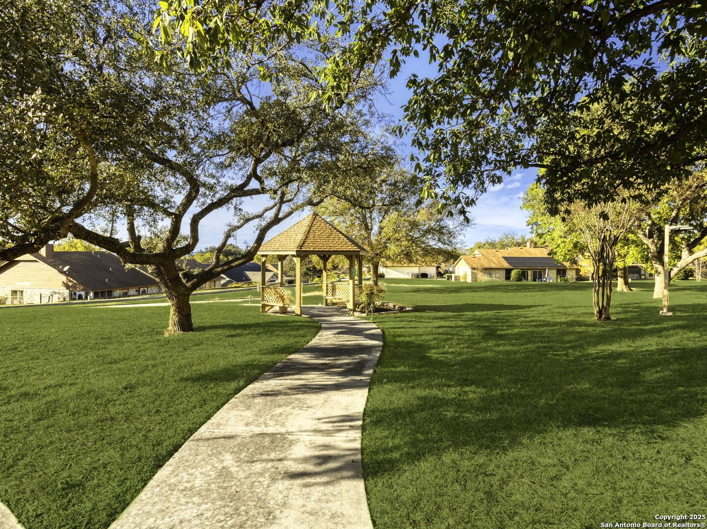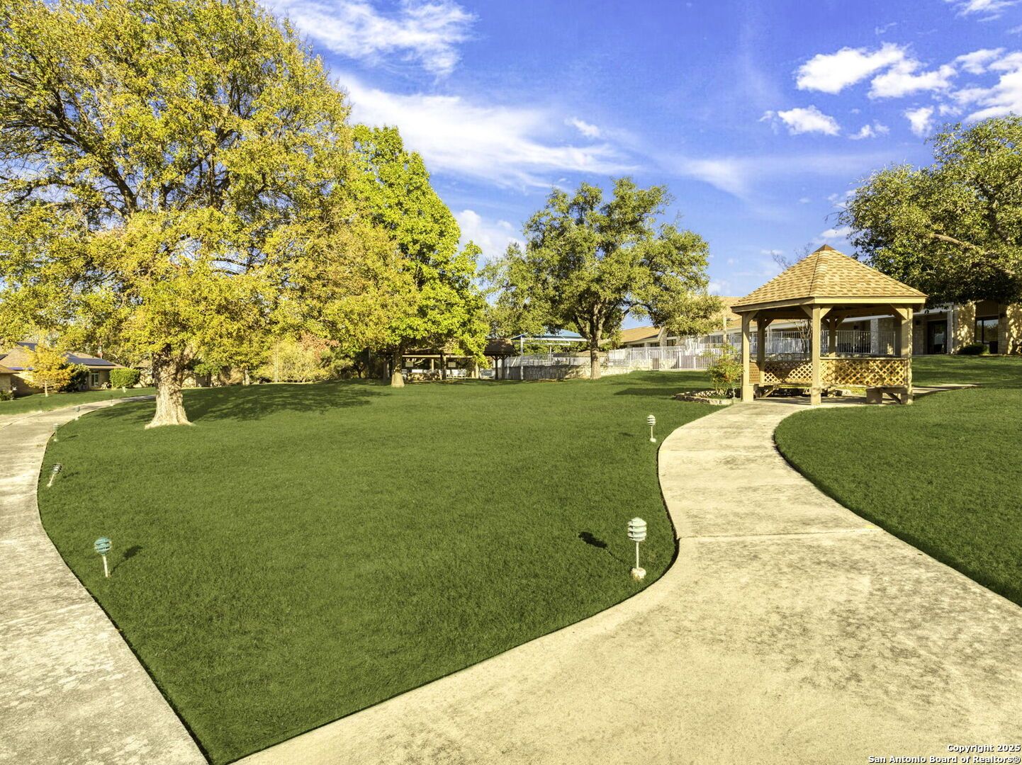 PRICE REDUCTION!!! Nestled in a 55+ community, this lovely home2/1.5/1 has been totally rehabbed and is situated in an oversized corner lot. Step inside, you'll find a warm, inviting living room that flows effortlessly into the dining area, making it perfect for hosting family and friends. The kitchen is beautifully finished with quartz countertops and new cabinets. Relax in the sunroom or right outside on the desk. The community amenities include a swimming pool, fitness center, walking trails, game rooms, craft room, pool room, library and secure, gated access. Refrigerator, washer, dryer and TV over the fireplace convey. Close to shopping centers and Randolph AFB. Perfect if you're down-sizing! THIS IS AN ASSUMABLE VA LOAN - 2.75.