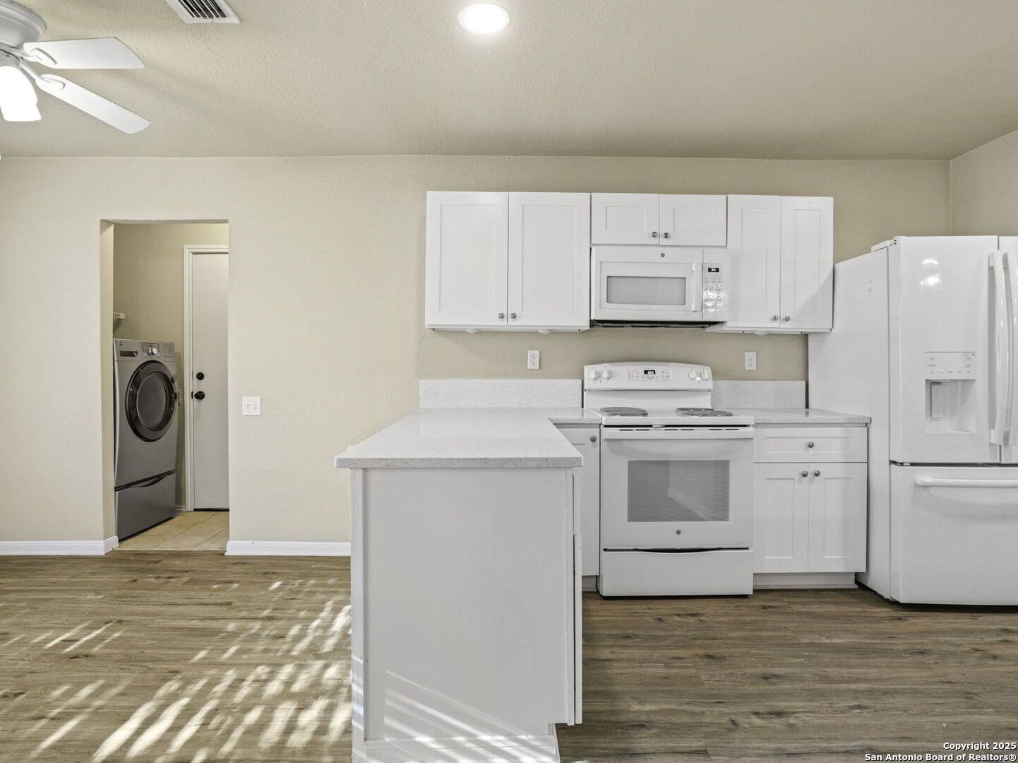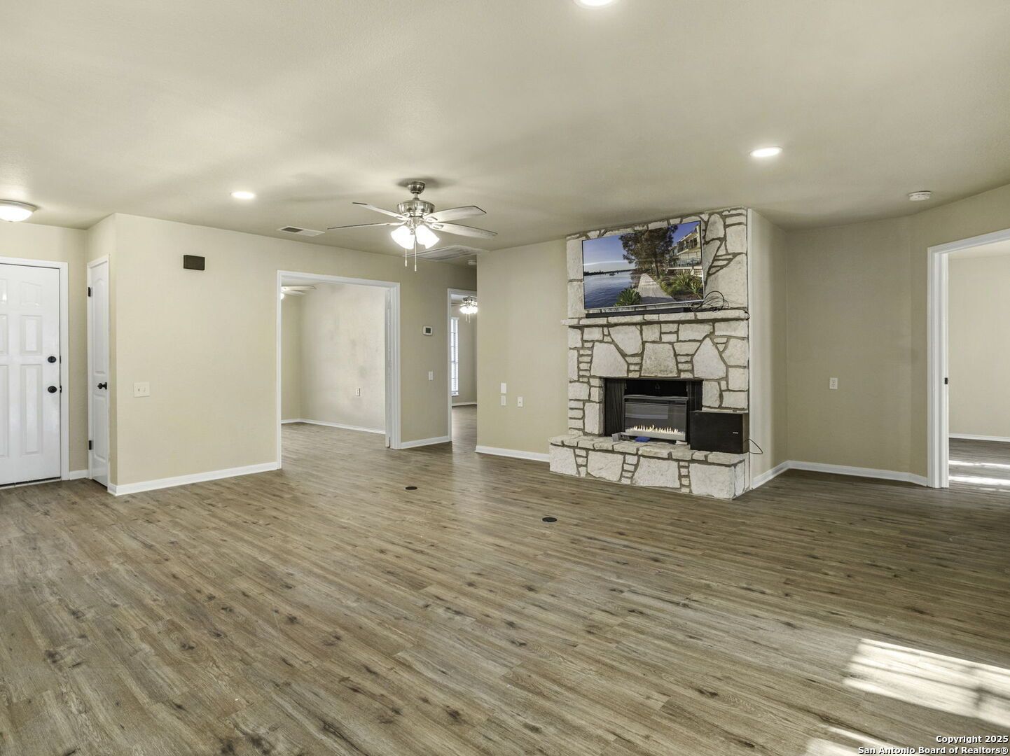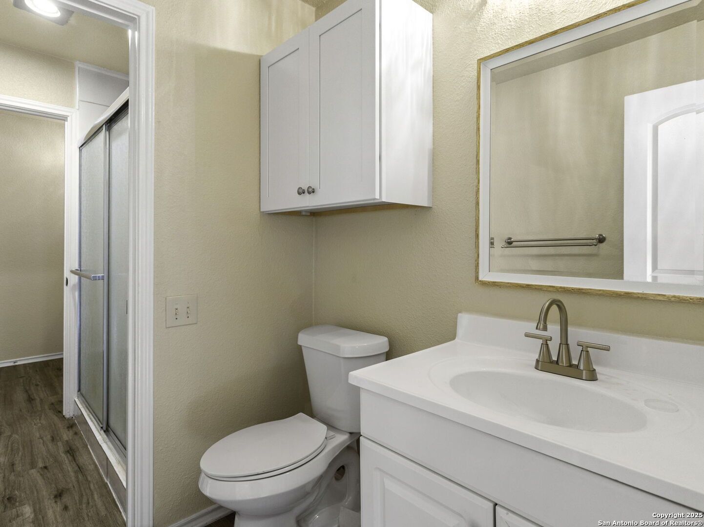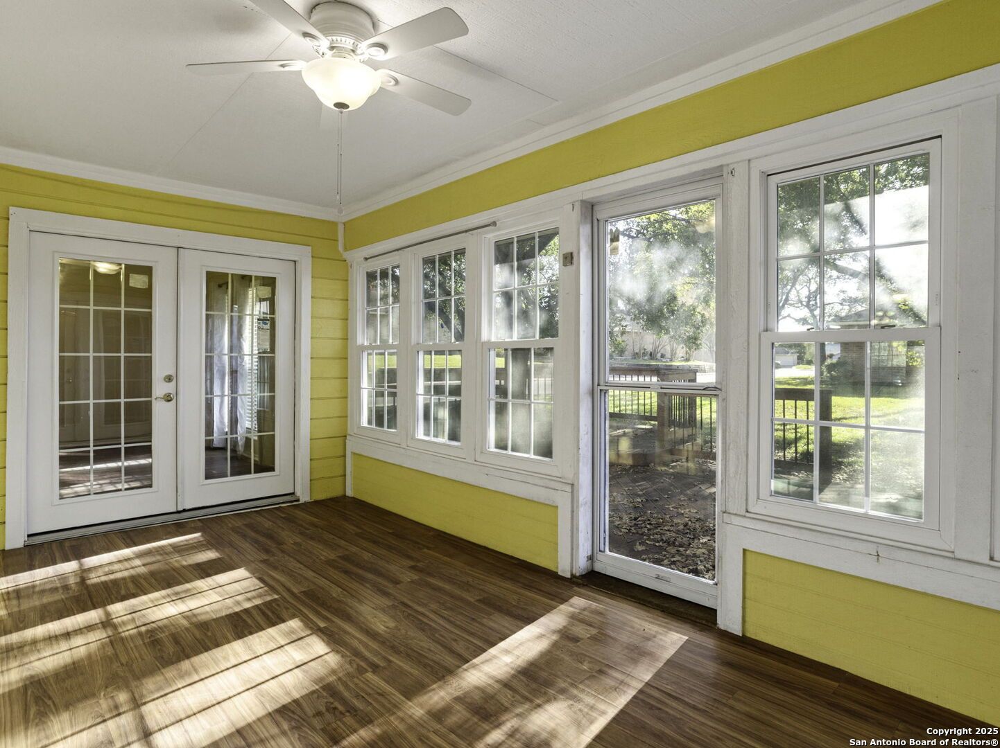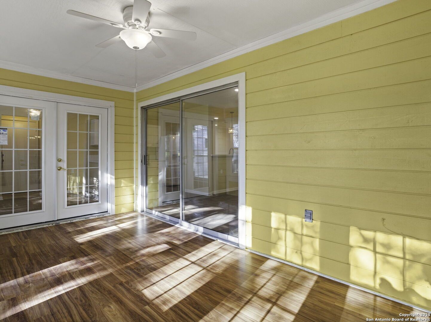 PRICE REDUCTION!!! Nestled in a 55+ community, this lovely home2/1.5/1 has been totally rehabbed and is situated in an oversized corner lot. Step inside, you'll find a warm, inviting living room that flows effortlessly into the dining area, making it perfect for hosting family and friends. The kitchen is beautifully finished with quartz countertops and new cabinets. Relax in the sunroom or right outside on the desk. The community amenities include a swimming pool, fitness center, walking trails, game rooms, craft room, pool room, library and secure, gated access. Refrigerator, washer, dryer and TV over the fireplace convey. Close to shopping centers and Randolph AFB. Perfect if you're down-sizing! THIS IS AN ASSUMABLE VA LOAN - 2.75.