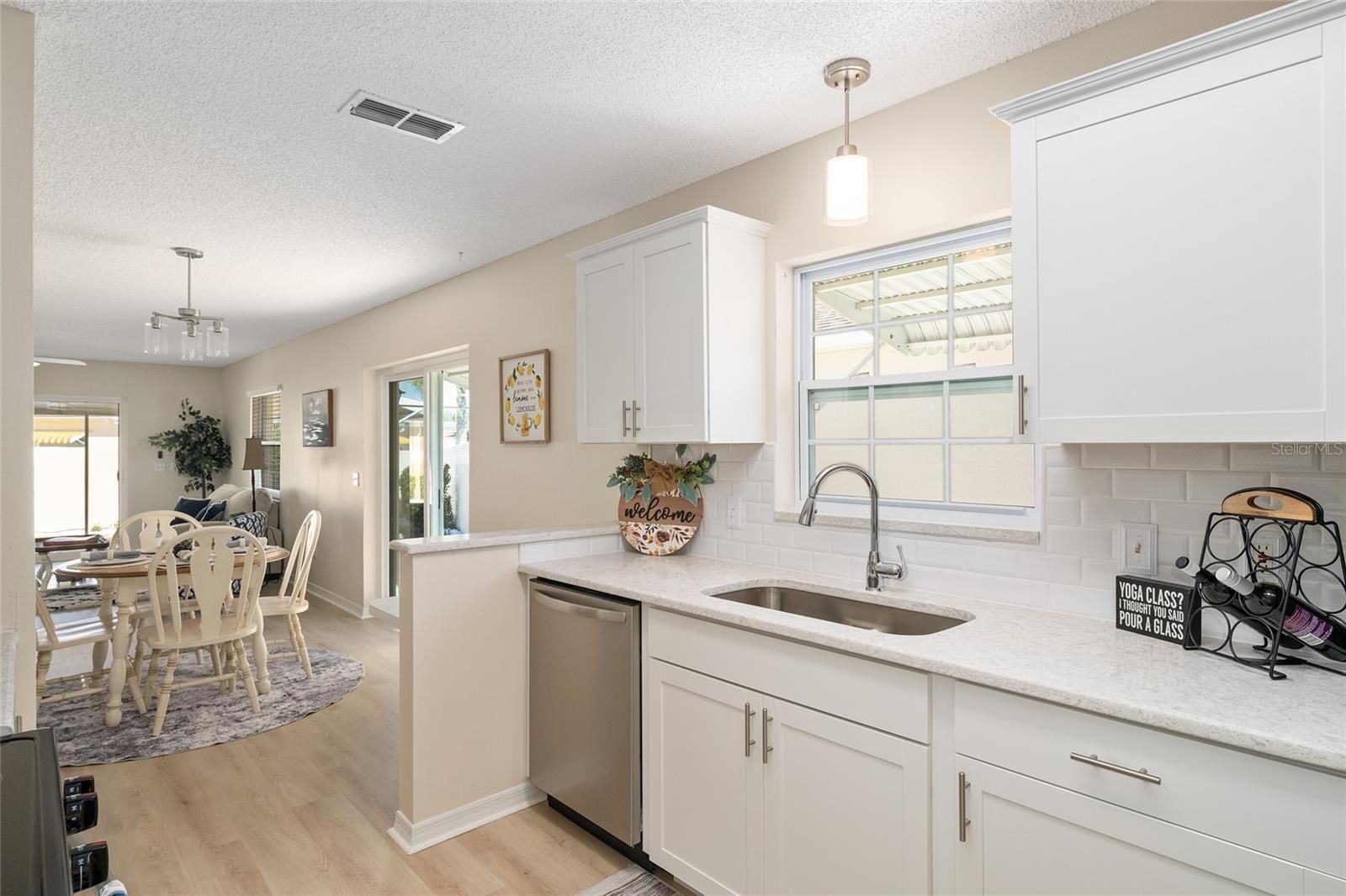 NO BOND! BEAUTIFULLY UPDATED, low-maintenance BLOCK & STUCCO 2-bedroom, 2-bath BAJA COURTYARD VILLA located in the desirable De La Vista South Villas. This charming villa offers an ideal blend of comfort, privacy, and convenience, perfect for seasonal living, full-time residency, or investment. Step inside the bright OPEN FLOOR PLAN and you’ll immediately notice the LVP flooring flowing throughout the main living area and kitchen. Freshly painted neutral walls that create a clean, move-in-ready feel. The UPDATED kitchen boasts white cabinets, GRANITE countertops, TILED backsplash, NEW SS appliances, and a pantry, providing both style and efficiency. The guest bedroom includes a built-in closet and is conveniently located next to a hall closet and the UPDATED guest bathroom featuring a NEW vanity, TILE floors, and a tub/shower combo. The primary bedroom features a walk-in closet, an UPDATED en-suite bathroom featuring TILE floors, a walk-in shower, and a NEW vanity. Just off the living room, the LIGHT & BRIGHT, TILED FLORIDA ROOM provides valuable bonus space—ideal for a den, office, hobby room, or relaxation area. Step outside to the very LARGE, private, low-maintenance courtyard, offering ample space for entertaining, grilling, gardening, or simply enjoying Florida’s beautiful weather. Additional features include: HWH (2025), HVAC (2025), Windows (2011), NEW slider doors inside, NEW light fixtures & fans, and freshly painted garage floor. This villa is centrally located near everything The Villages is known for! You’re less than three miles from the hospital and numerous medical facilities, and just minutes from popular amenities such as Hacienda Hills Golf Club, Tierra del Sol Golf & Country Club, La Hacienda Regional Recreation Center, Chula Vista Recreation Center, Rio Grande Family Pool, and the US Hwy 441 Medical/Commercial Corridor. Enjoy quick access to shopping, dining, medical services, and recreation—all just steps or a short cart ride away. Best of all, you’re only a 10-minute golf cart ride to Lake Sumter Landing or Spanish Springs Town Square, making this an unbeatable location for entertainment and convenience. Don’t miss this opportunity—schedule your private showing today!