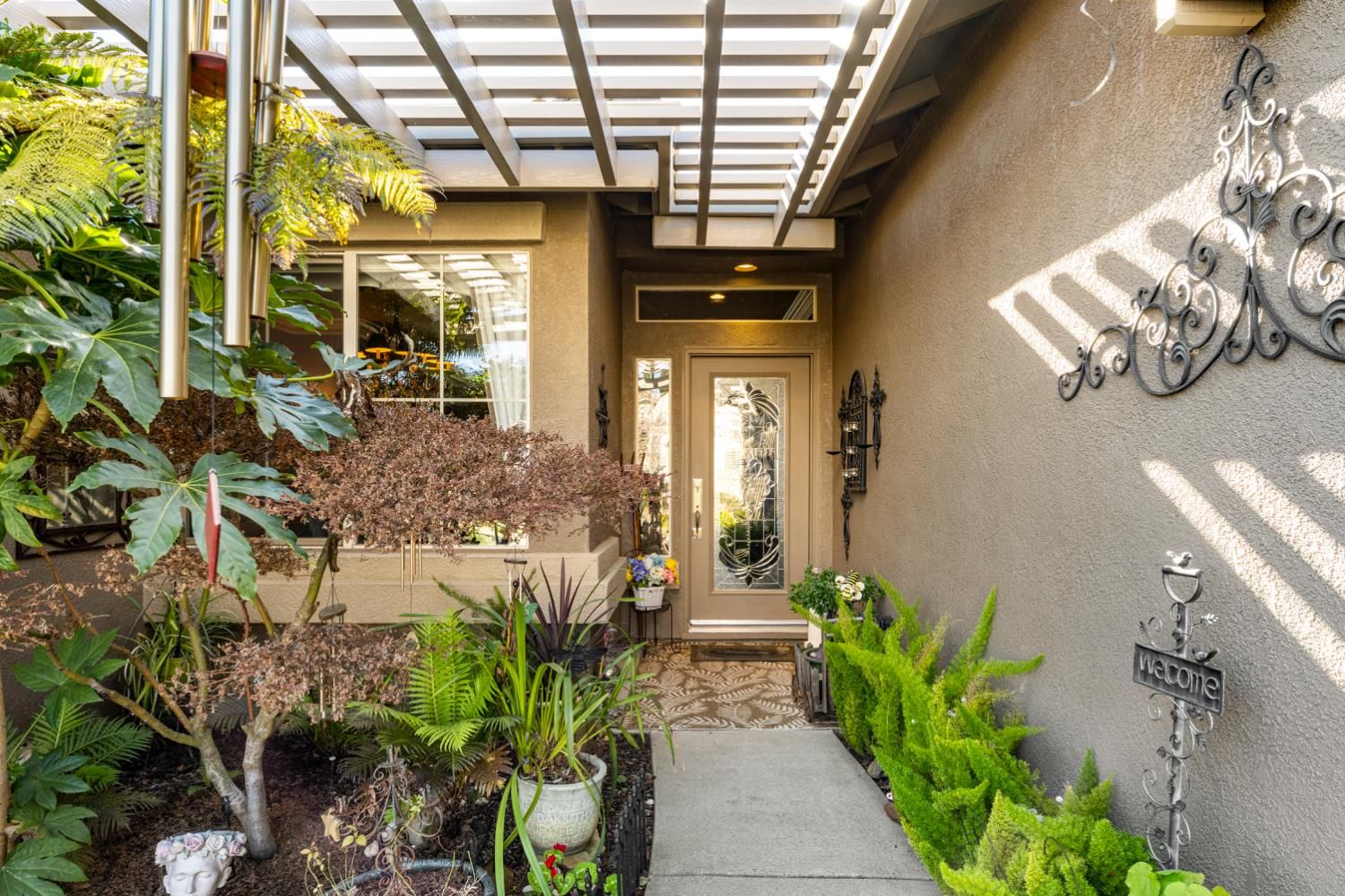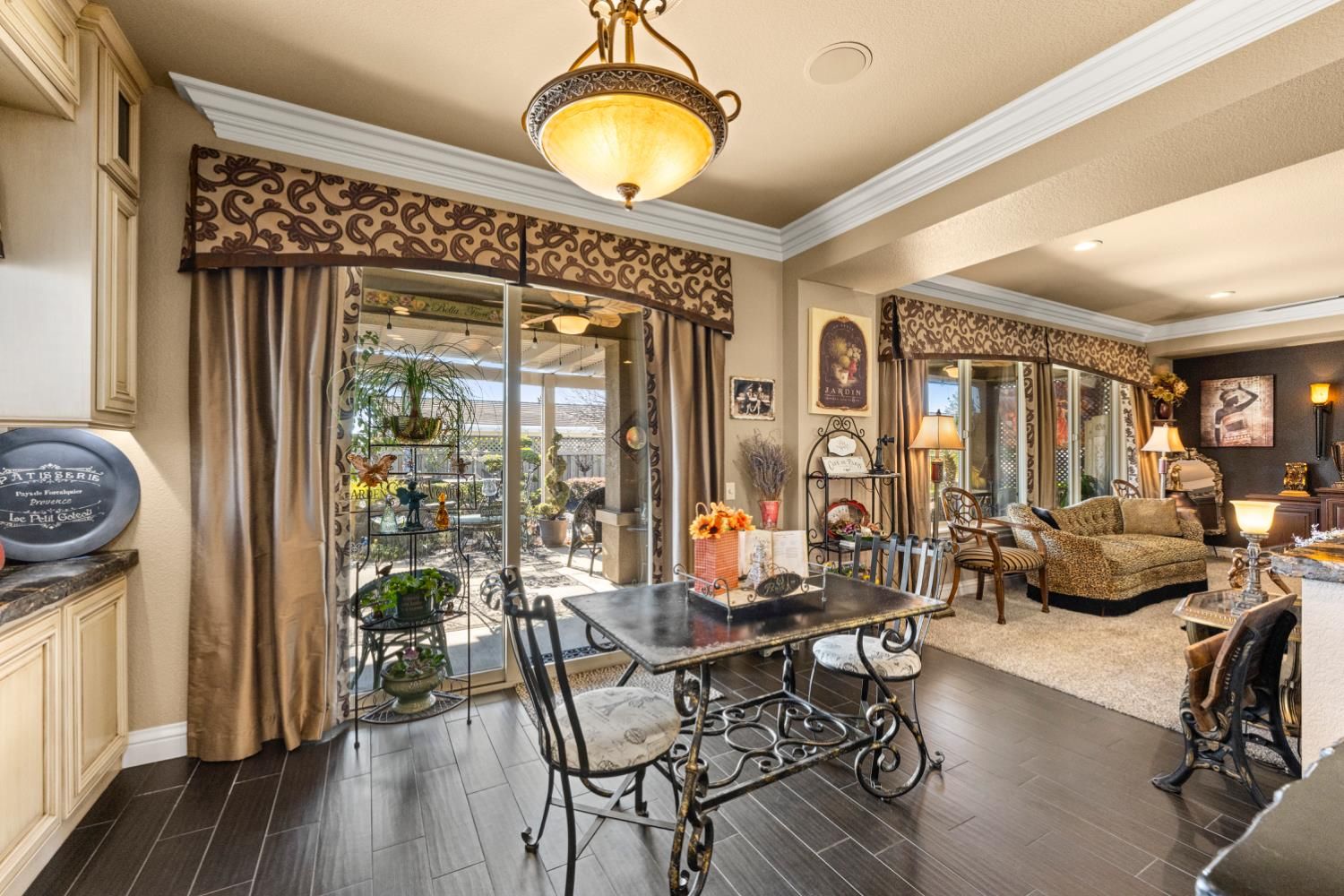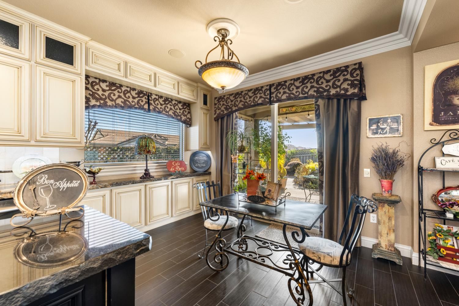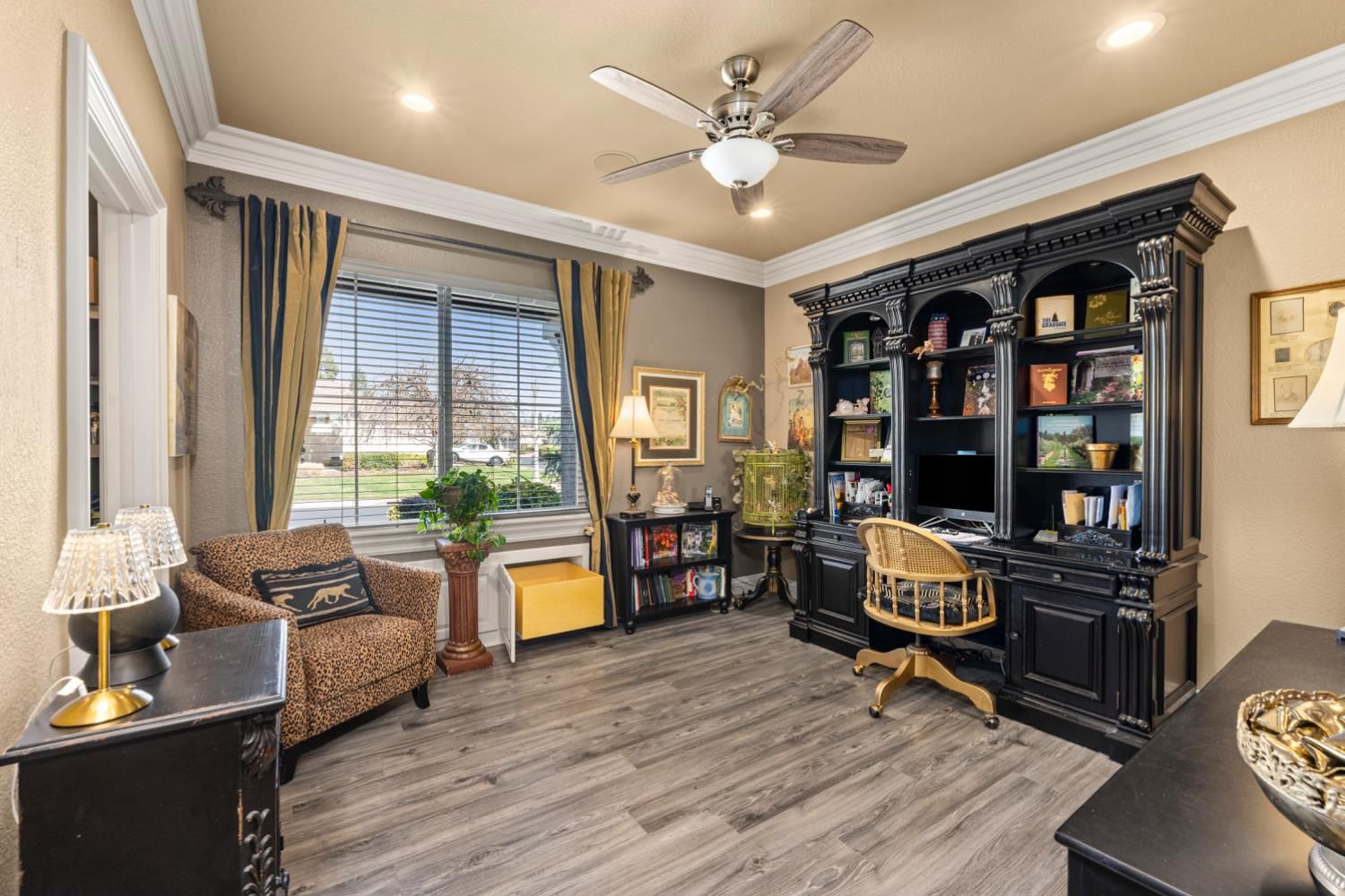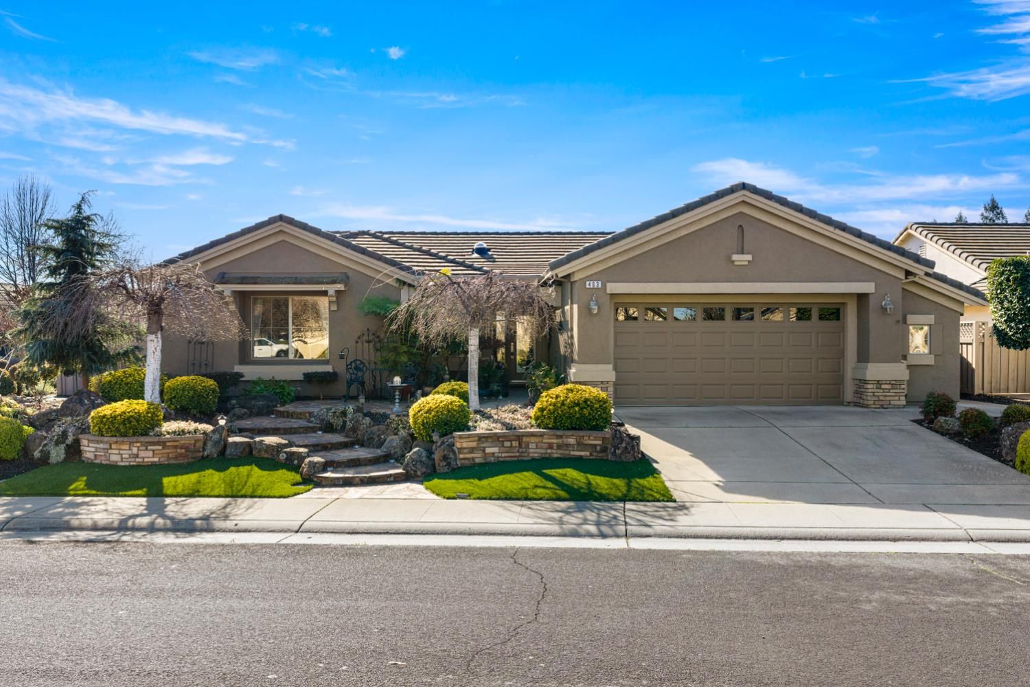 Located in a small cul-de-sac, this unique home is full of custom designed upgrades and features. From the custom cabinetry throughout the entire home, to light fixtures, to window coverings, tile plank flooring, triple crown molding, triple granite counter tops and custom designer paint in each room, this home stands out as one-of-a-kind making it a true dream home. Surround sound is featured indoors as well as the back patio area. The front, back & side gardens have been professionally landscaped with specimen trees, shrubs and flowering plants which add to the rare beauty of this very special home. An extended awning over the back patio gives shade and comfort for great outdoor entertaining. A short stroll via the walking/golfcart path to Safeway, CVS,Starbucks, eateries, and many more shops and services.