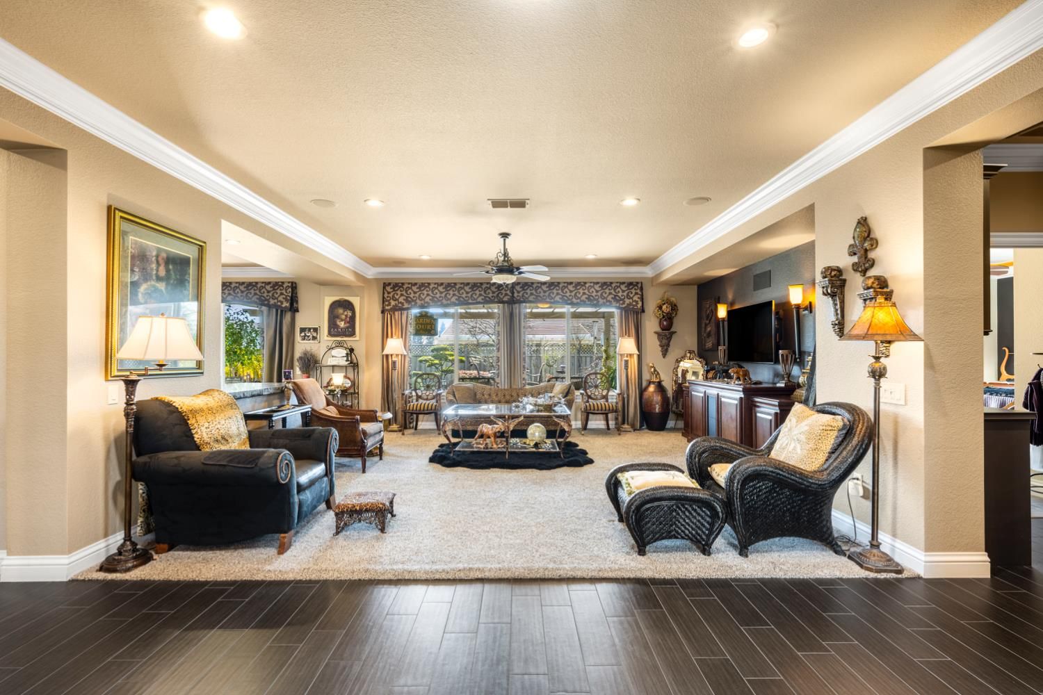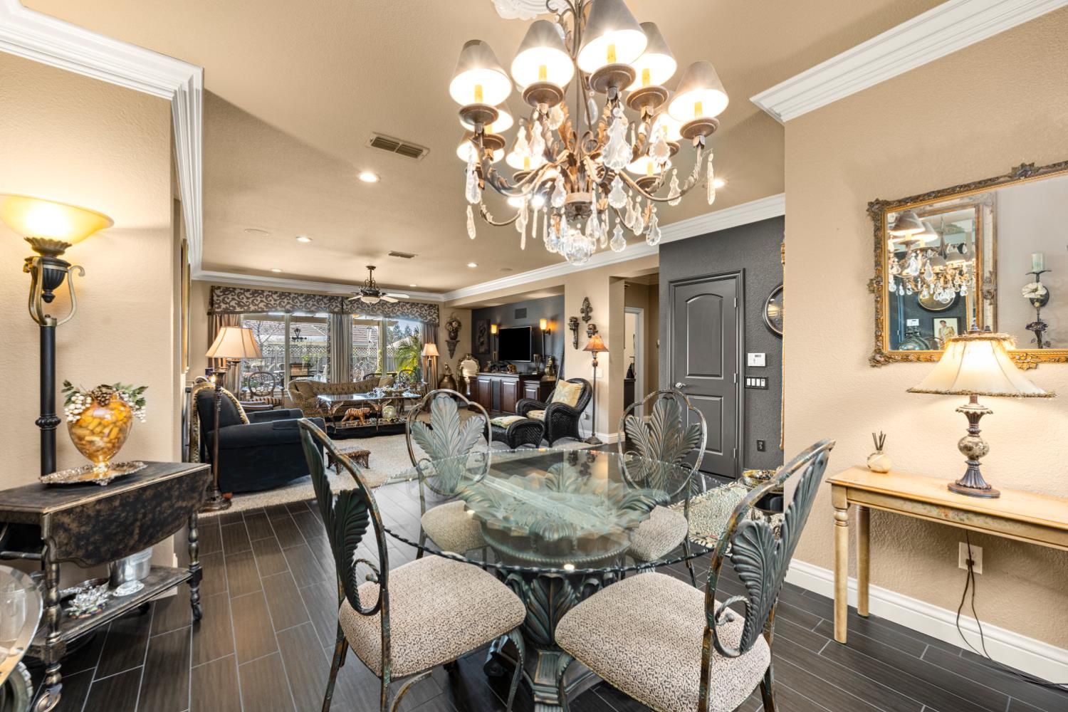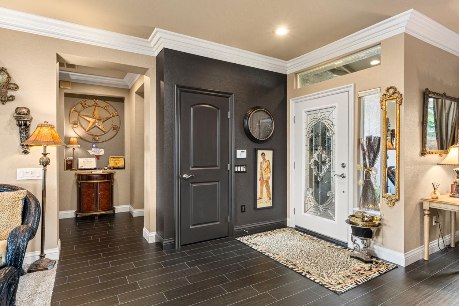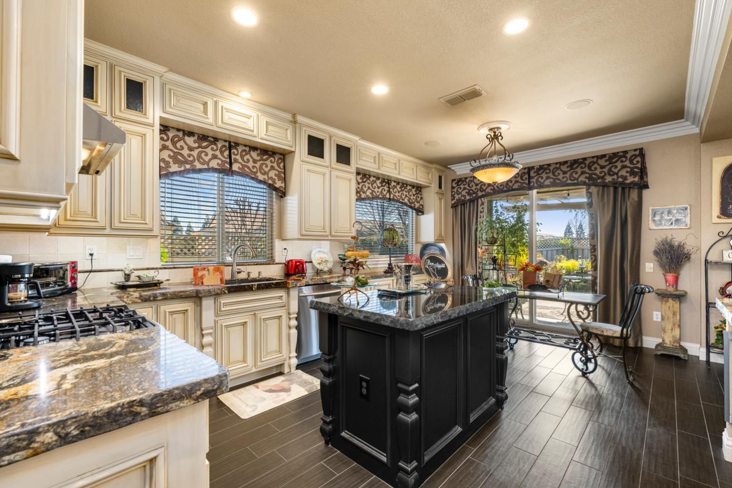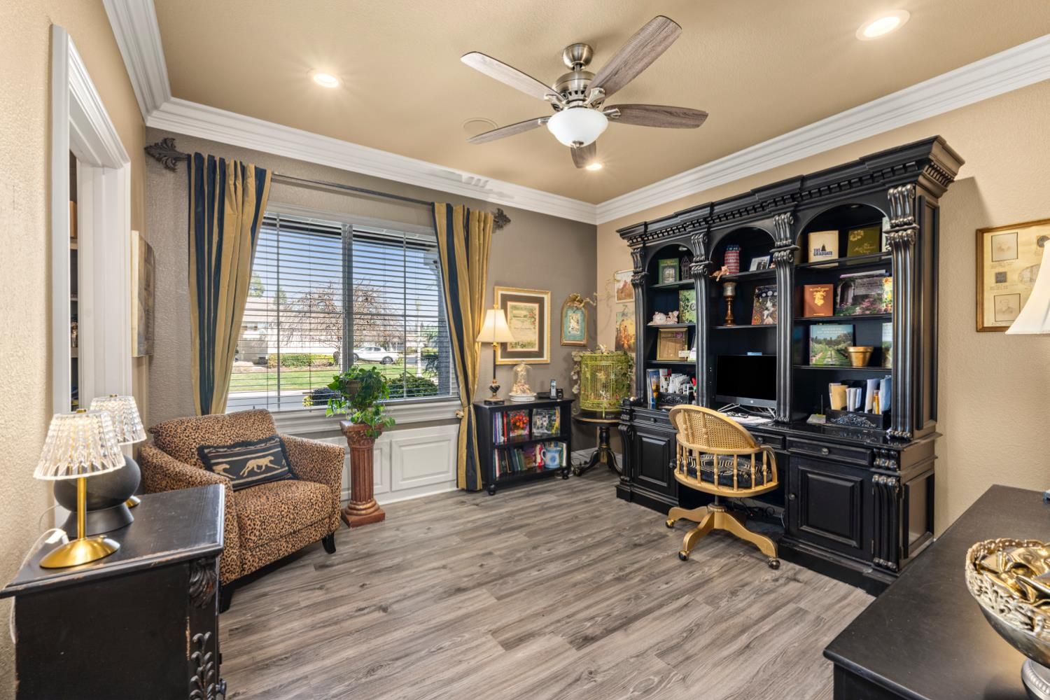 Located in a small cul-de-sac, this unique home is full of custom designed upgrades and features. From the custom cabinetry throughout the entire home, to light fixtures, to window coverings, tile plank flooring, triple crown molding, triple granite counter tops and custom designer paint in each room, this home stands out as one-of-a-kind making it a true dream home. Surround sound is featured indoors as well as the back patio area. The front, back & side gardens have been professionally landscaped with specimen trees, shrubs and flowering plants which add to the rare beauty of this very special home. An extended awning over the back patio gives shade and comfort for great outdoor entertaining. A short stroll via the walking/golfcart path to Safeway, CVS,Starbucks, eateries, and many more shops and services.