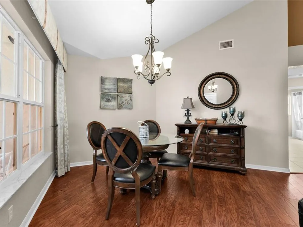 - Eat-in Kitchen, High Ceilings, Living/Dining Room, Main Level Primary, Split Bedrooms, Stone Counters, Thermostat, Walk-In Closet(s), Window Treatments