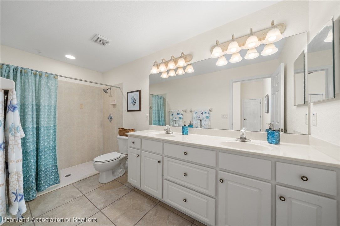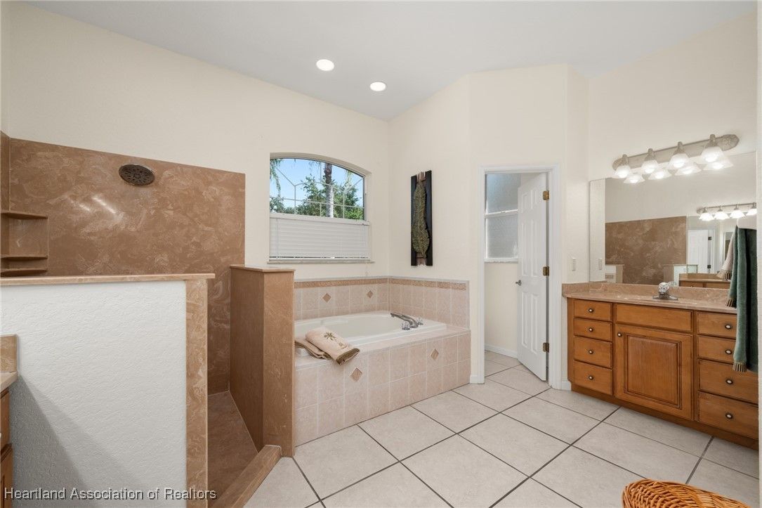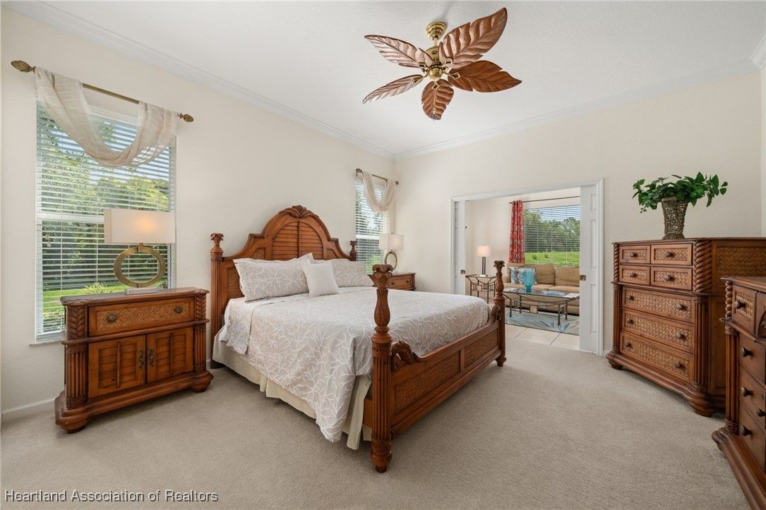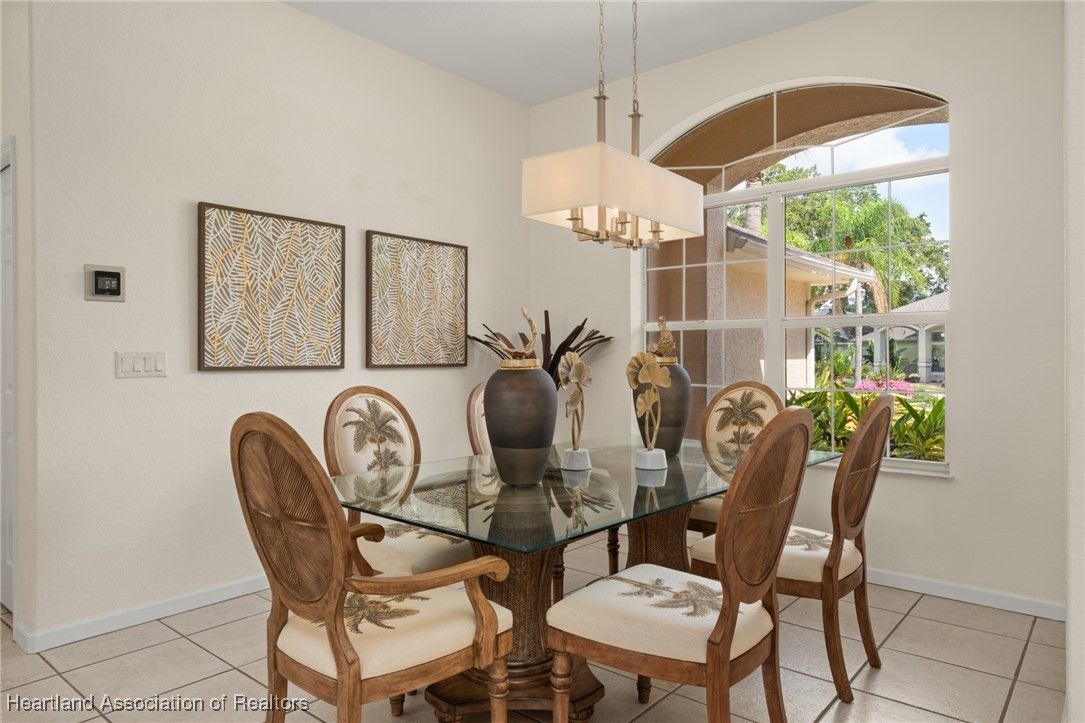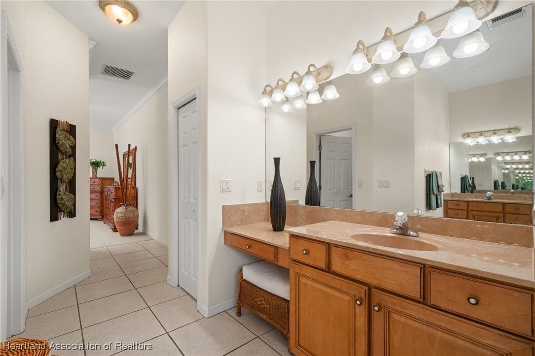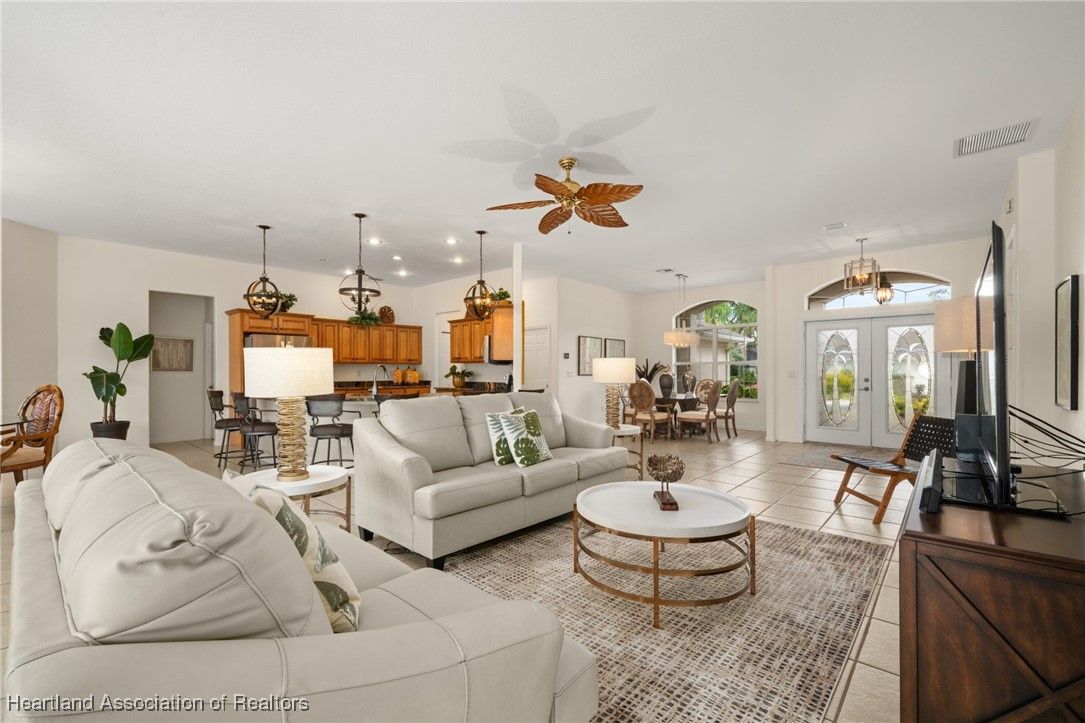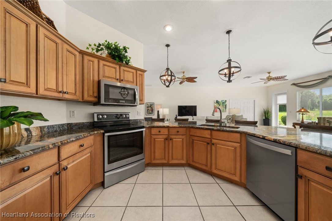 WOW!! Welcome to this absolutely stunning custom built Highlands Ridge masterpiece boasting epic Golf Course and Pond views! Constructed in 2004 with over 2,800 luxurious living square footage alone - this beauty offers 3 bedrooms on a split floor plan + 1 bonus den, 3 full bathrooms, a huge 2 car garage, plus so much more to enjoy the ultimate Florida lifestyle surrounded by total opulence! Arrive at the brick paver driveway - the pristine curb appeal offered by the lush landscaping and impeccable custom finishings will make you excited to arrive home! Enter through the lovely double door front entryway and prepare to fall in love at first sight. The inviting central main living area is HUGE! Naturally light and bright, 10 ft. high ceilings - you will be drawn into the immaculately spotless interior. You have a formal dining room immediately to your right, adorned with a lovely view of the front yard and chandelier lighting. The centrally located gourmet kitchen is one to be adored containing copious amounts of Level 5 exotic Granite countertops with extra bar stool seating, Stainless Steel appliances, multi-level glazed maple cabinetry, and ambient recessed & pendant lighting! There is also a second casual dining area adjacent to the kitchen. The back open patio area offers over 700 square feet of entertaining space & potential for an outdoor kitchen area or a covered patio. The massive master bedroom offers crown molding, enough space to comfortably accommodate a king size bedroom furniture set, and double door access into the 14'x11' bonus den/office! The en-suite bathroom is one that you will absolutely fall in love with - complete with 2 large walk-in closets, a relaxing soak tub, impressive cultured marble walk-in shower, elegant lighting fixtures, and 2 separate sink vanities - one with a supplemental make-up area! Generously sized secondary bedrooms on the opposite side of the home offering plenty of closet space, one bedroom also features a full ensuite bathroom. The second and third bathrooms are both spacious and offer a walk-in shower. Convenient and versatile interior utility room containing the washer & dryer is located next to the painted surfaced 2 car garage. Immaculate tile and spotlessly clean carpet flooring throughout the home. New Roof installed in 2018, New HVAC system installed in 2021, Well irrigation system, Central water and Sewer Utilities. Located on the 9th tee box on the golf course in the highly desired 55+ gated community of Highlands Ridge. The monthly HOA fee includes access to all of the community amenities and lawn maintenance for a care-free, social lifestyle offering a golf course, clubhouse, restaurant, pool, tennis, pickleball and more!