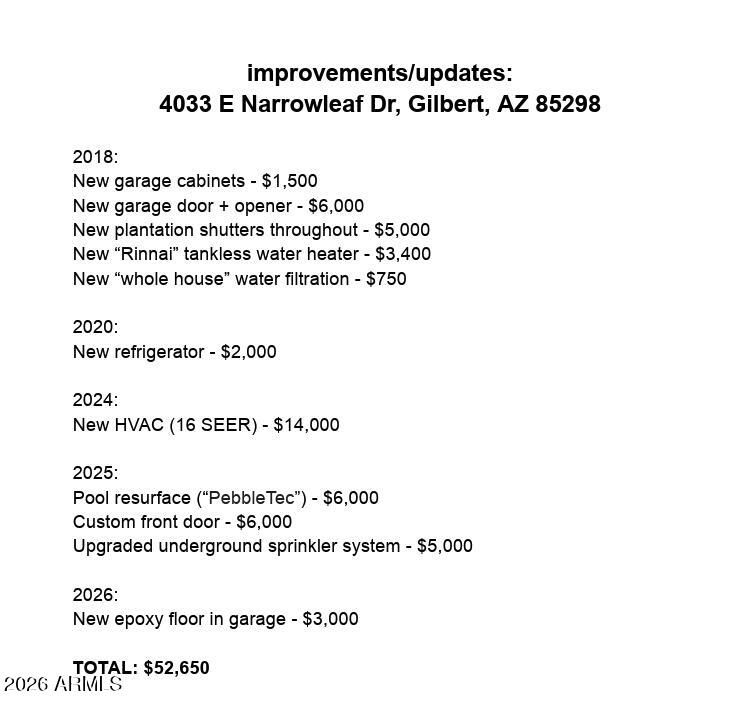 Eliminate electric bills (seriously, no more SRP payments!) with powerful solar system. $53K in recent upgrades include new HVAC (2024), new PebbleTec pool surface (2025), brand-new epoxy garage floors (2026). Sophisticated interior with plantation shutters, designer paint, abundant light, and tile in main areas. Formal dining and a spacious great room with surround sound and custom built-ins. Updated kitchen with built-in appliances, granite counters/backsplash, staggered cabinetry, walk-in pantry, and curved island with breakfast bar. Primary suite features bay window, barn door entry, dual vanities, glass shower, and walk-in closet. Laundry room includes sink and extra storage. 2.5-car garage with built-in cabinets. Private backyard with paver patio, charming desert landscaping, built in BBQ, and sparkling pool...perfect for relaxing or entertaining.
