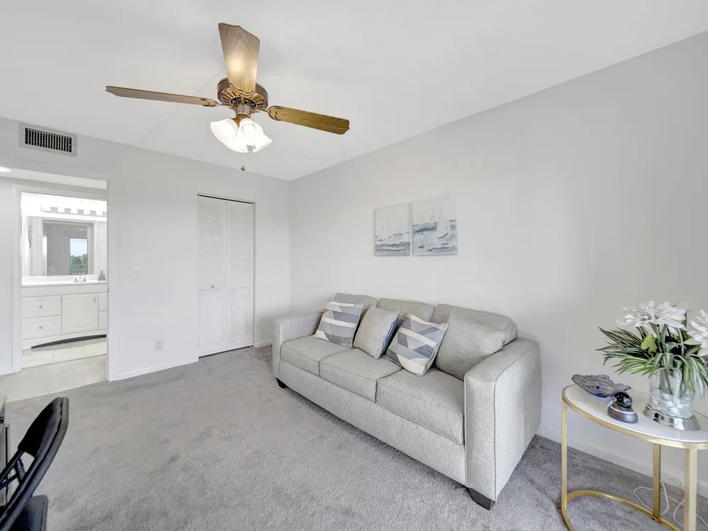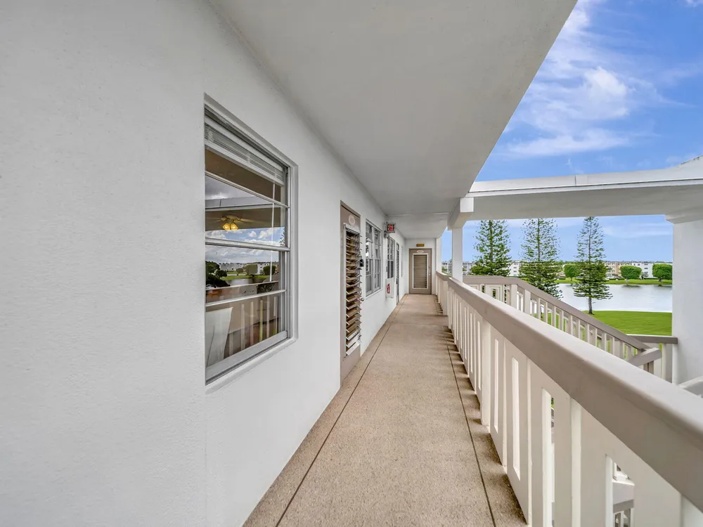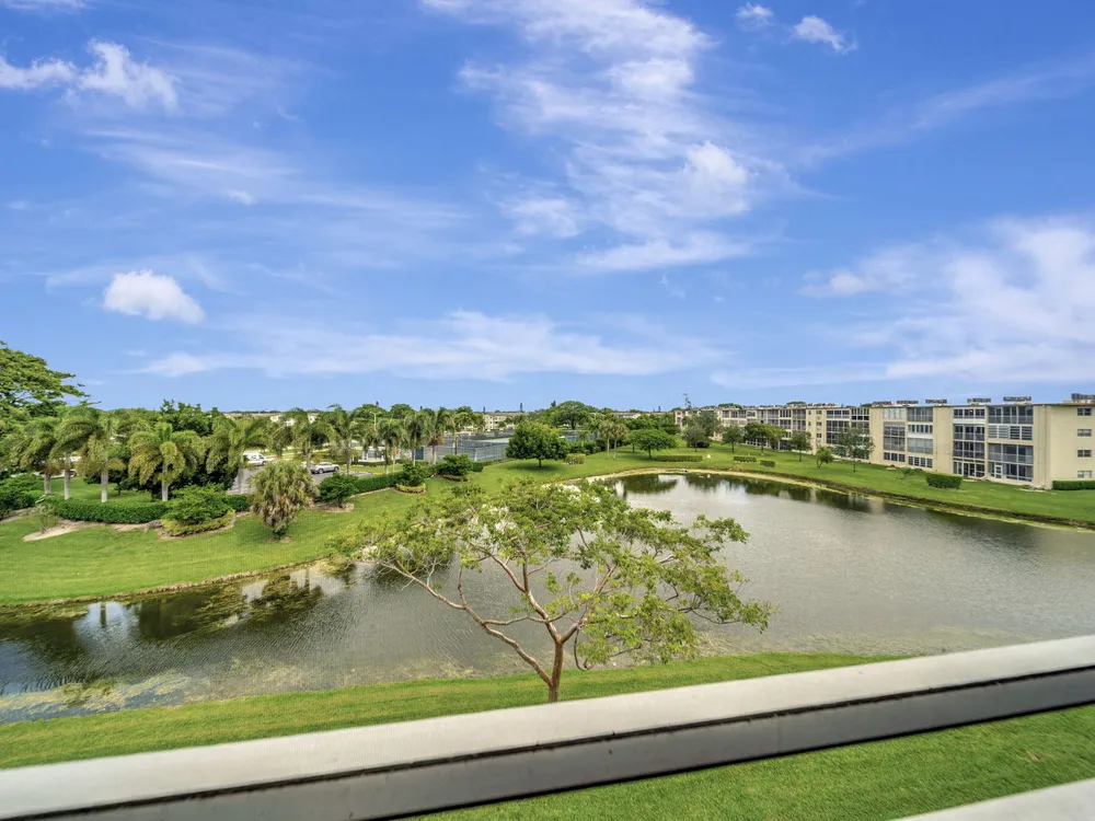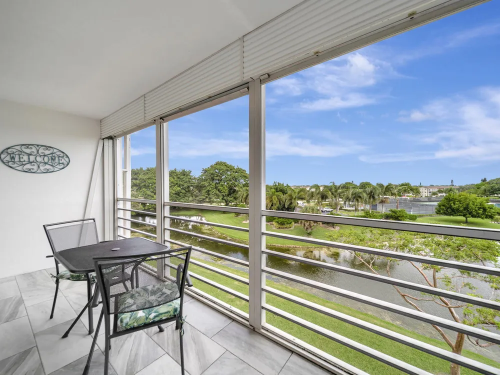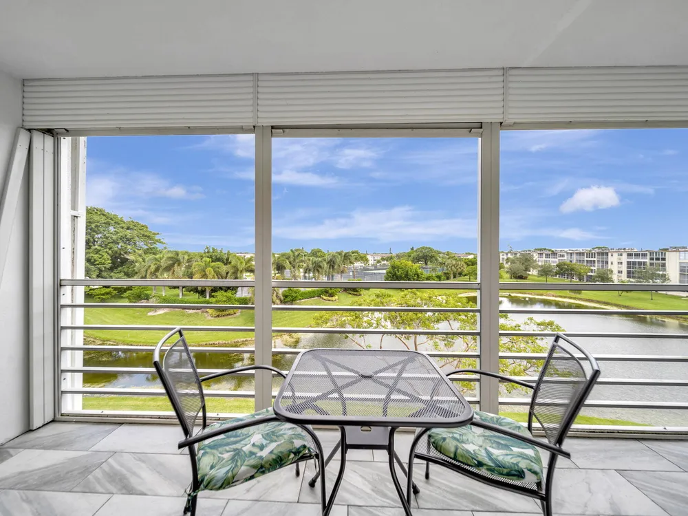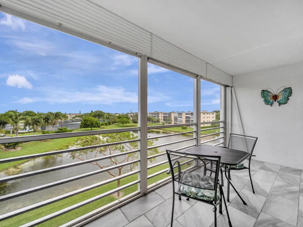 Waterfront Penthouse level condo in Boca Raton. Top floor 2 bedroom, 2 bath residence designed for easy living. See stunning lake views walking up to your condo, from the rooms and patio. Fully furnished and move-in ready. Updated kitchen with smooth ceilings, tall cabinets, recessed lighting, and modern backsplash. Large mirror wall & modern chandelier add elegance and light. Newer water heater. Control the AC and lamps directly from your phone. Updated bathroom. En-suite walk-in shower in main bedroom has a separate vanity & sink, and closet. New flooring in living area, fans in both bedrooms. Main bedroom has a walk-in closet and is TV mount ready. Roll-down shutters on patio for easy storm protection. Tile in screened patio overlooking the lake perfect for morning coffee.