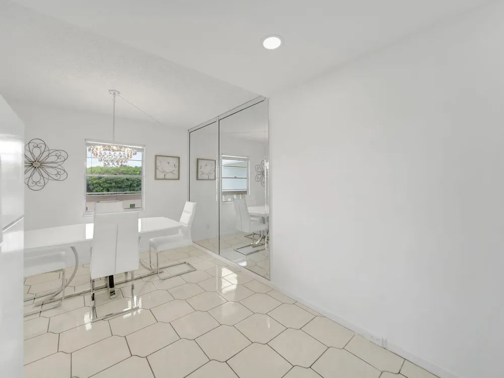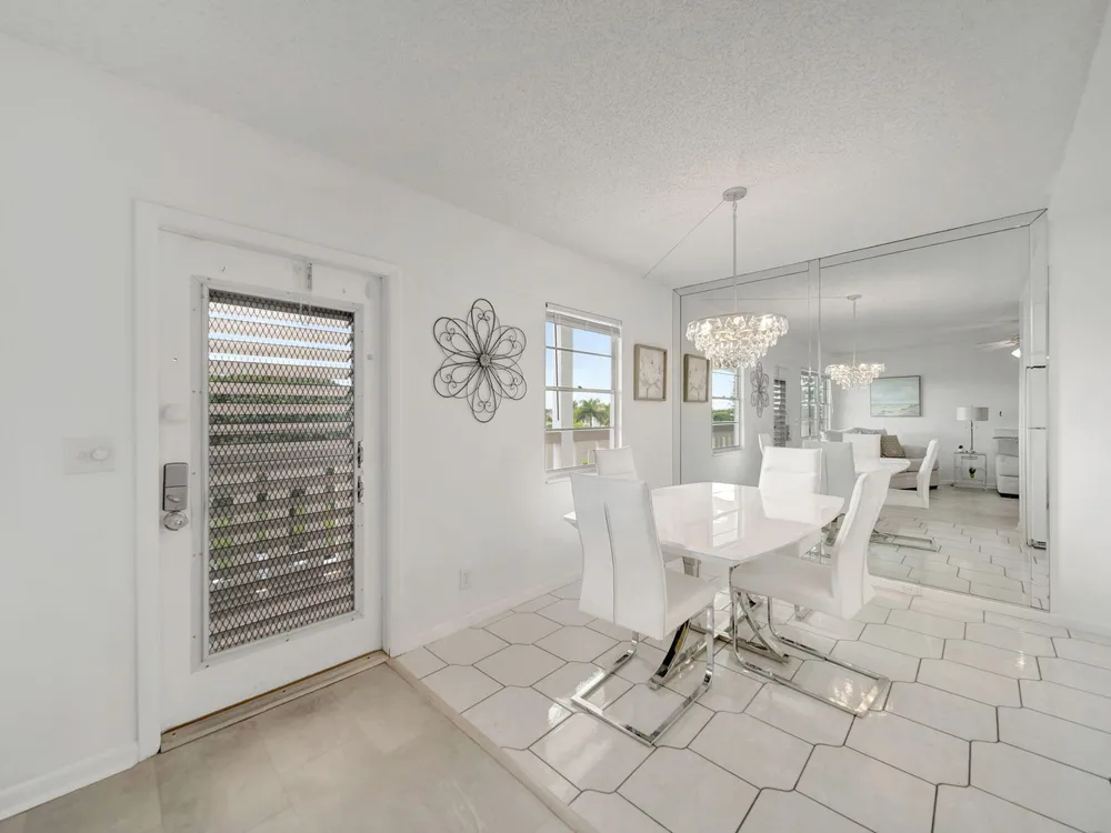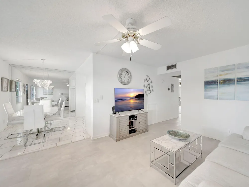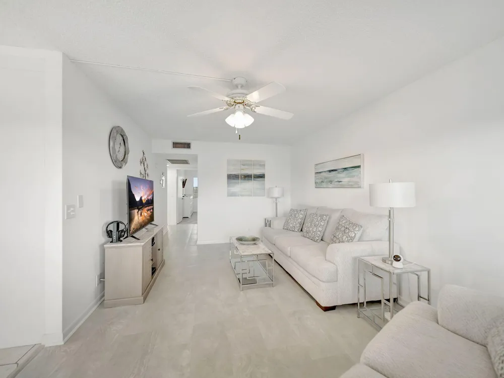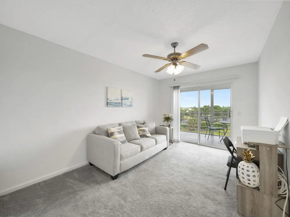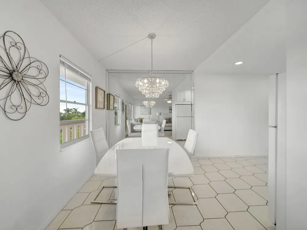 Waterfront Penthouse level condo in Boca Raton. Top floor 2 bedroom, 2 bath residence designed for easy living. See stunning lake views walking up to your condo, from the rooms and patio. Fully furnished and move-in ready. Updated kitchen with smooth ceilings, tall cabinets, recessed lighting, and modern backsplash. Large mirror wall & modern chandelier add elegance and light. Newer water heater. Control the AC and lamps directly from your phone. Updated bathroom. En-suite walk-in shower in main bedroom has a separate vanity & sink, and closet. New flooring in living area, fans in both bedrooms. Main bedroom has a walk-in closet and is TV mount ready. Roll-down shutters on patio for easy storm protection. Tile in screened patio overlooking the lake perfect for morning coffee.