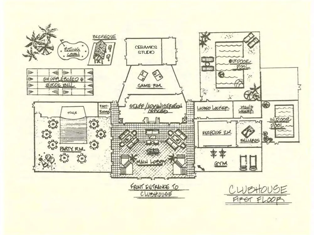 - Bicycle Storage, Billiard Room, Bocce, Business Center, Clubhouse, Laundry, Community Bus, Elevator, Storage, Fitness Center, Game Room, Indoor Pool, Library, Pool, Shuffleboard, Tennis Court(s), Trash Chute