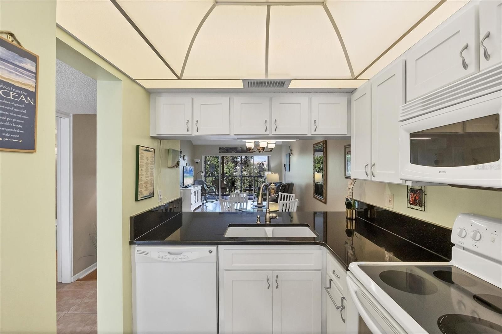 SPECTACULAR LAKE AND FAIRWAYS VIEWS await you from this TOP-FLOOR, END-UNIT Condominium - offered Turnkey Furnished, making it ready for immediate enjoyment whether as a full-time residence or seasonal retreat. This inviting 2-bedroom, 2-bath condo features a thoughtfully designed kitchen with granite countertops, a pass-through breakfast bar, white raised-panel cabinetry, dome ceiling and an updated pantry. The guest suite offers privacy with its own pocket door access to the second bedroom and bath, while the primary suite boasts a spacious walk-in closet, abundant natural light from end-unit windows, a convenient stack washer/dryer, and sliding doors leading to the enclosed lanai - perfect for soaking up the Florida sunshine. Vaulted ceiling in the dining and living areas enhanced the sense of openness and the living room seamlessly extends to the air-conditioned glass enclosed lanai, where you can enjoy year-round comfort while watching wildlife, golfers, or simply savoring morning coffee overlooking the 9th Fairway of the Bobcat Course. Recent updates include a newer roof, brand new carport with storage shed, exterior painting and freshly paved roads and dive ways. For added convenience, this building is equipped with an elevator (or stairs, if you prefer) and comes with a 9X9 storage room located in front of your covered parking space - ideal for bikes, golf clubs or beach gear. Westchester Gardens offers a vibrant social lifestyle with heated community pool, clubhouse and BBQ areas along with lush mature tropical landscaping. If you wish you can explore the various membership options at the Plantation Golf & Country Club - through membership is not mandatory. All of this is set in a tranquil community just minutes from, the pristine Gulf beaches, a wide array of dining and shopping, Wellen Park, The Atlanta Braves Spring Training Stadium, Historic Downtown Venice and easy access to US41 and I-75.