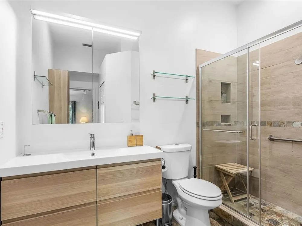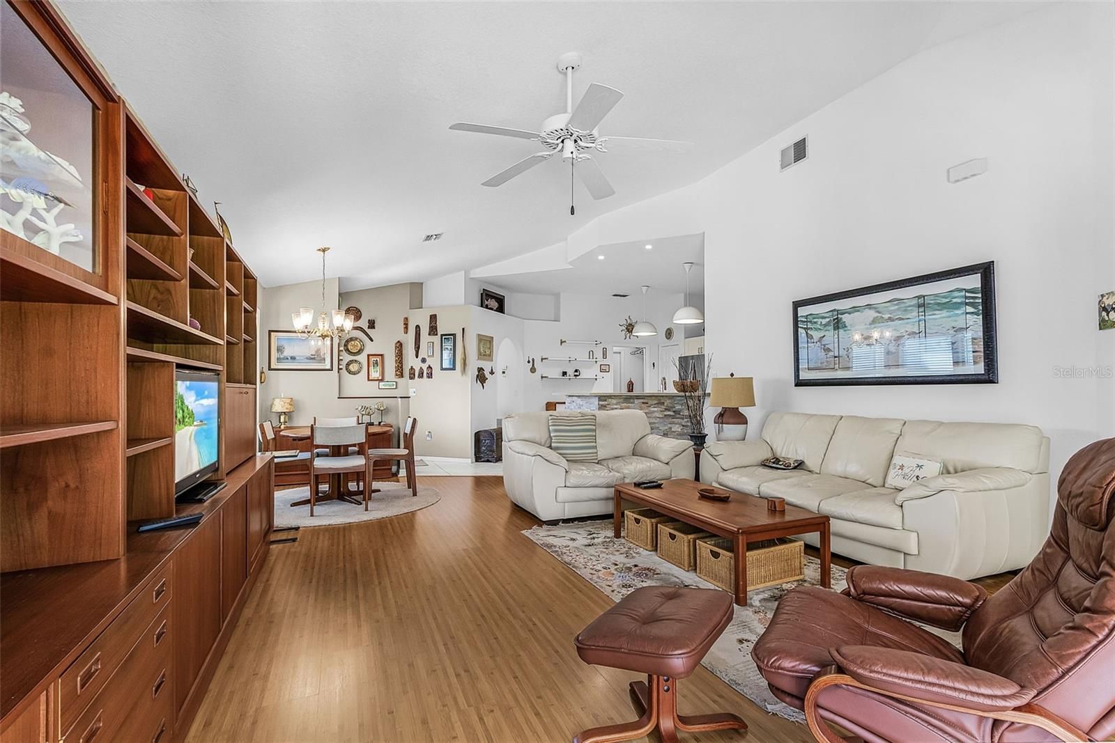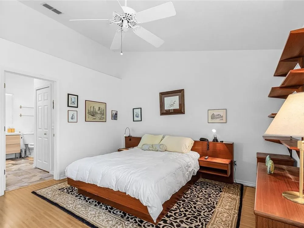 - Ceiling Fan(s), Eat-in Kitchen, High Ceilings, Living/Dining Room, Open Floorplan, Main Level Primary, Split Bedrooms, Stone Counters, Vaulted Ceiling(s), Walk-In Closet(s), Window Treatments