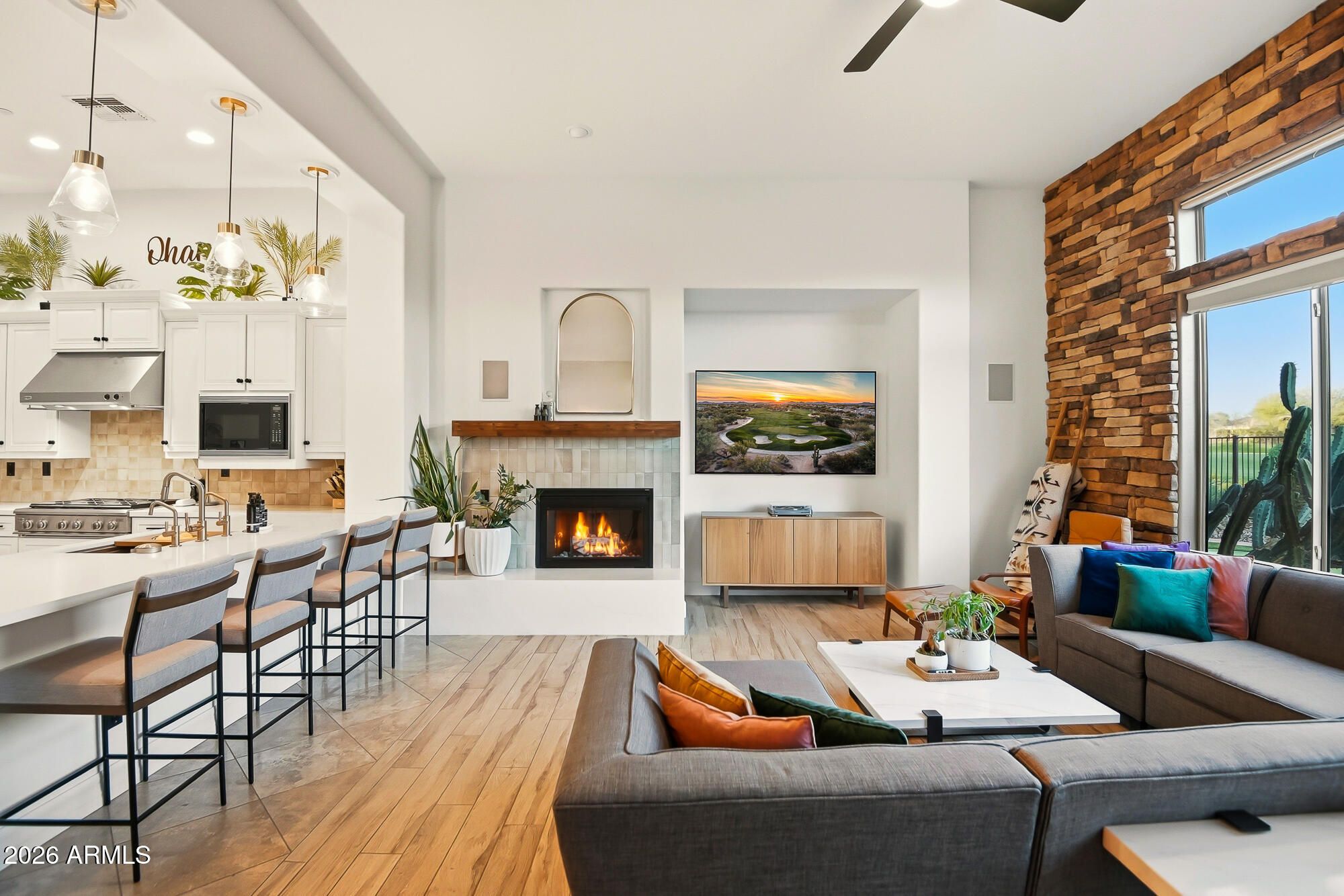 Here is your opportunity to appreciate a breathtaking golf course and mountain view Every Day in this beautifully remodeled SMART home. Enjoy open-concept living area that seamlessly blends indoor and outdoor spaces, perfect for entertaining or relaxing. The modern kitchen is equipped with a full-size wine fridge, island, breakfast bars, Quartz counters, enormous walk-in pantry, and Ruvati workstation sink. Ideal for culinary enthusiasts. You will appreciate the custom lighting, spacious bedrooms, luxurious bathrooms, stylish office & plenty of storage which is just the beginning of all this home has to offer . Step outside to enjoy your personal oasis with updated sparkling pool and soothing spa, surrounded by lush landscaping. Private golf green & BBQ island. Experience Resort Style living at its FINEST! Anthem Country Club is a private, gated country club community offering 36 holes of Championship Golf, Tennis and Pickle Ball courts, 2 Fitness Clubs, 2 pools and 2 restaurants and clubhouses.