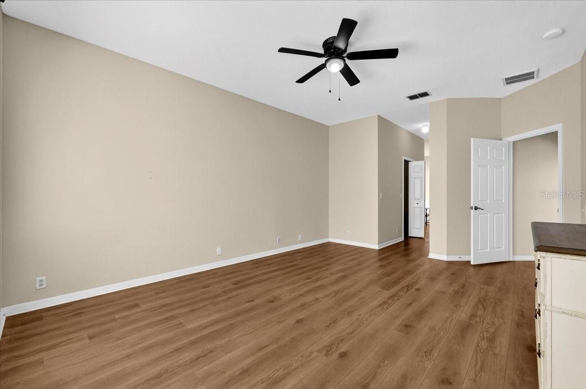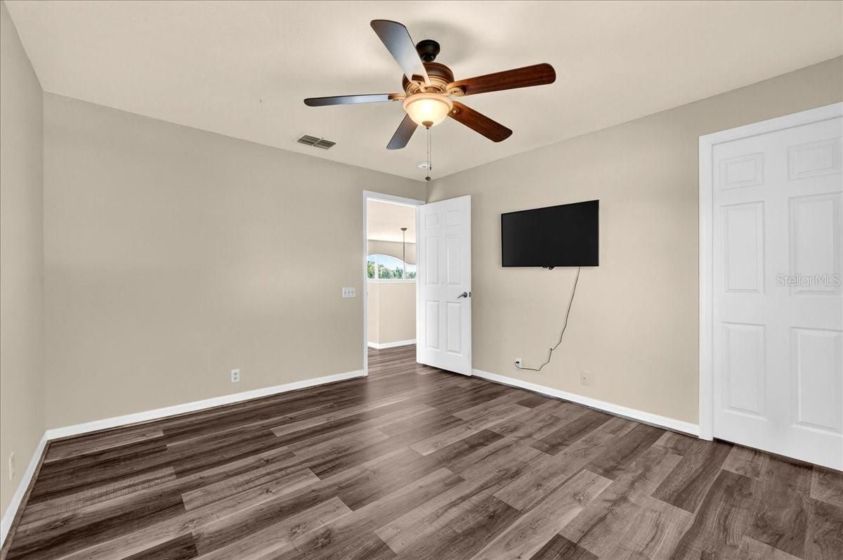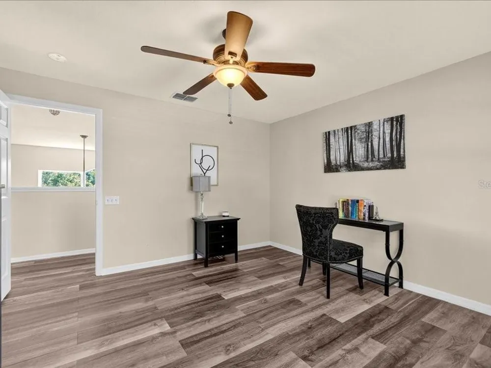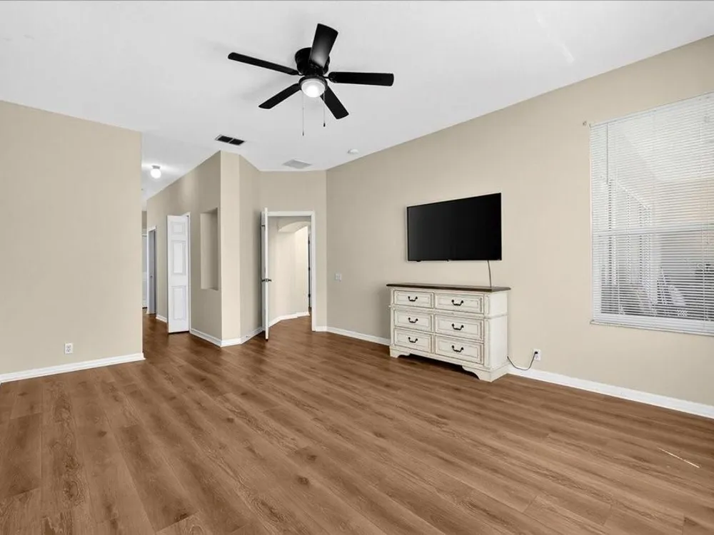 - Ceiling Fan(s), Eat-in Kitchen, High Ceilings, Living/Dining Room, Main Level Primary, Solid Surface Counters, Split Bedrooms, Thermostat, Walk-In Closet(s), Window Treatments