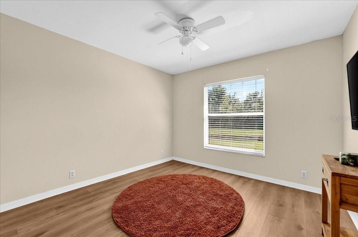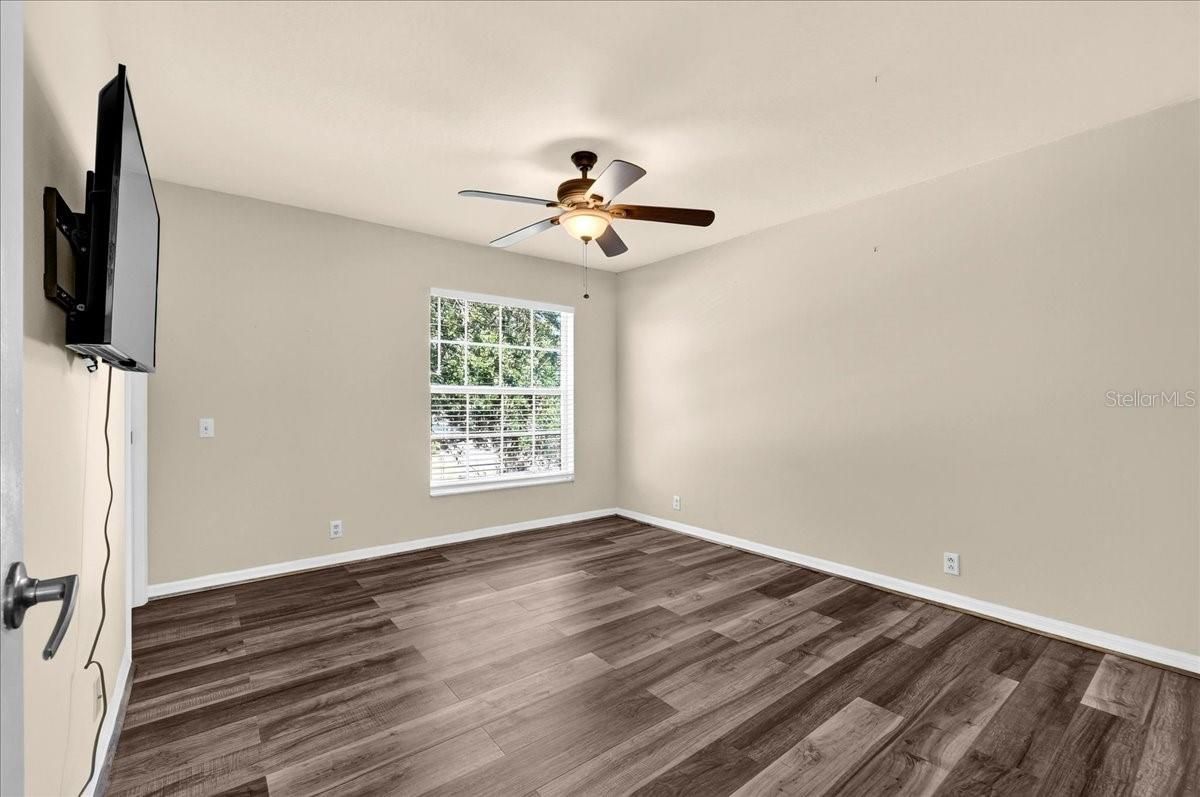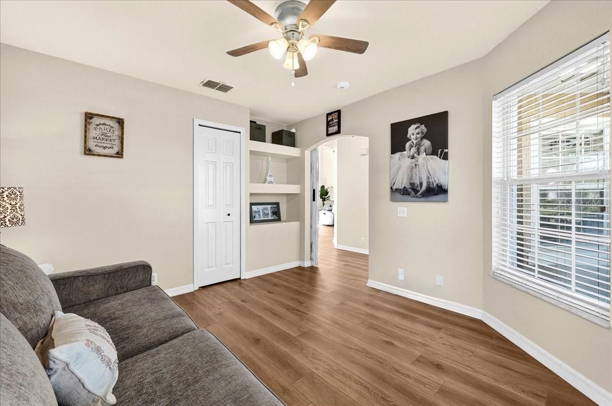 - Ceiling Fan(s), Eat-in Kitchen, High Ceilings, Living/Dining Room, Main Level Primary, Solid Surface Counters, Split Bedrooms, Thermostat, Walk-In Closet(s), Window Treatments