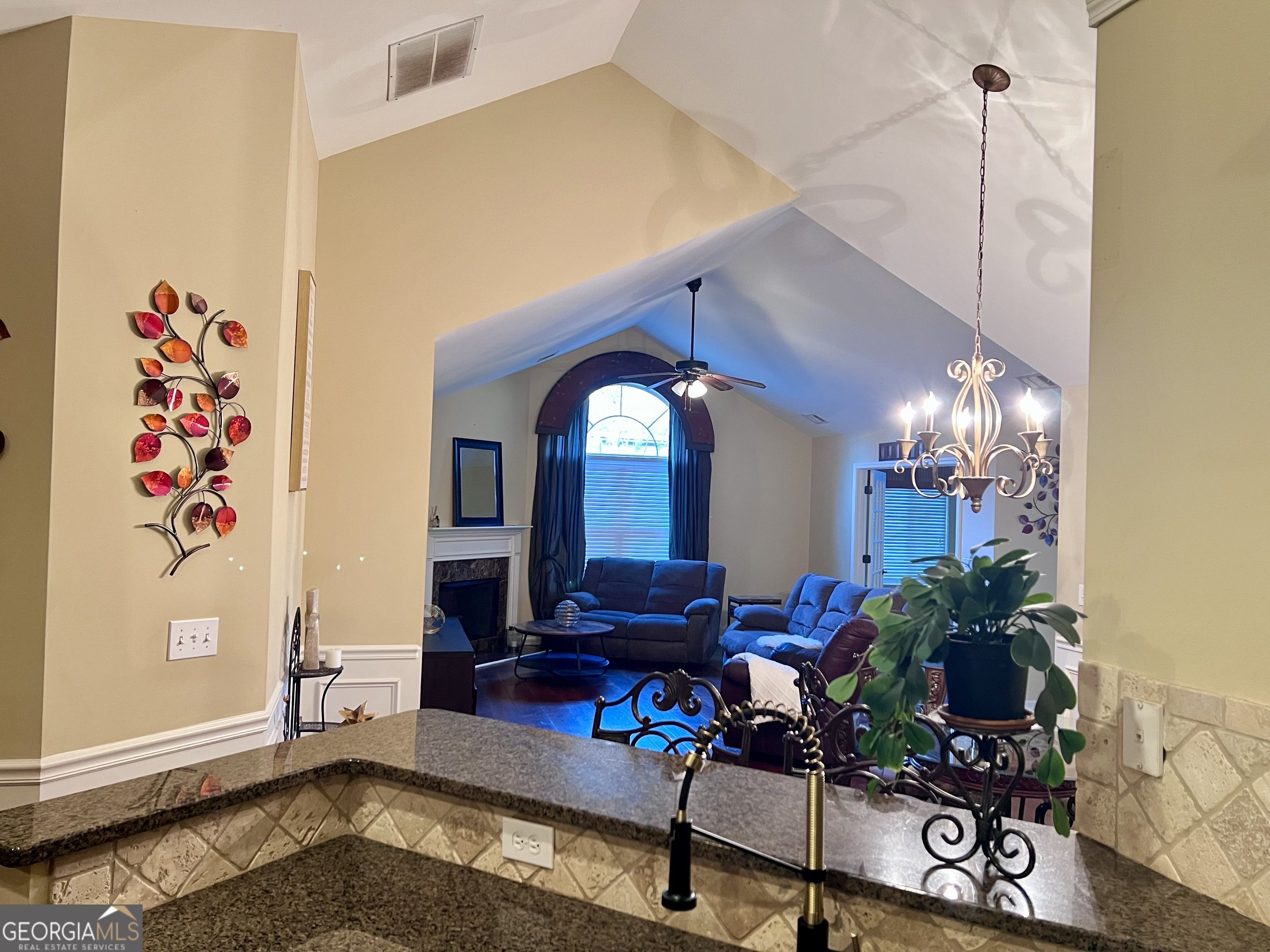 - Double Vanity, High Ceilings, In-Law Floorplan, Main Level Primary, Roommate Floorplan, Separate Shower, Split Bedrooms, Tile Bath, Vaulted Ceiling(s), Walk-In Closet(s), Dual Pane Window(s), Window Treatments, Entrance Foyer, Great Room, Laundry Facility, Home Office, Sunroom