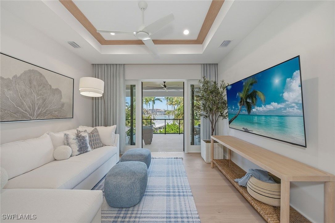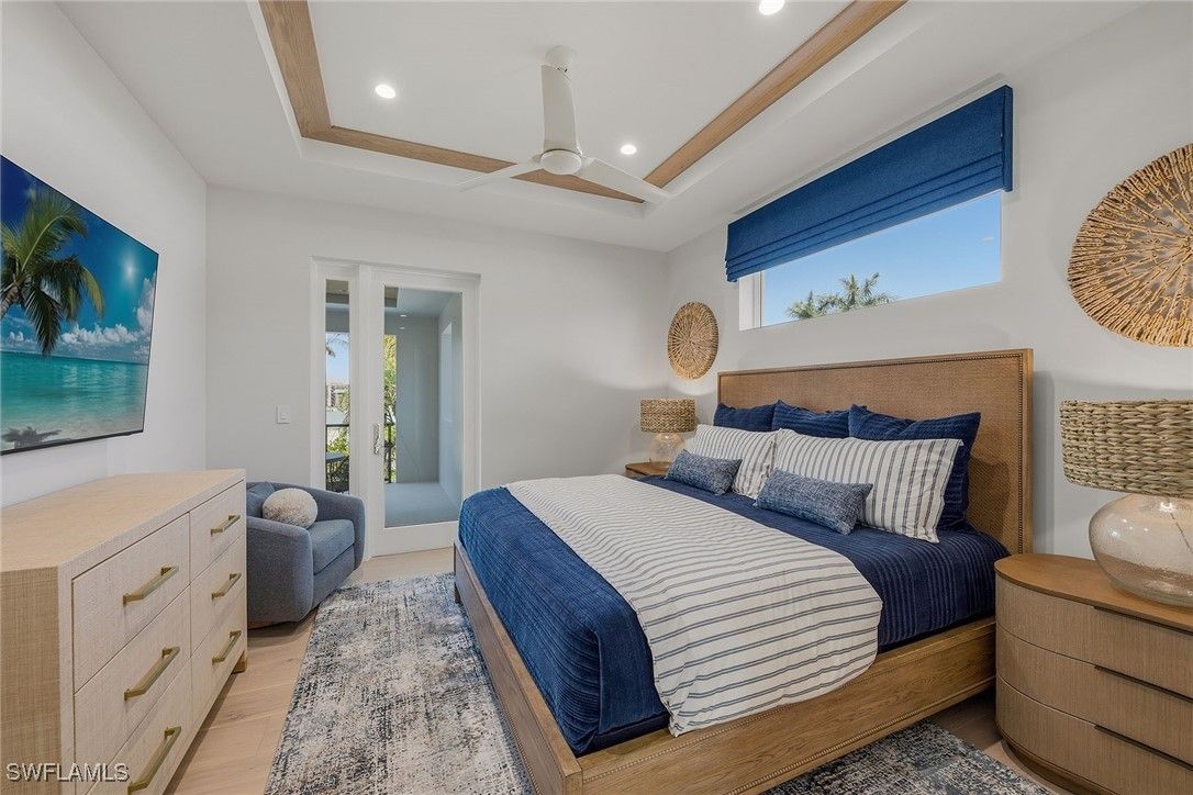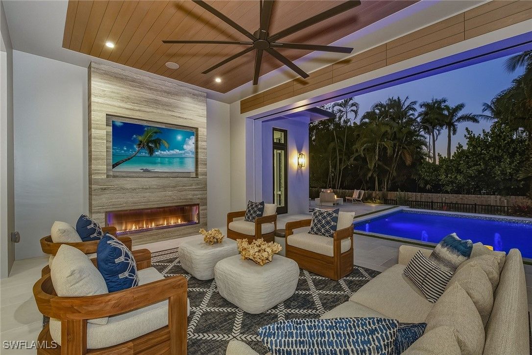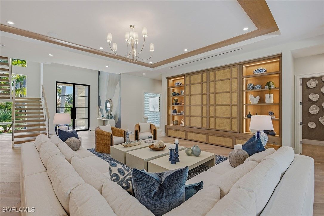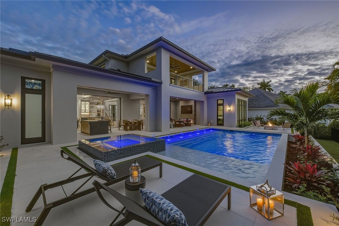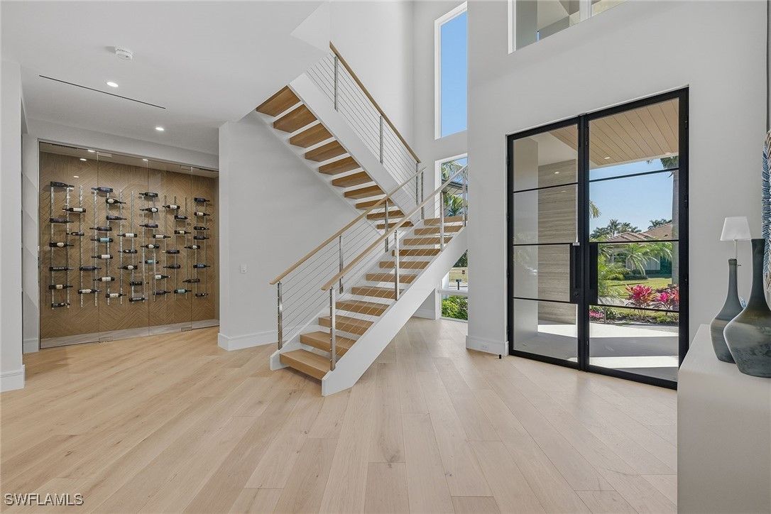 Experience the fusion of coastal sophistication and modern craftsmanship in this newly constructed estate by Diamond Custom Homes, positioned on one of the finest streets in the Moorings. With interiors and furnishings meticulously curated by Edge Interiors, this residence is more than a home, it is a statement of enduring style and seamless indoor-outdoor living. A dramatic double-height foyer and architectural floating staircase welcome you into light-filled interiors adorned with refined ceiling details and natural textures. The heart of the home is a designer kitchen featuring custom cabinetry, striking quartzite countertops, a full suite of Wolf and Sub-Zero appliances, a spacious walk-in pantry and a dedicated wet bar with ice maker, flanked by a dramatic, glass-enclosed wine vault that becomes a showpiece in its own right. The primary suite occupies its private wing, where morning light filters through expansive windows and bespoke details abound. Enjoy a custom morning bar, dual walk-in dressing rooms and a spa-inspired bath finished in natural stone selections, complete with custom vanities and dual water closets. Upstairs, four beautifully appointed guest suites each feature en-suite baths and access to a private second-floor lanai, ideal for relaxed gatherings or quiet reflection. The home’s design effortlessly embraces outdoor living. Pocketing sliding doors dissolve the boundaries between interior and exterior, leading to a covered lanai with a gas fireplace, full summer kitchen with bar seating and a dedicated pool bath. A custom pool and integrated spa, framed by a gas fire pit and an expansive sun deck, create a backdrop for effortless entertaining under the Naples sky. Additional features include a private elevator, three-car garage, whole-home generator and curated landscape design. Residents of The Moorings enjoy privileged access to the private Moorings Beach Park, as well as proximity to the waterfront shops and restaurants of Venetian Village, and the cultural charm of Olde Naples, offering an unparalleled lifestyle in one of Naples prestigious coastal enclaves.