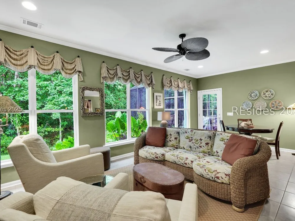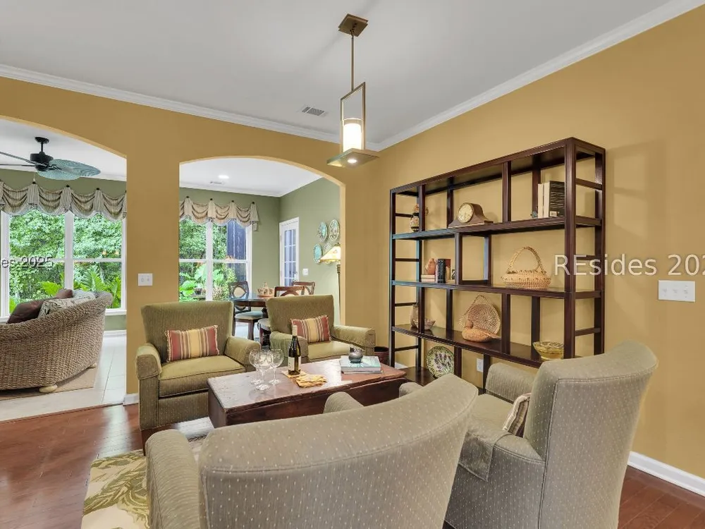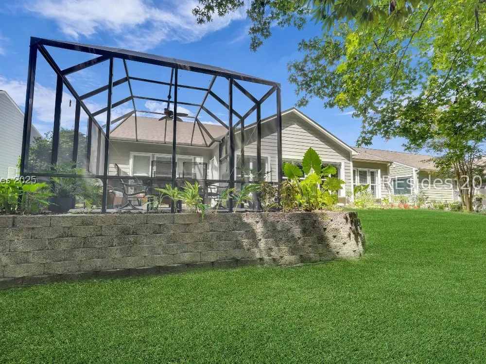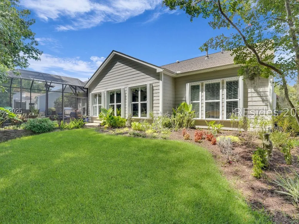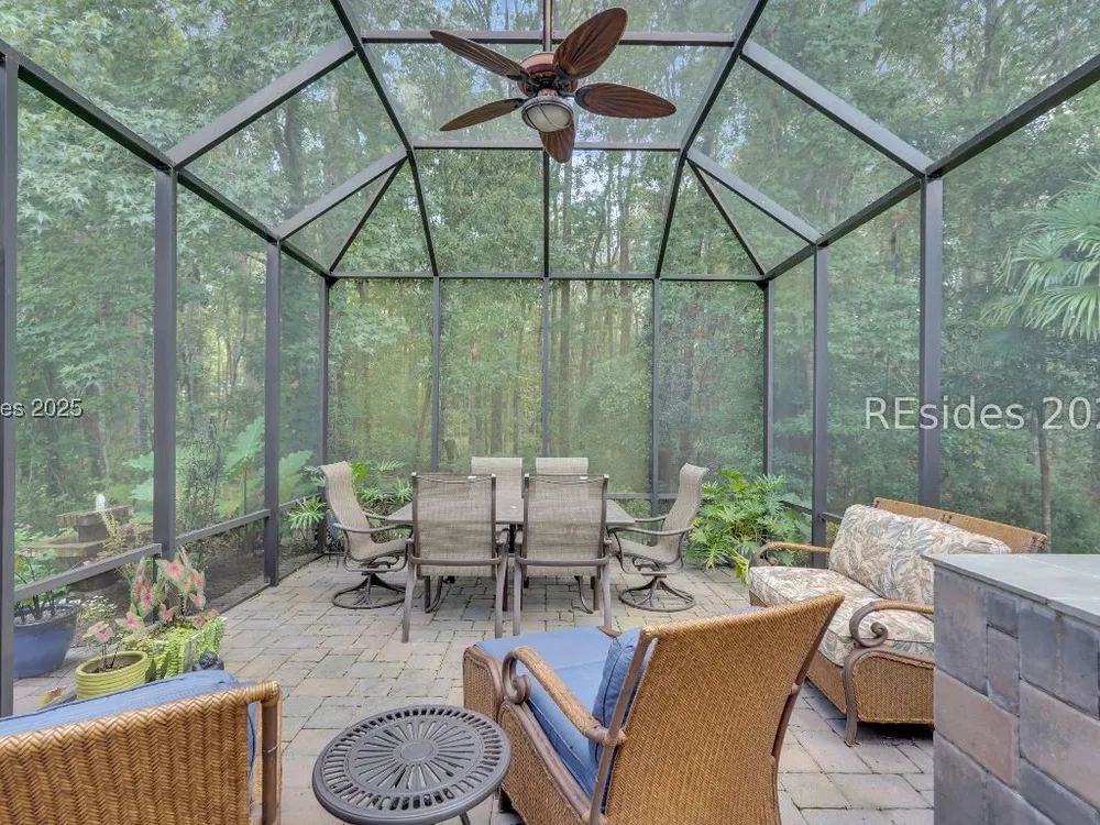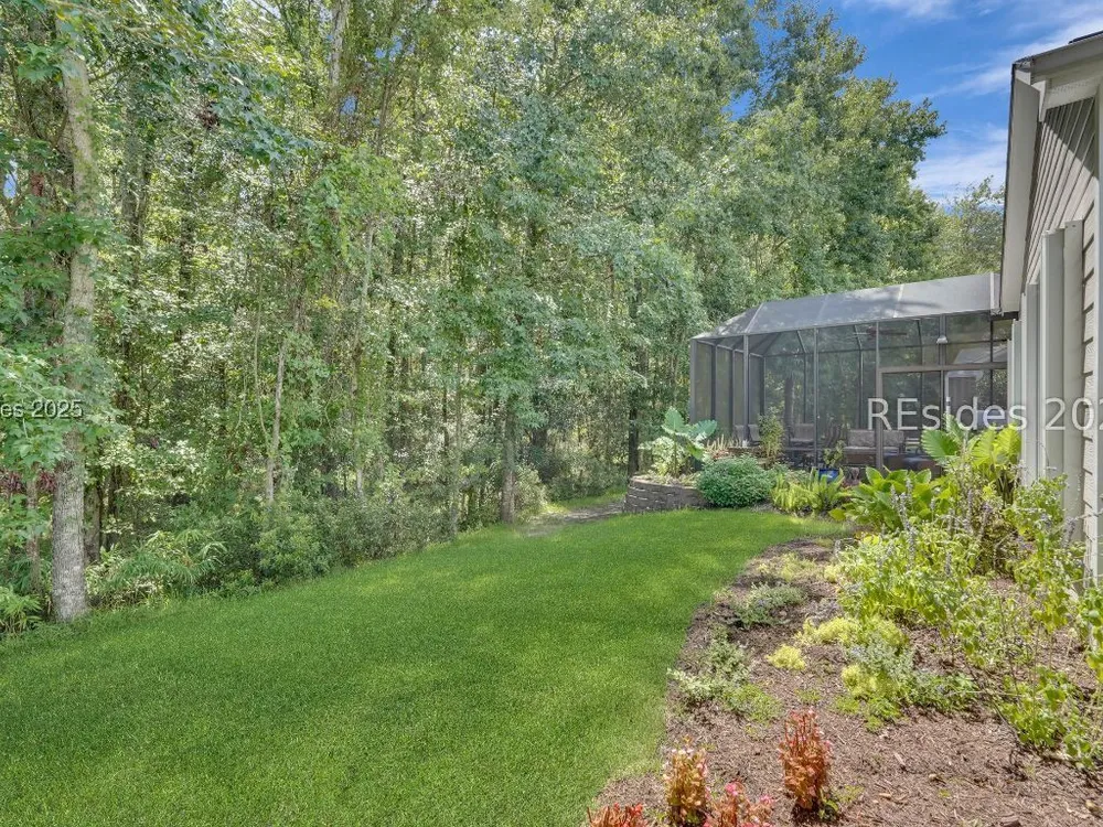 Beautiful Morningside Lane model in Sun Citys 55+ resort-style community. Tiled walkway and front porch. Stained glass entry door. 3BR/3.5BA plus den/office. Crown molding throughout living spaces. Each bedroom has an en-suite bath. Wood floors in common areas, carpet in bedrooms. Gourmet kitchen with granite counters, breakfast bar, large island with pendant lights for food preperation, backsplash and accent-lit cabinetry. Formal dining room and dry bar. Fireplace and built-ins in family room. Updated primary suite with walk-in shower. Carolina Room adds additional living space and natural lighting from the large windows. Door from Carolina Room leads to exteded lanai with built-in grill and connects to the paver patio overlooking wooded, private backdrop. Extended garage with room for cars and golf cart. Pull down stairs in garage lead to storage space over the garage. Full-size laundry with generous cabinetry, sink and counter space. Located for easy access to all of Sun City Hilton Head's oustanding amenities.