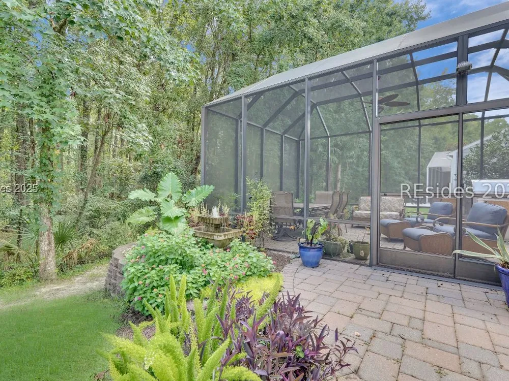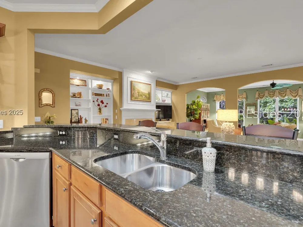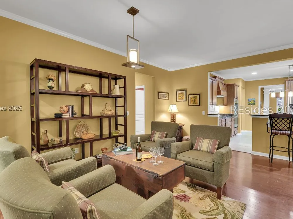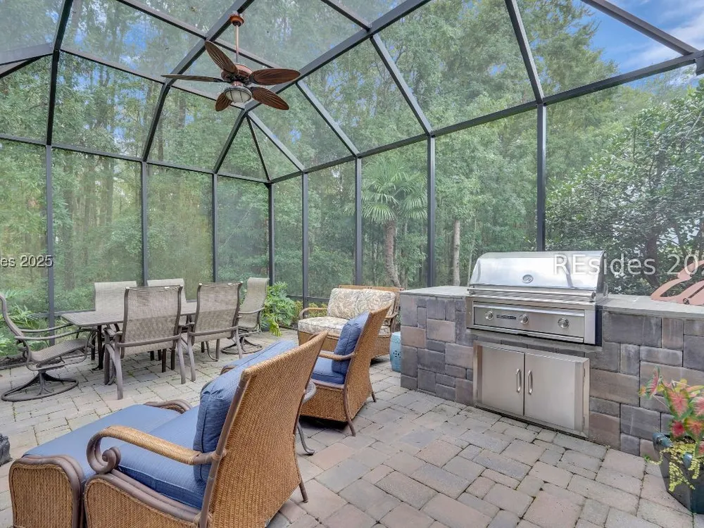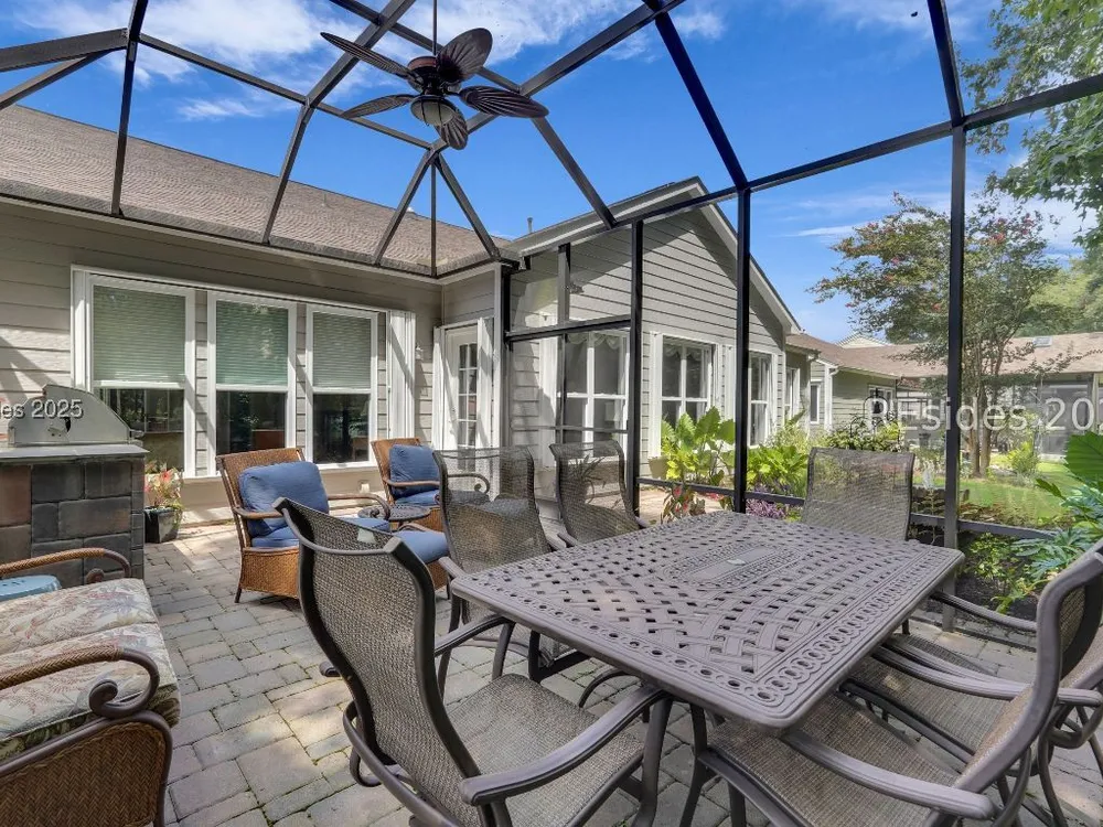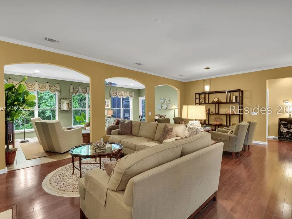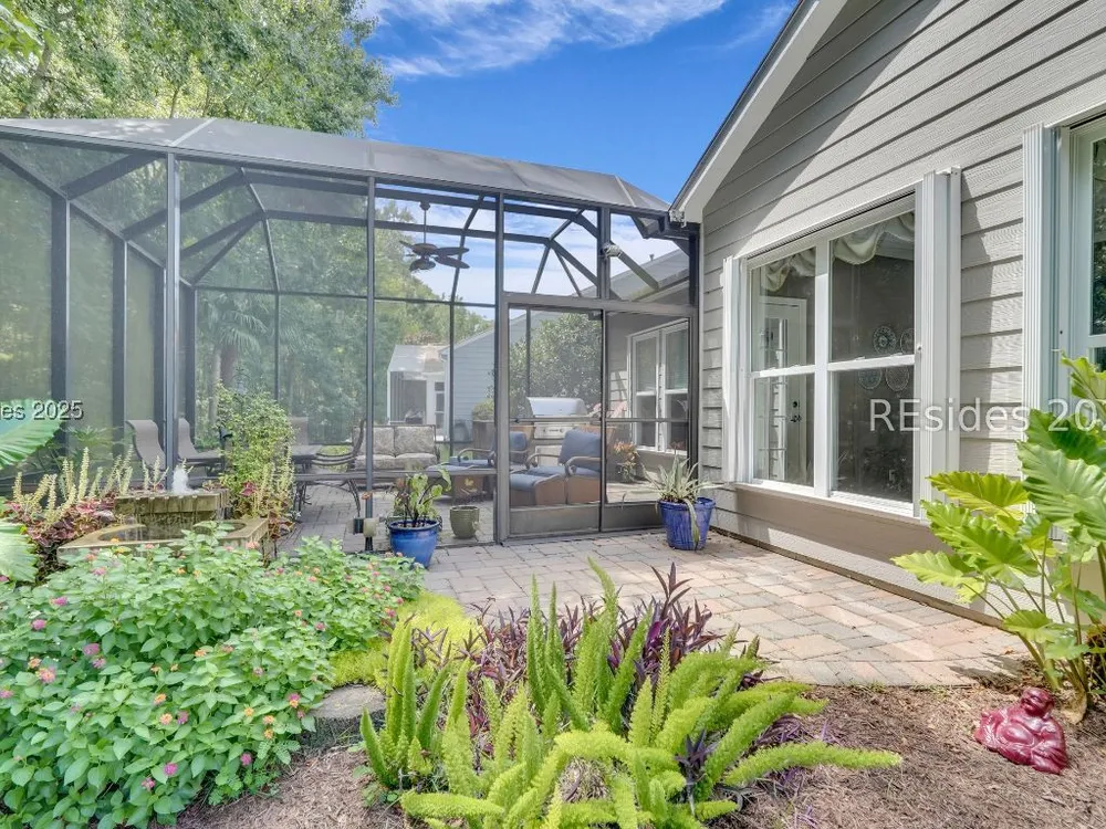 Beautiful Morningside Lane model in Sun Citys 55+ resort-style community. Tiled walkway and front porch. Stained glass entry door. 3BR/3.5BA plus den/office. Crown molding throughout living spaces. Each bedroom has an en-suite bath. Wood floors in common areas, carpet in bedrooms. Gourmet kitchen with granite counters, breakfast bar, large island with pendant lights for food preperation, backsplash and accent-lit cabinetry. Formal dining room and dry bar. Fireplace and built-ins in family room. Updated primary suite with walk-in shower. Carolina Room adds additional living space and natural lighting from the large windows. Door from Carolina Room leads to exteded lanai with built-in grill and connects to the paver patio overlooking wooded, private backdrop. Extended garage with room for cars and golf cart. Pull down stairs in garage lead to storage space over the garage. Full-size laundry with generous cabinetry, sink and counter space. Located for easy access to all of Sun City Hilton Head's oustanding amenities.