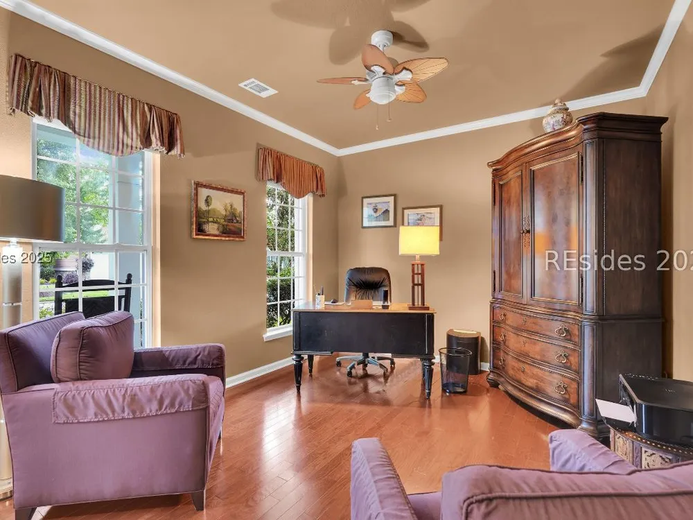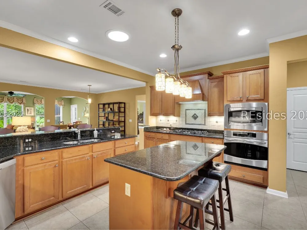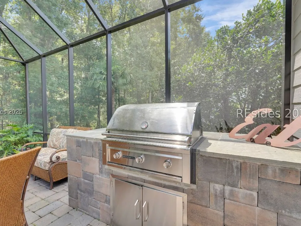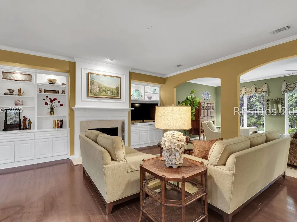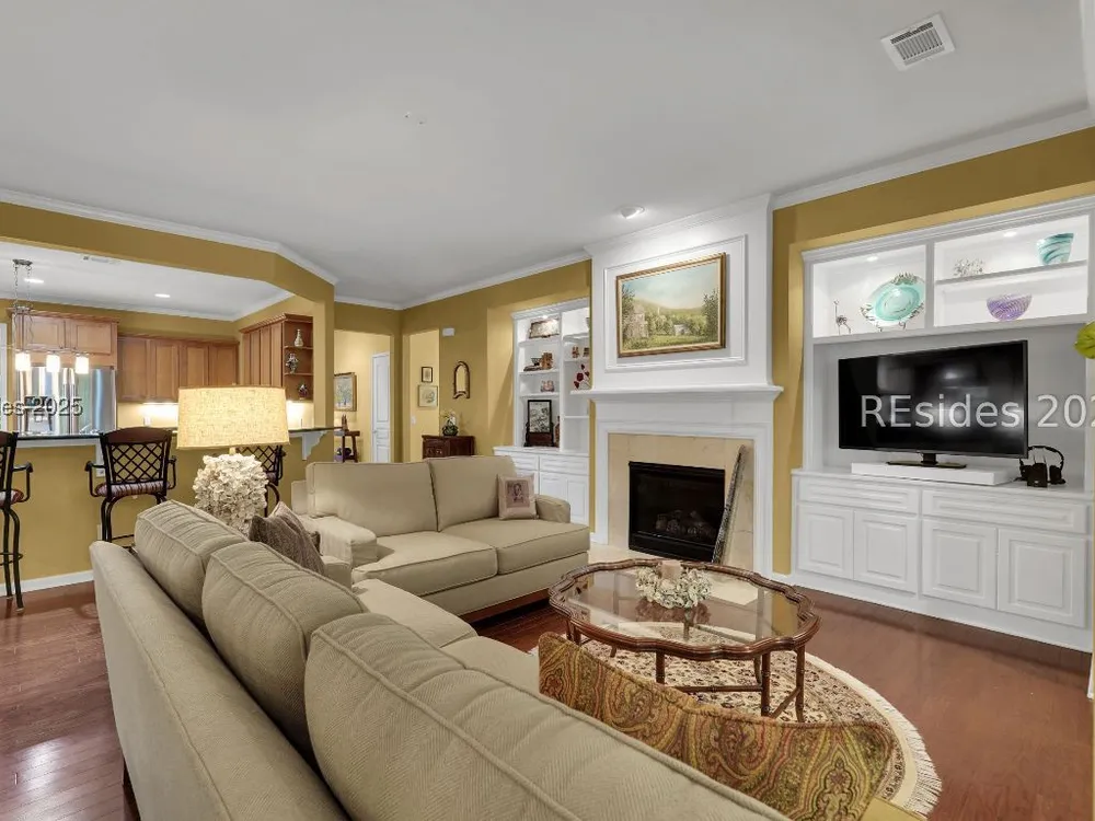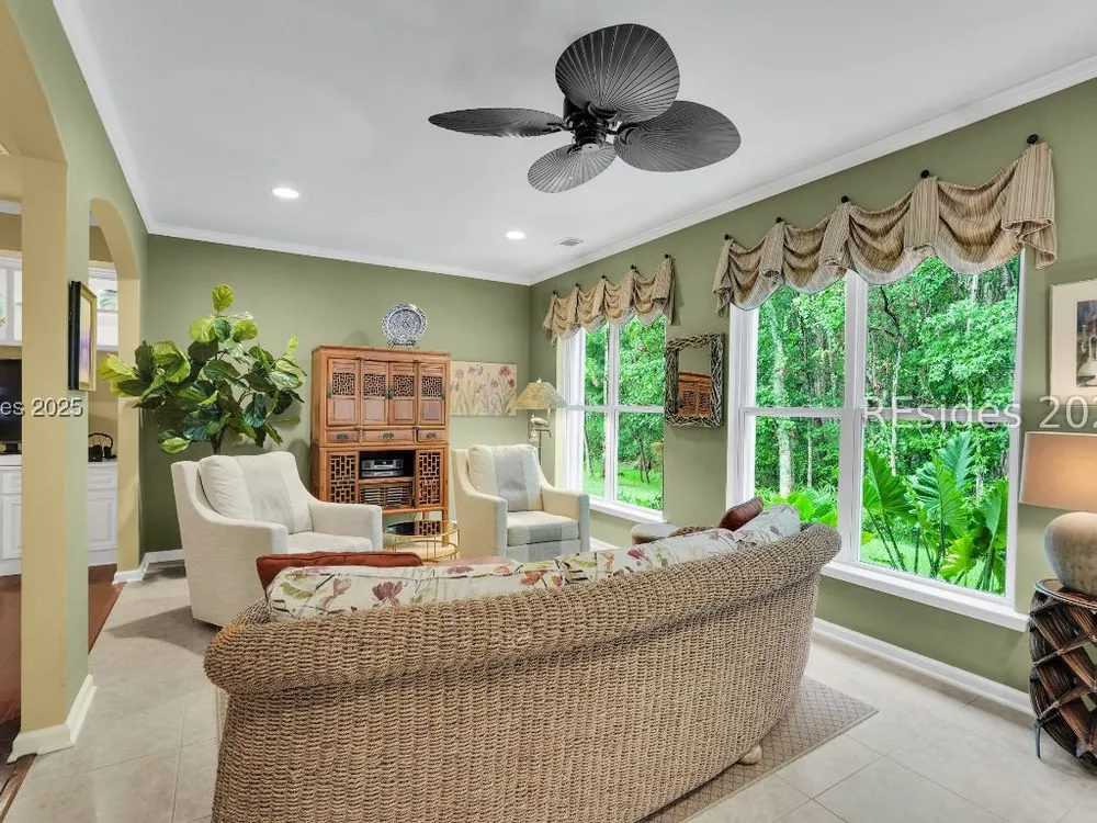 Beautiful Morningside Lane model in Sun Citys 55+ resort-style community. Tiled walkway and front porch. Stained glass entry door. 3BR/3.5BA plus den/office. Crown molding throughout living spaces. Each bedroom has an en-suite bath. Wood floors in common areas, carpet in bedrooms. Gourmet kitchen with granite counters, breakfast bar, large island with pendant lights for food preperation, backsplash and accent-lit cabinetry. Formal dining room and dry bar. Fireplace and built-ins in family room. Updated primary suite with walk-in shower. Carolina Room adds additional living space and natural lighting from the large windows. Door from Carolina Room leads to exteded lanai with built-in grill and connects to the paver patio overlooking wooded, private backdrop. Extended garage with room for cars and golf cart. Pull down stairs in garage lead to storage space over the garage. Full-size laundry with generous cabinetry, sink and counter space. Located for easy access to all of Sun City Hilton Head's oustanding amenities.