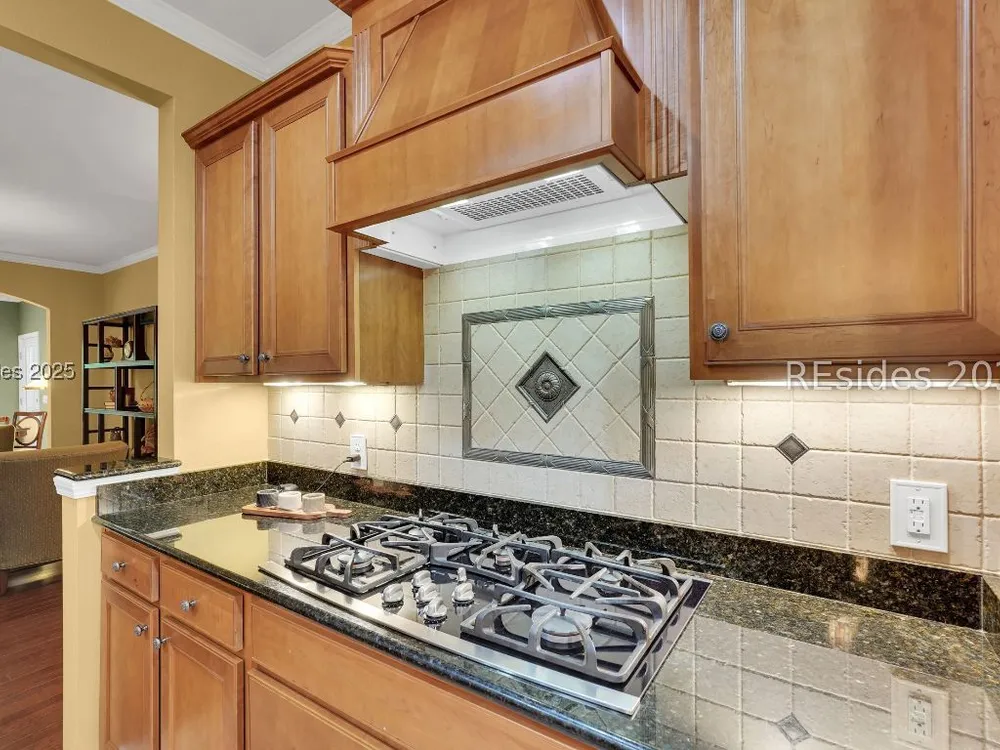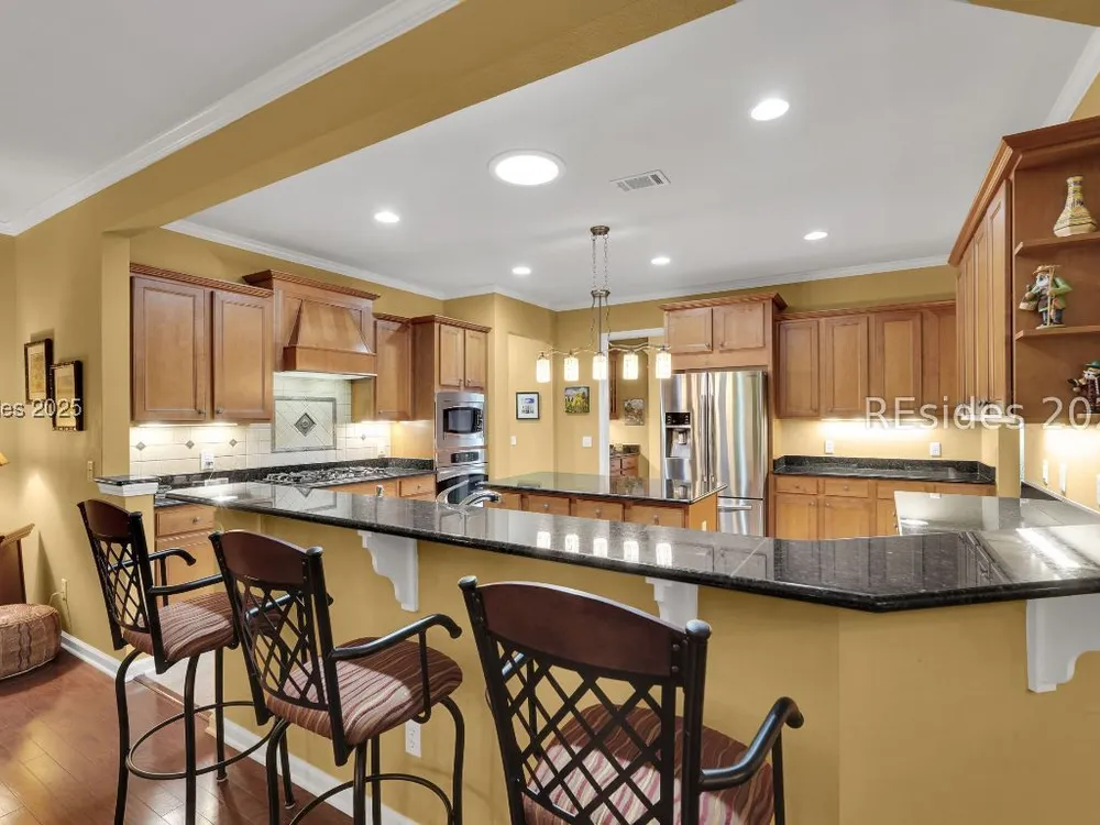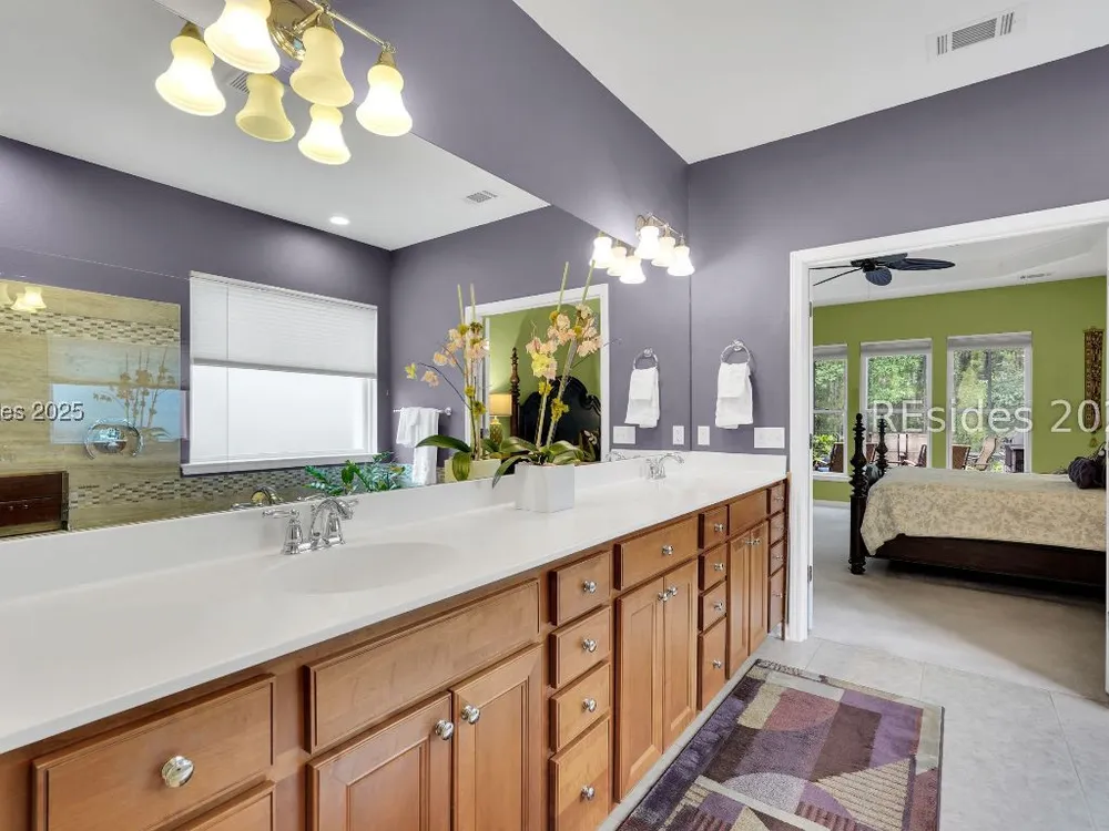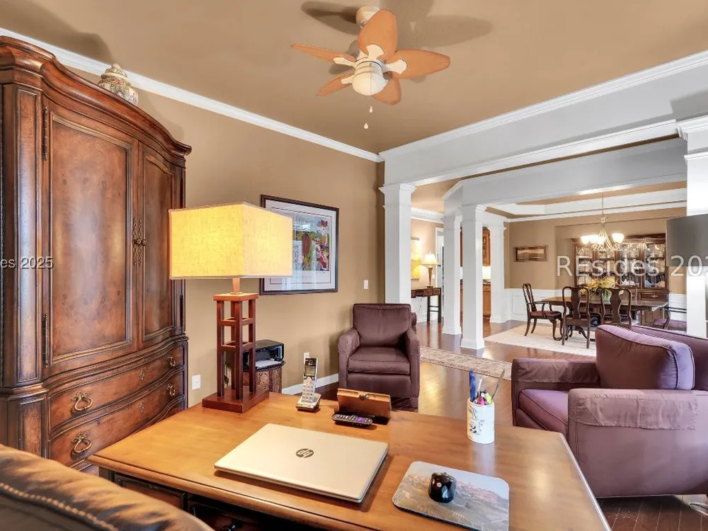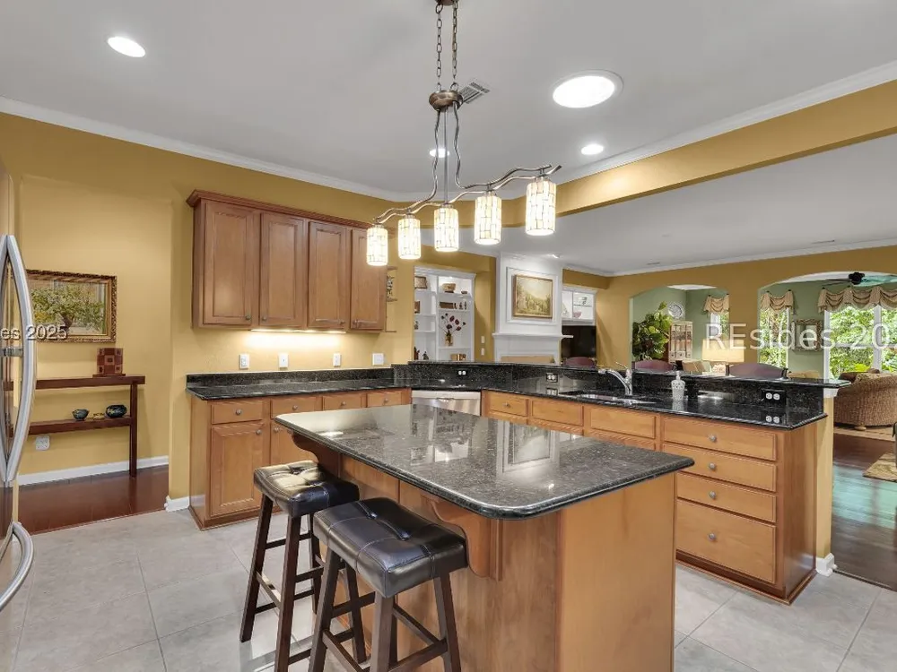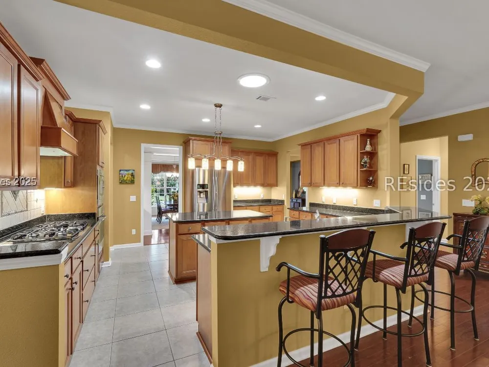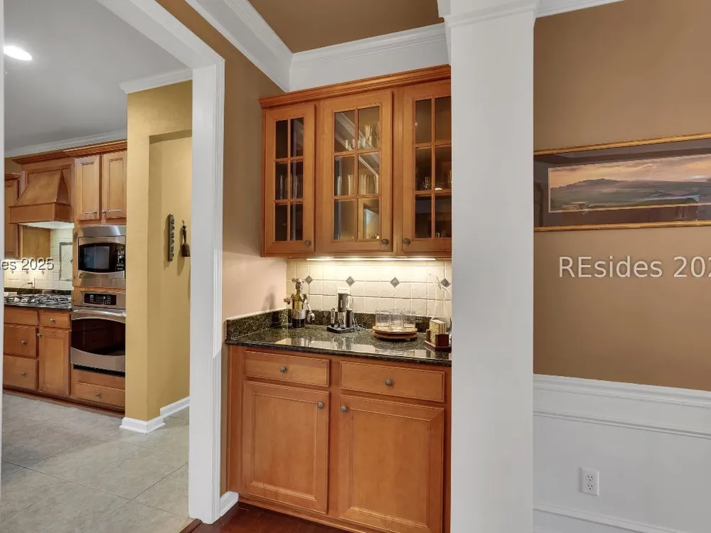 Beautiful Morningside Lane model in Sun Citys 55+ resort-style community. Tiled walkway and front porch. Stained glass entry door. 3BR/3.5BA plus den/office. Crown molding throughout living spaces. Each bedroom has an en-suite bath. Wood floors in common areas, carpet in bedrooms. Gourmet kitchen with granite counters, breakfast bar, large island with pendant lights for food preperation, backsplash and accent-lit cabinetry. Formal dining room and dry bar. Fireplace and built-ins in family room. Updated primary suite with walk-in shower. Carolina Room adds additional living space and natural lighting from the large windows. Door from Carolina Room leads to exteded lanai with built-in grill and connects to the paver patio overlooking wooded, private backdrop. Extended garage with room for cars and golf cart. Pull down stairs in garage lead to storage space over the garage. Full-size laundry with generous cabinetry, sink and counter space. Located for easy access to all of Sun City Hilton Head's oustanding amenities.