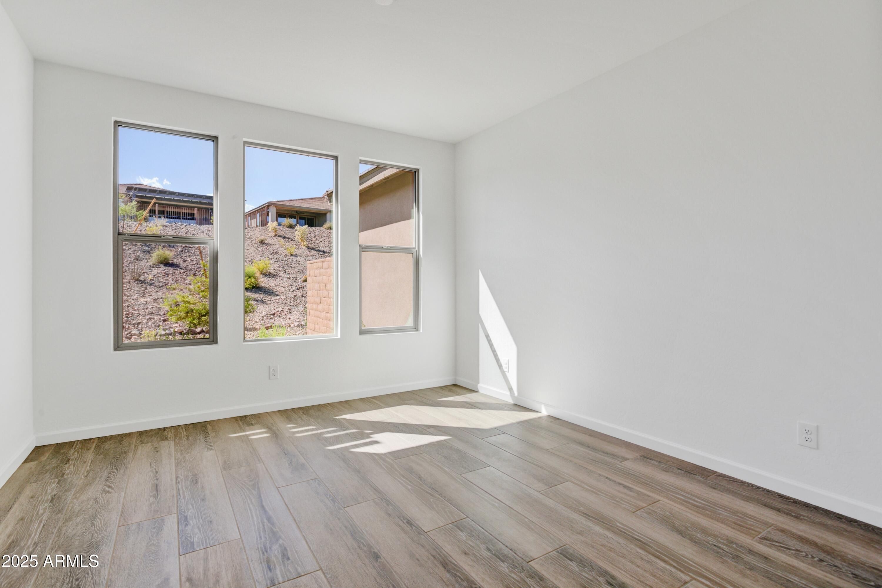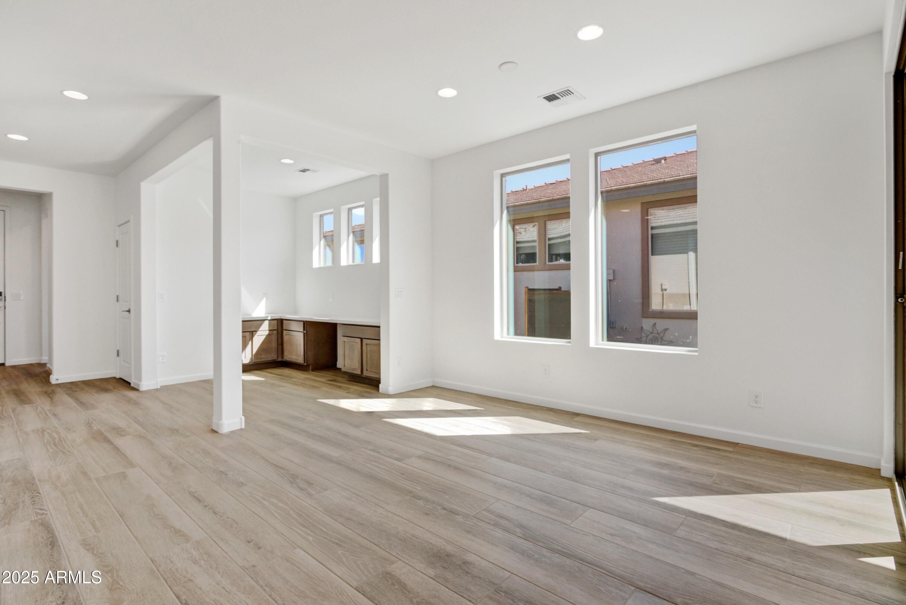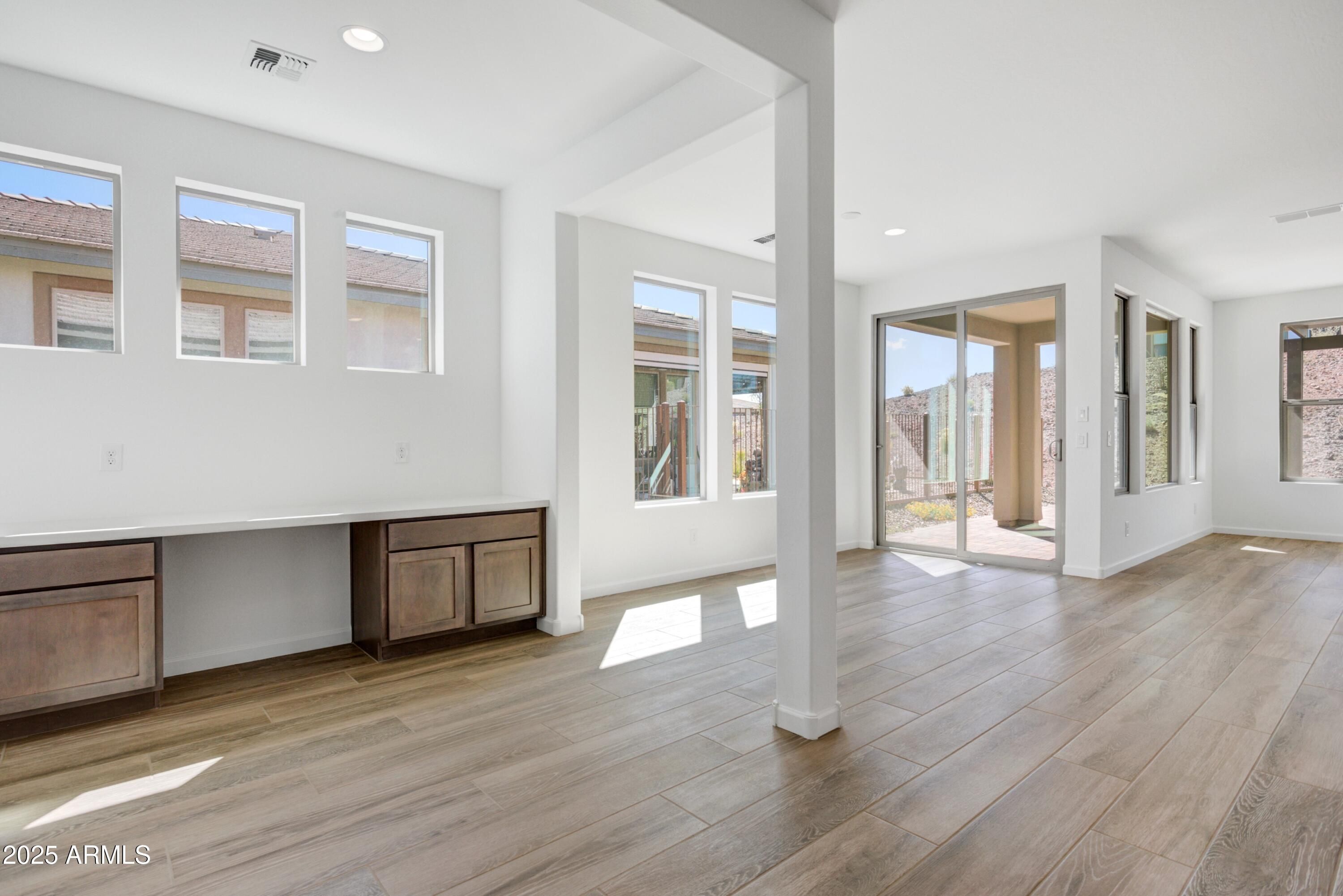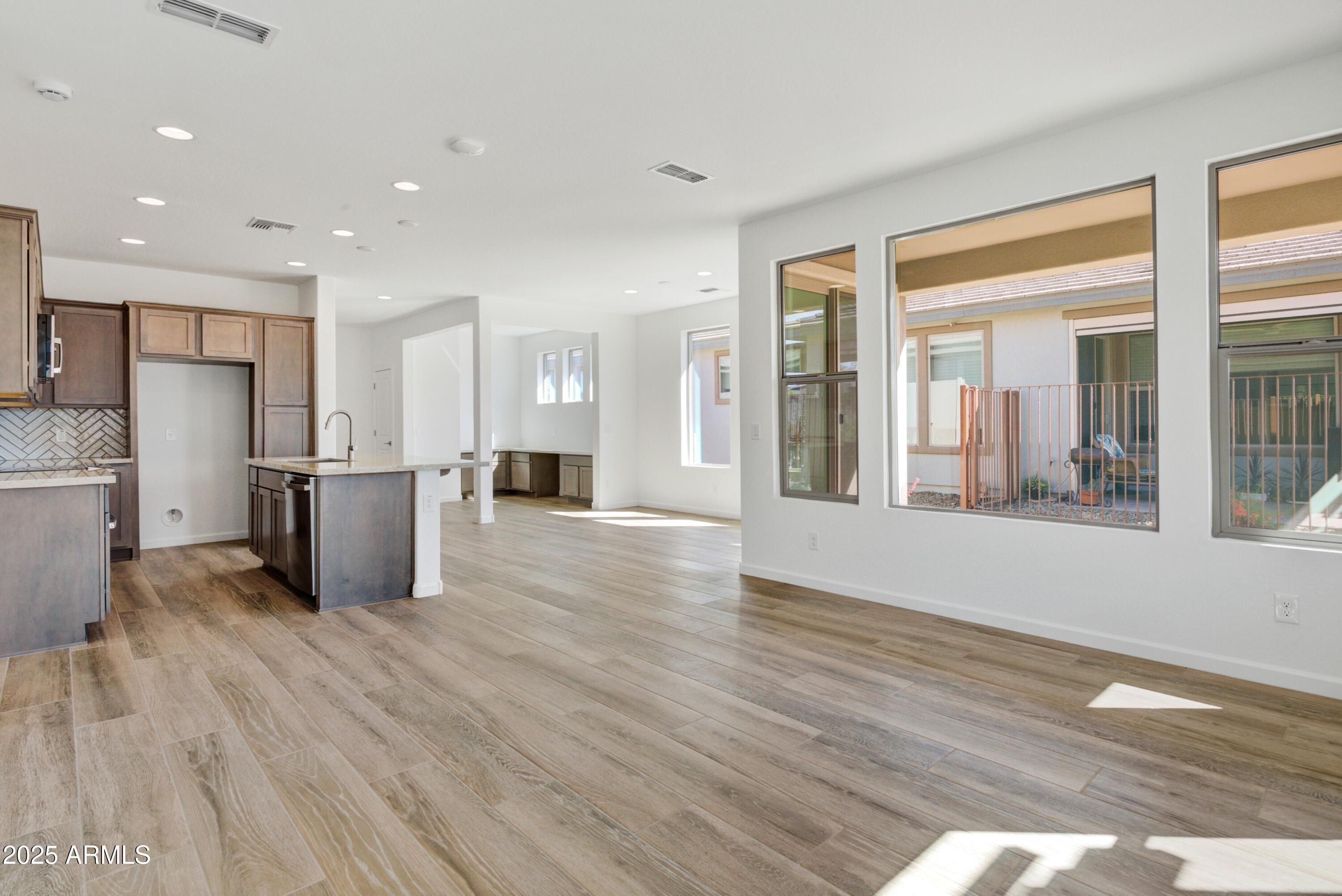 Shea-built Evia in the Resort Collection at Wickenburg Ranch. 1,552 sq ft, 2 bed, 2 bath, 2-car garage. Duet-style home w/HOA-maintained landscape. Quartz counters (Oxide & Slate Grey), Regal White soft-close cabinets, built-in stainless appliances, under-cab lighting & pendant lights. Great room opens to covered patio w/12' sliding glass wall. Spa-style primary bath w/heavy glass enclosure, ceramic tile & chrome fixtures. Includes upgraded flooring, custom paint, Smart Space laundry, AV wall sleeves, floor outlet & added electrical. Resort-style amenities just minutes away. Modern sophistication meets low-maintenance luxury in this Shea-built Evia floor plan, located in the Resort Collection at Wickenburg Ranch. This duet-style home offers 1,552 sq ft of open-concept living with 2 bedrooms, 2 baths, and a 2-car garageall on a beautifully maintained homesite with landscape service included in the HOA. Upgrades throughout include quartz counters in both kitchen (Oxide) and baths (Slate Grey), full overlay Regal White cabinetry with soft-close drawers and doors, under-cabinet lighting, and stainless built-in appliances. The great room opens to a large covered patio through a 12' multi-slide glass door, creating the perfect indoor-outdoor connection. The spa-like primary bath features a heavy glass enclosure, ceramic tile, and chrome fixtures. Other highlights include custom paint, upgraded flooring, pendant lighting, floor outlet, Smart Space laundry, and added electrical and AV enhancements.