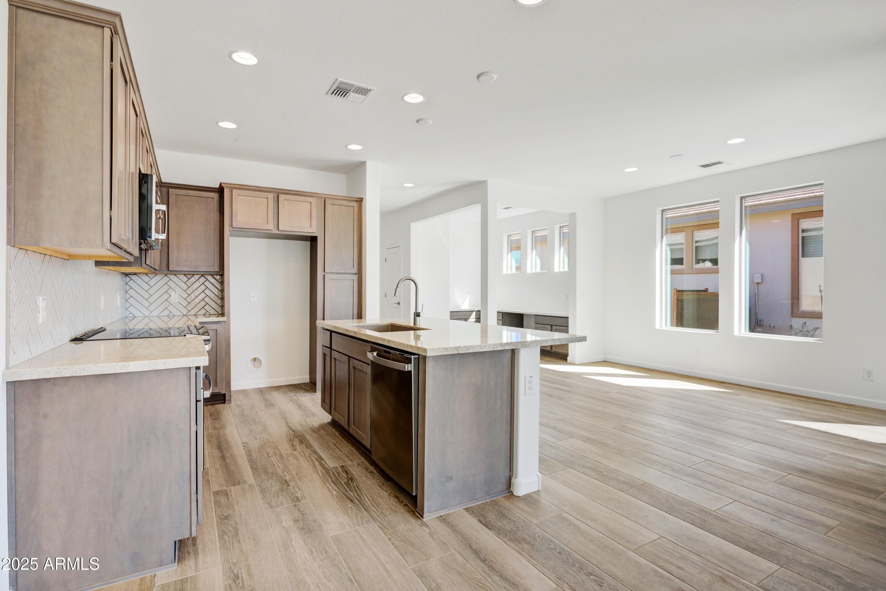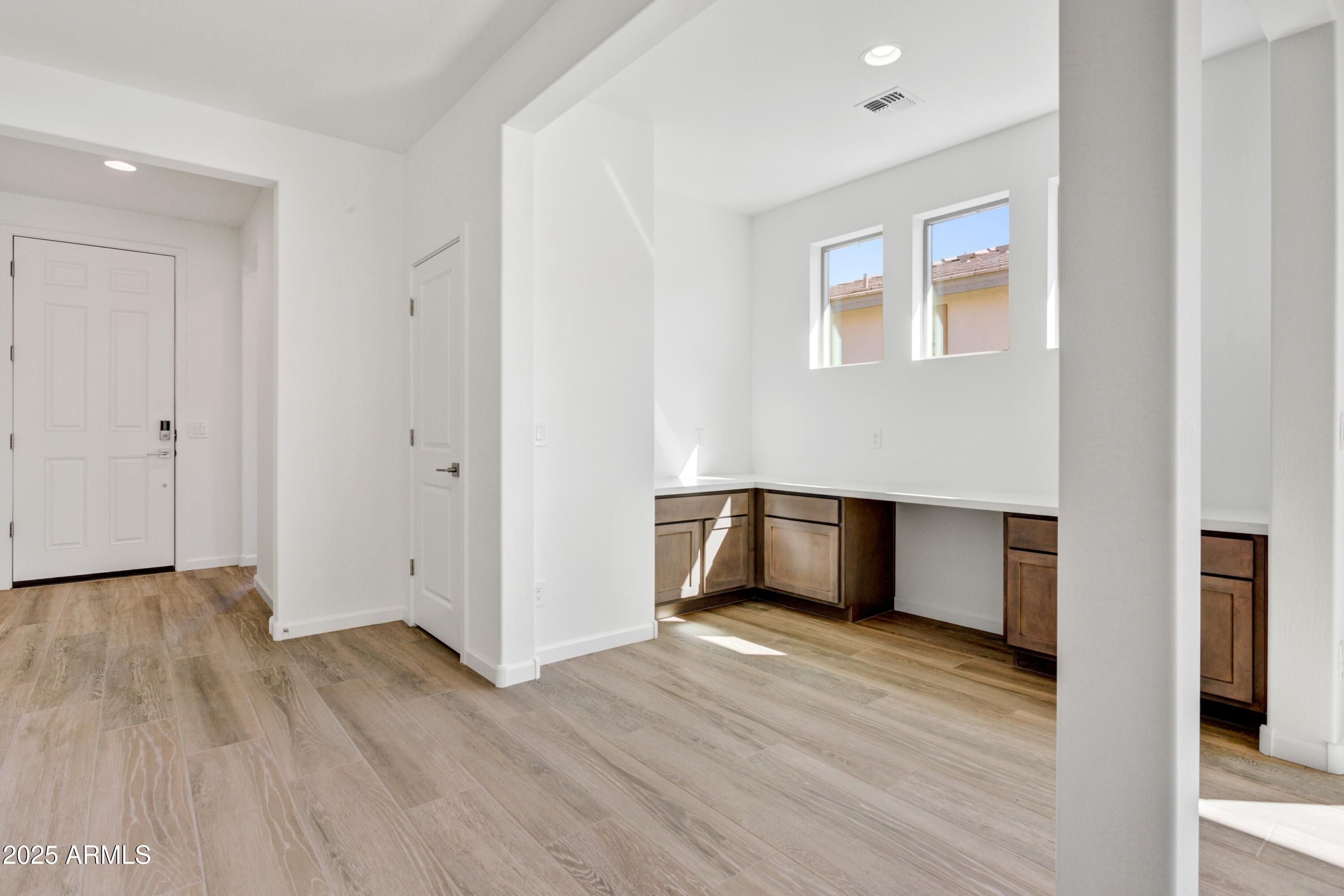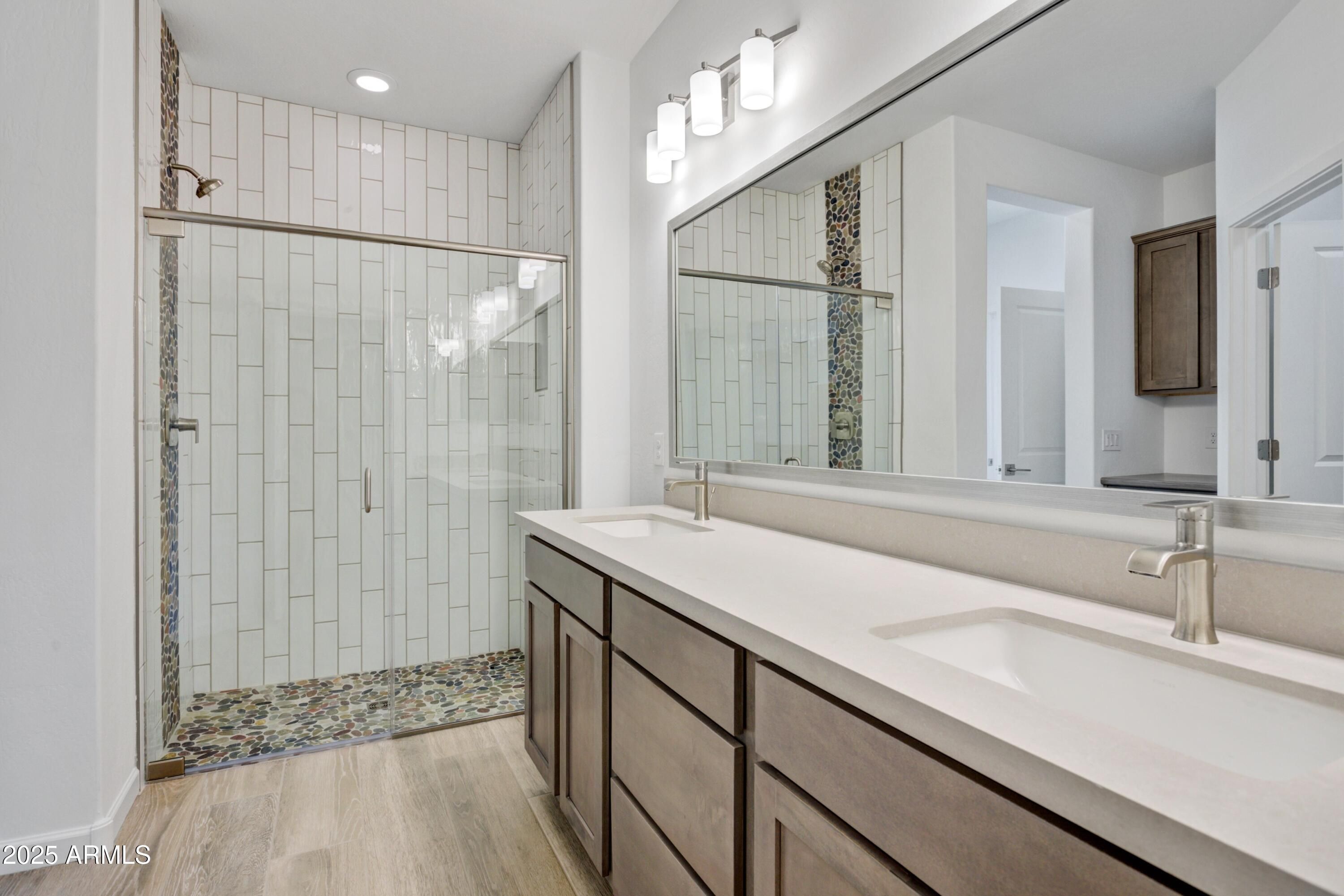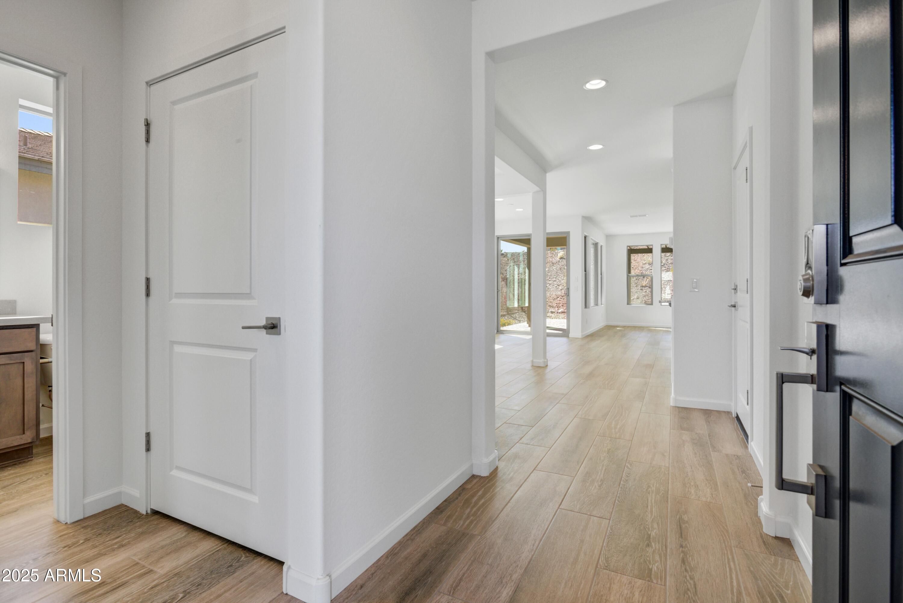 Shea-built Evia in the Resort Collection at Wickenburg Ranch. 1,552 sq ft, 2 bed, 2 bath, 2-car garage. Duet-style home w/HOA-maintained landscape. Quartz counters (Oxide & Slate Grey), Regal White soft-close cabinets, built-in stainless appliances, under-cab lighting & pendant lights. Great room opens to covered patio w/12' sliding glass wall. Spa-style primary bath w/heavy glass enclosure, ceramic tile & chrome fixtures. Includes upgraded flooring, custom paint, Smart Space laundry, AV wall sleeves, floor outlet & added electrical. Resort-style amenities just minutes away. Modern sophistication meets low-maintenance luxury in this Shea-built Evia floor plan, located in the Resort Collection at Wickenburg Ranch. This duet-style home offers 1,552 sq ft of open-concept living with 2 bedrooms, 2 baths, and a 2-car garageall on a beautifully maintained homesite with landscape service included in the HOA. Upgrades throughout include quartz counters in both kitchen (Oxide) and baths (Slate Grey), full overlay Regal White cabinetry with soft-close drawers and doors, under-cabinet lighting, and stainless built-in appliances. The great room opens to a large covered patio through a 12' multi-slide glass door, creating the perfect indoor-outdoor connection. The spa-like primary bath features a heavy glass enclosure, ceramic tile, and chrome fixtures. Other highlights include custom paint, upgraded flooring, pendant lighting, floor outlet, Smart Space laundry, and added electrical and AV enhancements.
