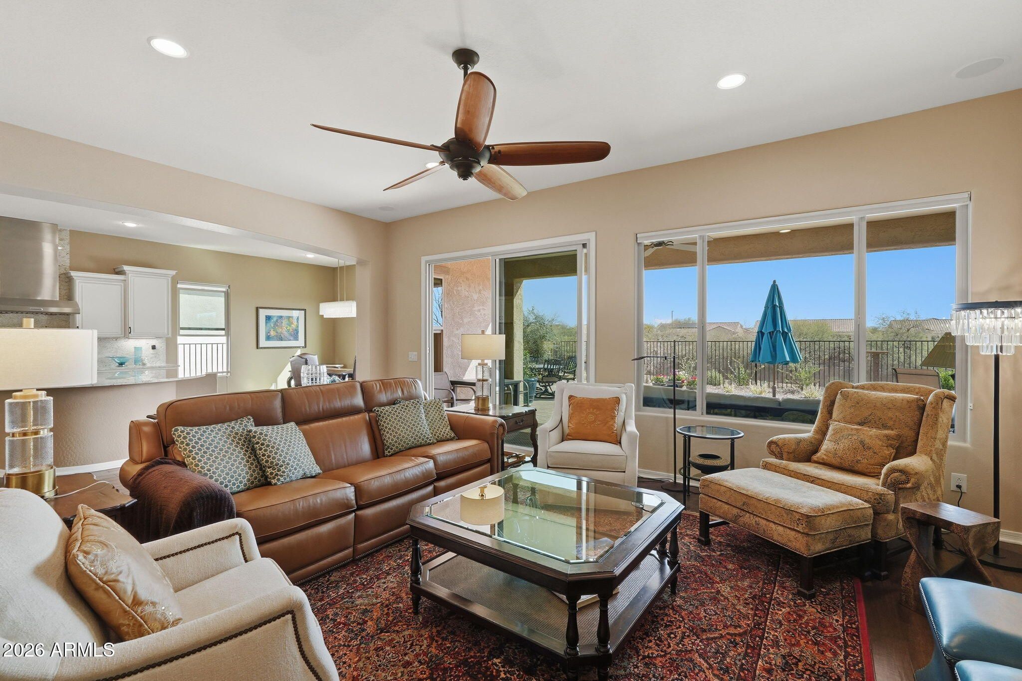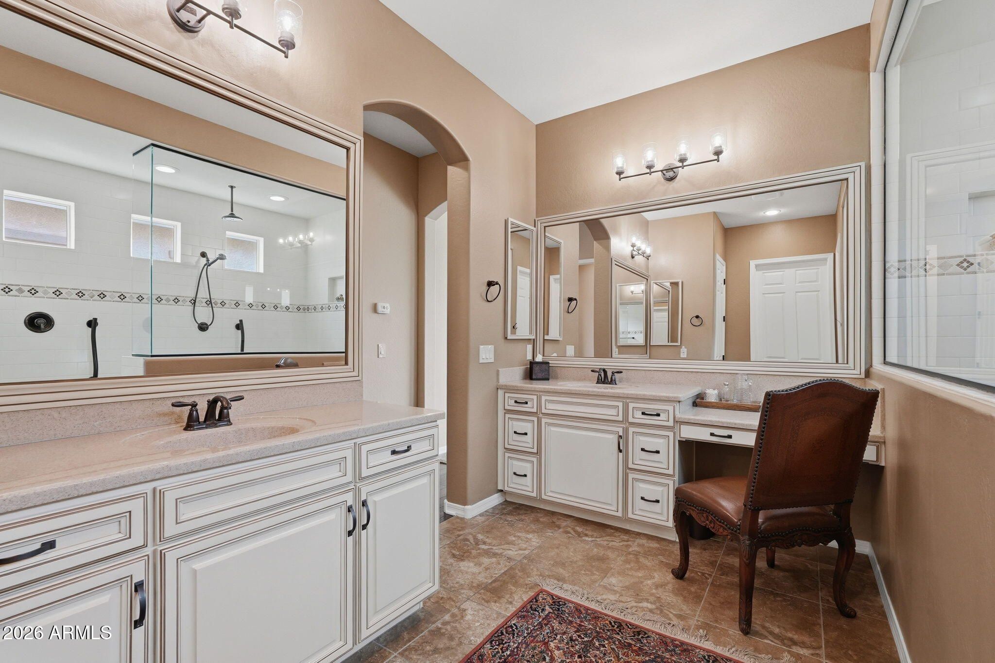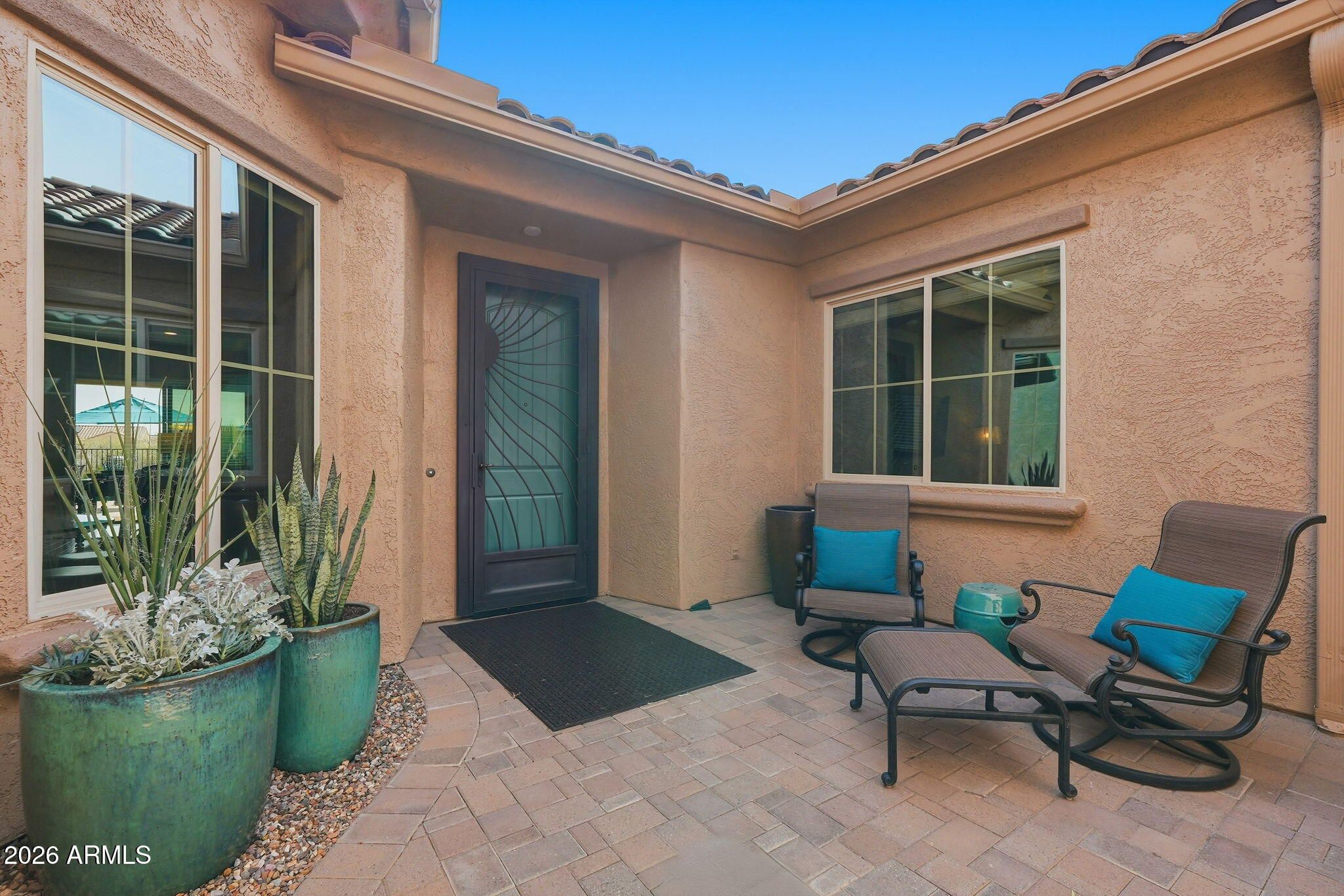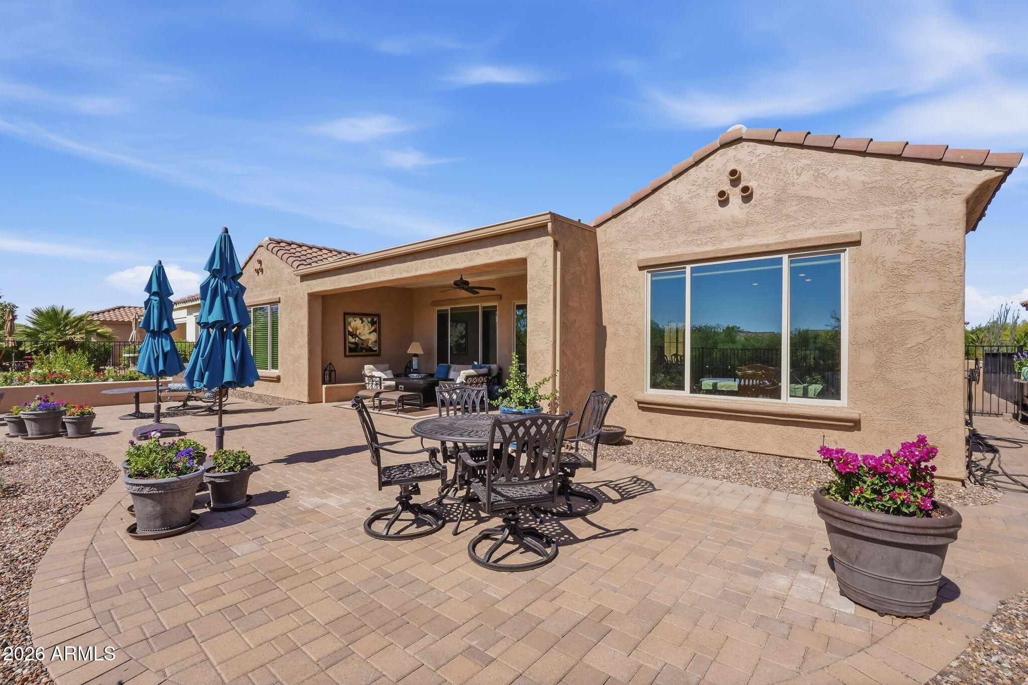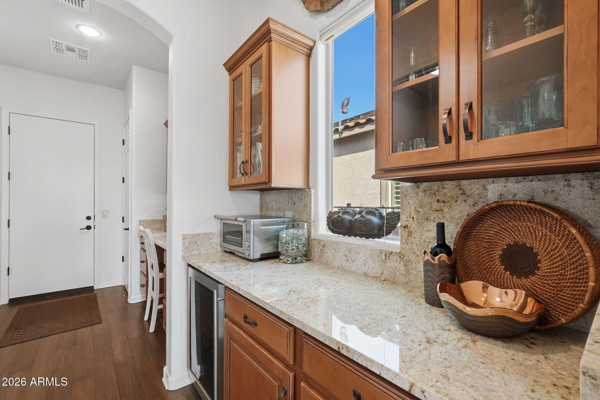 Perfectly positioned on a premium double wash lot with no rear neighbors, this home offers uninterrupted desert views, remarkable privacy, and a setting that feels both expansive and serene. With over $70K in recent improvements, you've found your oasis! Offering 2 bedrooms, 2.5 baths, and a versatile bonus space, this home strikes the perfect balance of refined interior living and exceptional outdoor entertainment, crafted perfectly for those seeking exceptional value, privacy, quality, and a truly elevated desert lifestyle. Experience a rare blend of timeless interior sophistication and resort-caliber outdoor living in this extraordinary Journey model, ideally located in Sun City Anthem at Merrill Ranch. From the moment you arrive, the paved front courtyard sets a warm, welcoming tone for quiet mornings or intimate gatherings. Out back, the home truly shines. The east-facing backyard is the ideal environment for year-round enjoyment. Thoughtfully designed for entertaining, the space features an extended paver patio, complemented by a newly added raised garden/flower bed--all set against the backdrop of open desert and complete privacy. This is outdoor living at its finest. This is more than a home; it's a statement in comfort, design, and effortless luxury living. Inside, the home reveals a light-filled, open-concept great room where Mannington wood floors, 10-foot ceilings, and 8-foot doors create a sense of volume and understated luxury. The space is enhanced by carefully curated lighting, including striking Z-Lite "Glacier" chandeliers that deliver both ambiance and architectural presence. The kitchen is designed for those who appreciate both beauty and function--featuring cream-glazed Oakcraft cabinetry, soft-close doors and drawers, and extensive pull-outs throughout. A large walk-in pantry is complemented by two butler pantries, including one with a wine refrigerator, creating a seamless flow for entertaining at any scale. The owner's suite offers a tranquil escape, perfectly positioned to capture peaceful wash views, blending comfort with quiet luxury. Additional features elevate everyday living, including a dedicated laundry room with full cabinetry and utility sink, as well as an air-conditioned extended garage with a separate golf cart garage--ideal for both practicality and lifestyle flexibility. If you're seeking a home with refined desert luxury, elevated indoor elegance & Resort-style outdoor living, you have to come see this home!