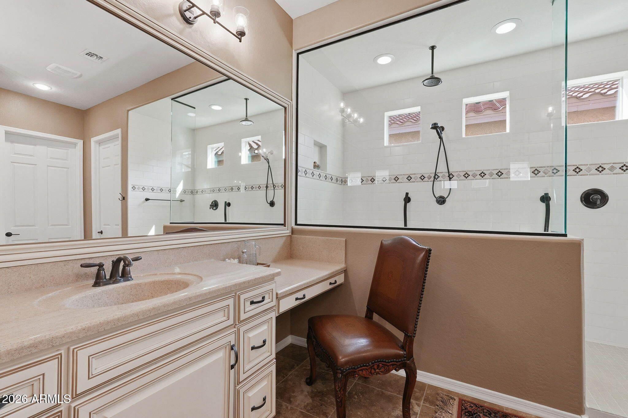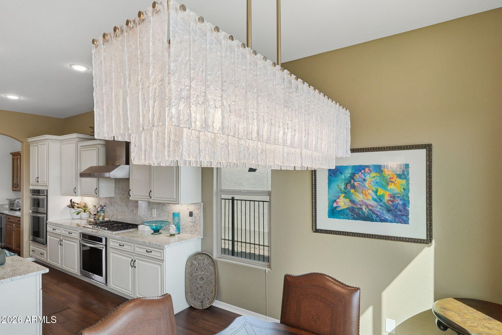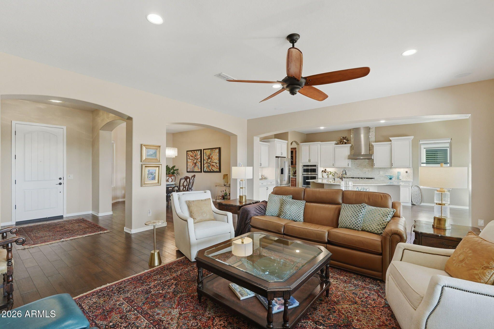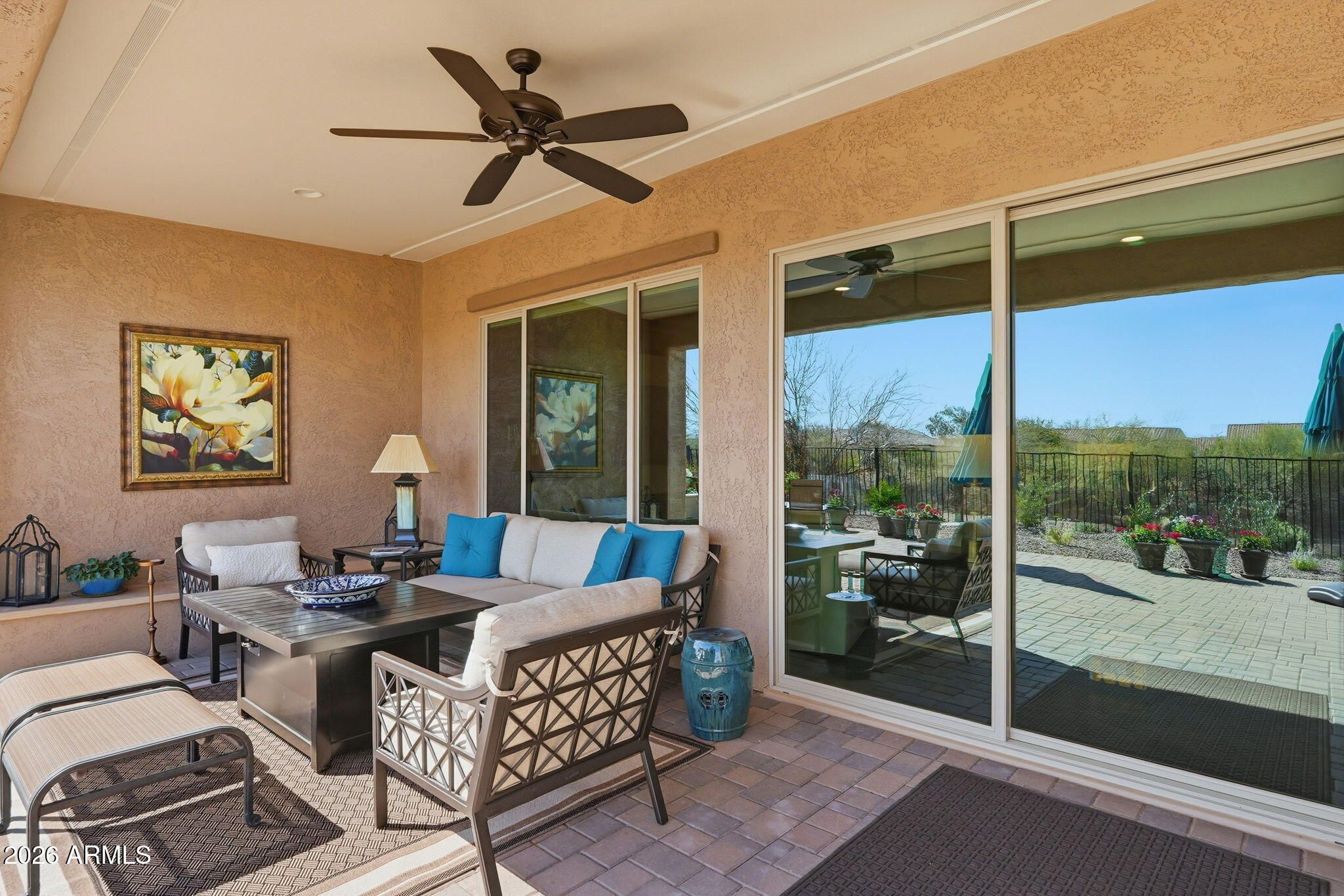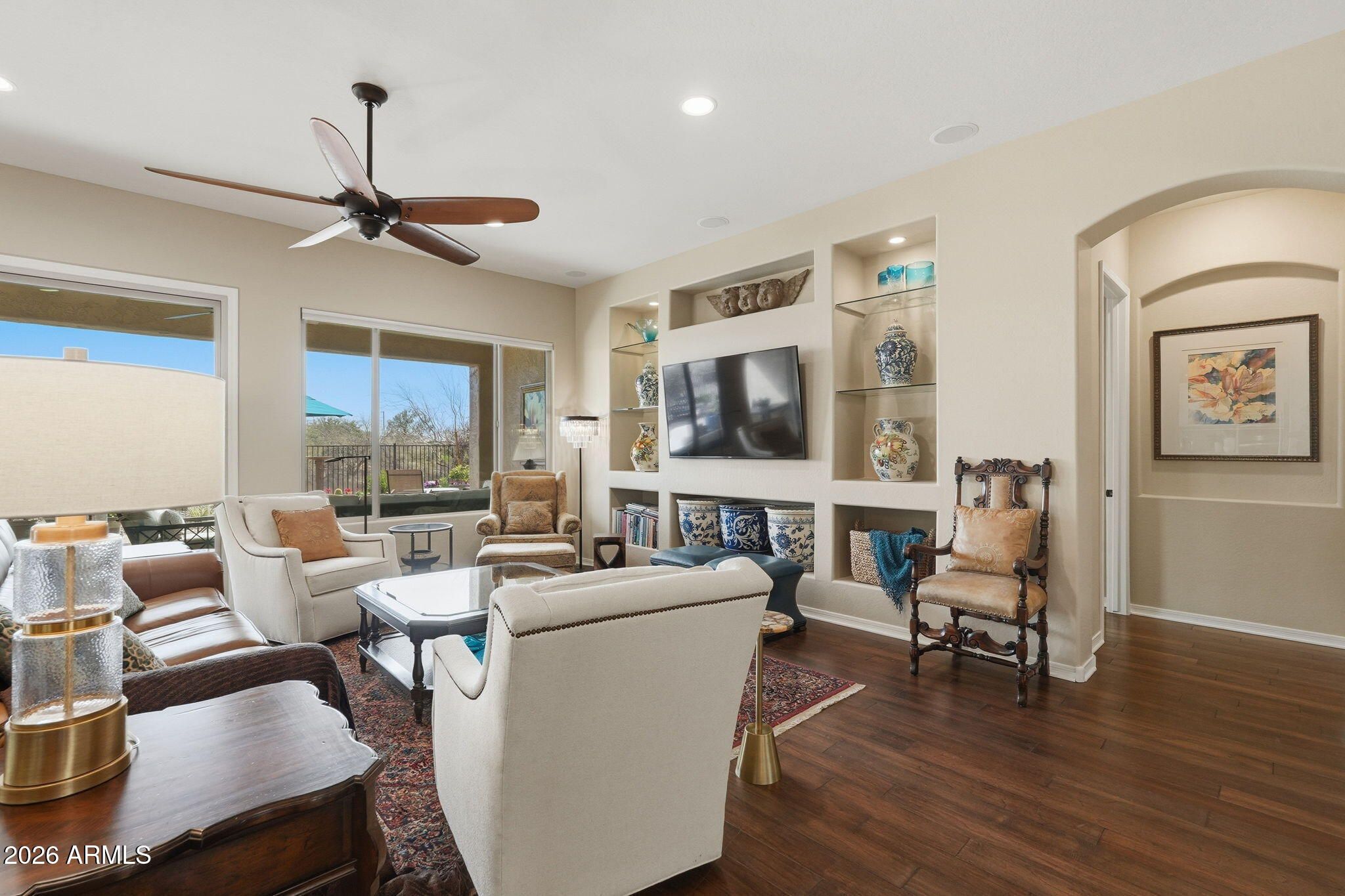 Perfectly positioned on a premium double wash lot with no rear neighbors, this home offers uninterrupted desert views, remarkable privacy, and a setting that feels both expansive and serene. With over $70K in recent improvements, you've found your oasis! Offering 2 bedrooms, 2.5 baths, and a versatile bonus space, this home strikes the perfect balance of refined interior living and exceptional outdoor entertainment, crafted perfectly for those seeking exceptional value, privacy, quality, and a truly elevated desert lifestyle. Experience a rare blend of timeless interior sophistication and resort-caliber outdoor living in this extraordinary Journey model, ideally located in Sun City Anthem at Merrill Ranch. From the moment you arrive, the paved front courtyard sets a warm, welcoming tone for quiet mornings or intimate gatherings. Out back, the home truly shines. The east-facing backyard is the ideal environment for year-round enjoyment. Thoughtfully designed for entertaining, the space features an extended paver patio, complemented by a newly added raised garden/flower bed--all set against the backdrop of open desert and complete privacy. This is outdoor living at its finest. This is more than a home; it's a statement in comfort, design, and effortless luxury living. Inside, the home reveals a light-filled, open-concept great room where Mannington wood floors, 10-foot ceilings, and 8-foot doors create a sense of volume and understated luxury. The space is enhanced by carefully curated lighting, including striking Z-Lite "Glacier" chandeliers that deliver both ambiance and architectural presence. The kitchen is designed for those who appreciate both beauty and function--featuring cream-glazed Oakcraft cabinetry, soft-close doors and drawers, and extensive pull-outs throughout. A large walk-in pantry is complemented by two butler pantries, including one with a wine refrigerator, creating a seamless flow for entertaining at any scale. The owner's suite offers a tranquil escape, perfectly positioned to capture peaceful wash views, blending comfort with quiet luxury. Additional features elevate everyday living, including a dedicated laundry room with full cabinetry and utility sink, as well as an air-conditioned extended garage with a separate golf cart garage--ideal for both practicality and lifestyle flexibility. If you're seeking a home with refined desert luxury, elevated indoor elegance & Resort-style outdoor living, you have to come see this home!