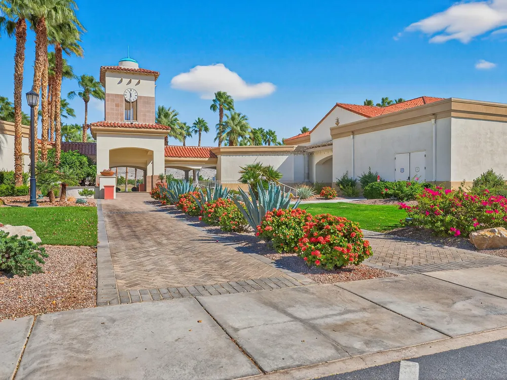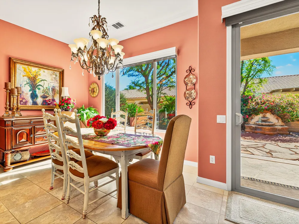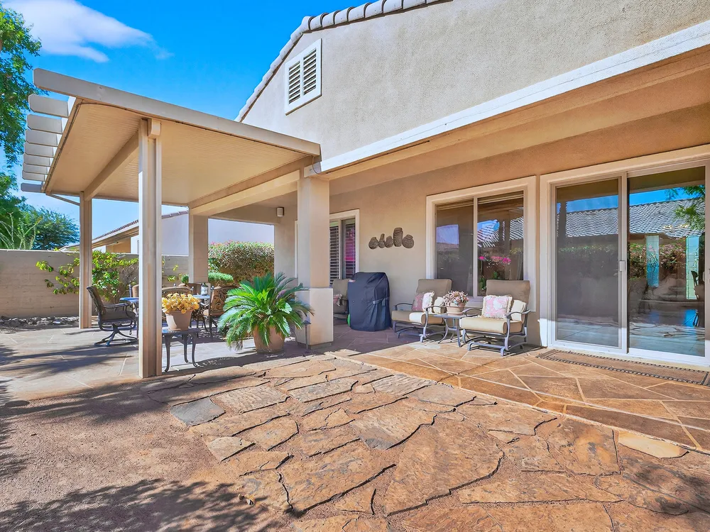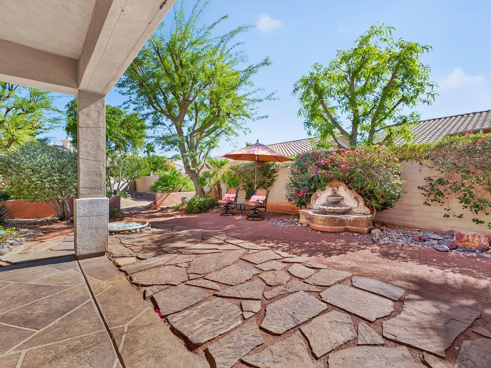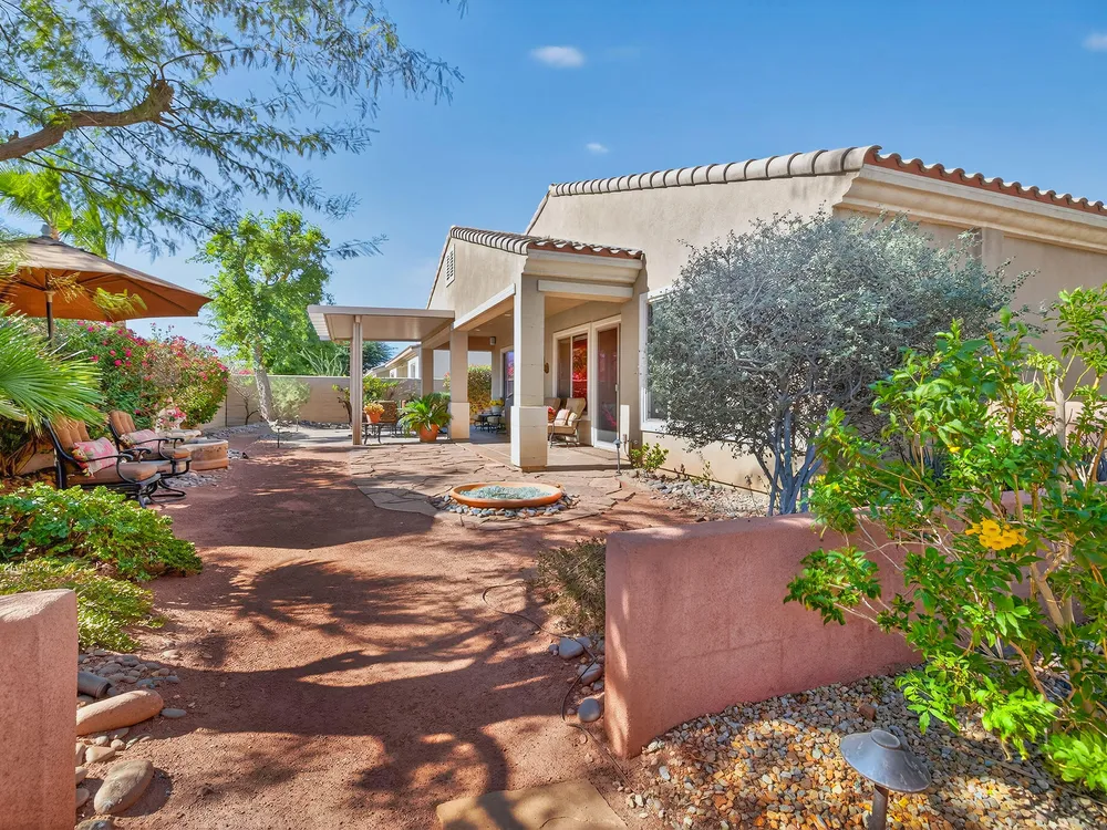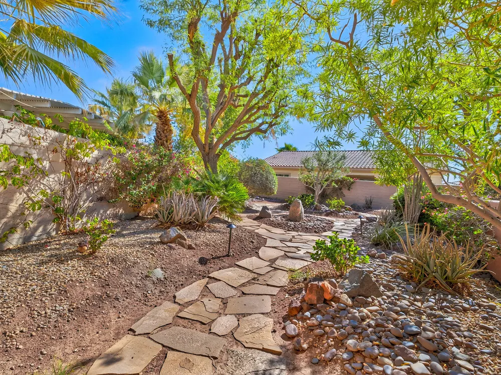 Experience the perfect blend of gracious resort-style living, privacy and lovely outdoor areas in a home designed for comfort and ease. Discover refined comfort and privacy in this beautifully appointed 2-bedroom plus office/den pride-of-ownership home. The open Great Room floor plan creates an easy flow between living, dining, and entertaining spaces, filled with natural light and tasteful design details. The primary suite is a peaceful retreat with a spacious walk-in closet featuring custom built-ins and access to the serene backyard with the large covered patio.. The expansive outdoor area is beautifully landscaped, with multiple private seating areas & meandering flagstone pathways ideal for entertaining or quiet relaxation. You'll also find a dramatic fire-n-ice firepit and a soothing water feature . Additional highlights include newer AC, newer stainless steel kitchen, newer 50 gal hot water heater, chandeliers, beautiful beveled glass door, a garage with epoxy floors, quality finishes and tasteful décor. A cement pathway from the front to the backyard was added for ease of access. Offered fully furnished, including most art and accessories, this home is ready for your enjoyment. . Residents of this gated, over 55 community enjoy country club amenities, including golf, tennis, pickleball, bocce ball fitness centers, swimming pools, and over 50 social clubs—all within a secure and beautifully maintained setting.