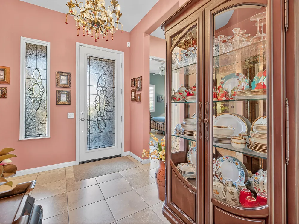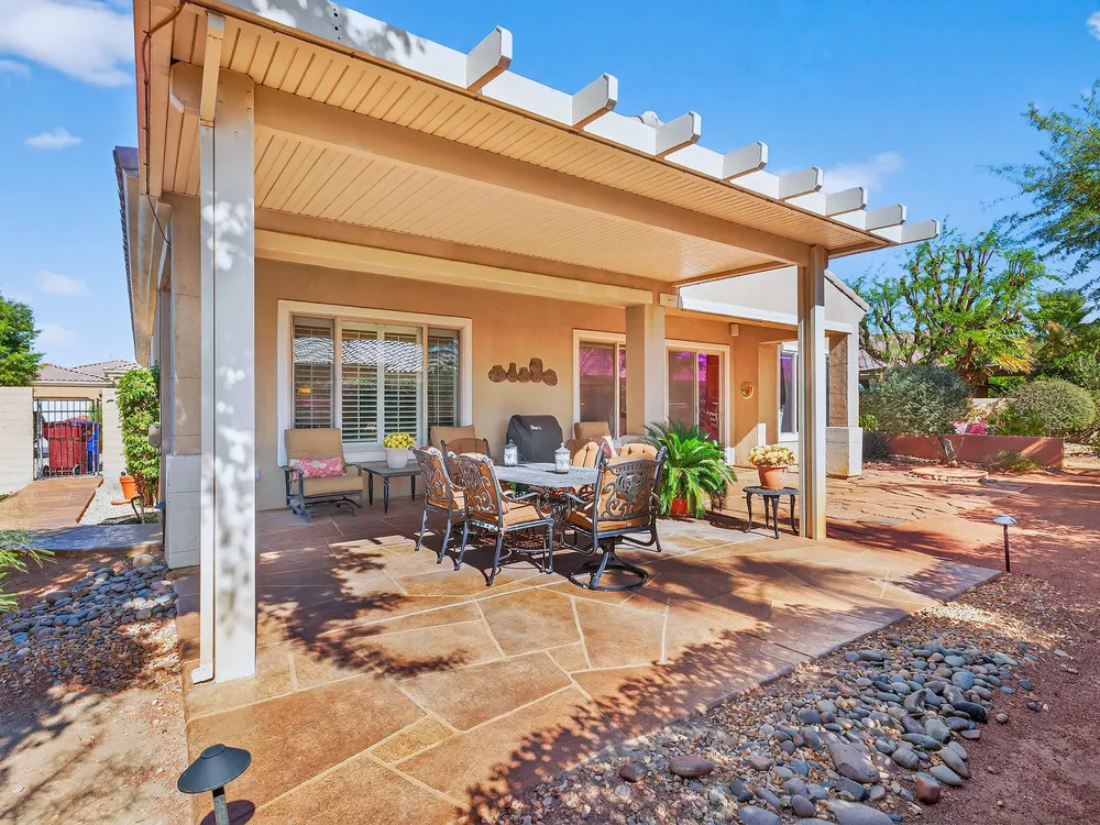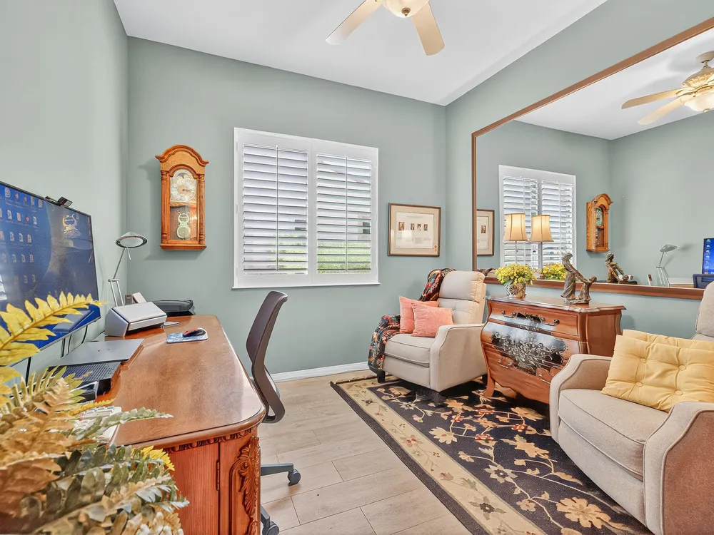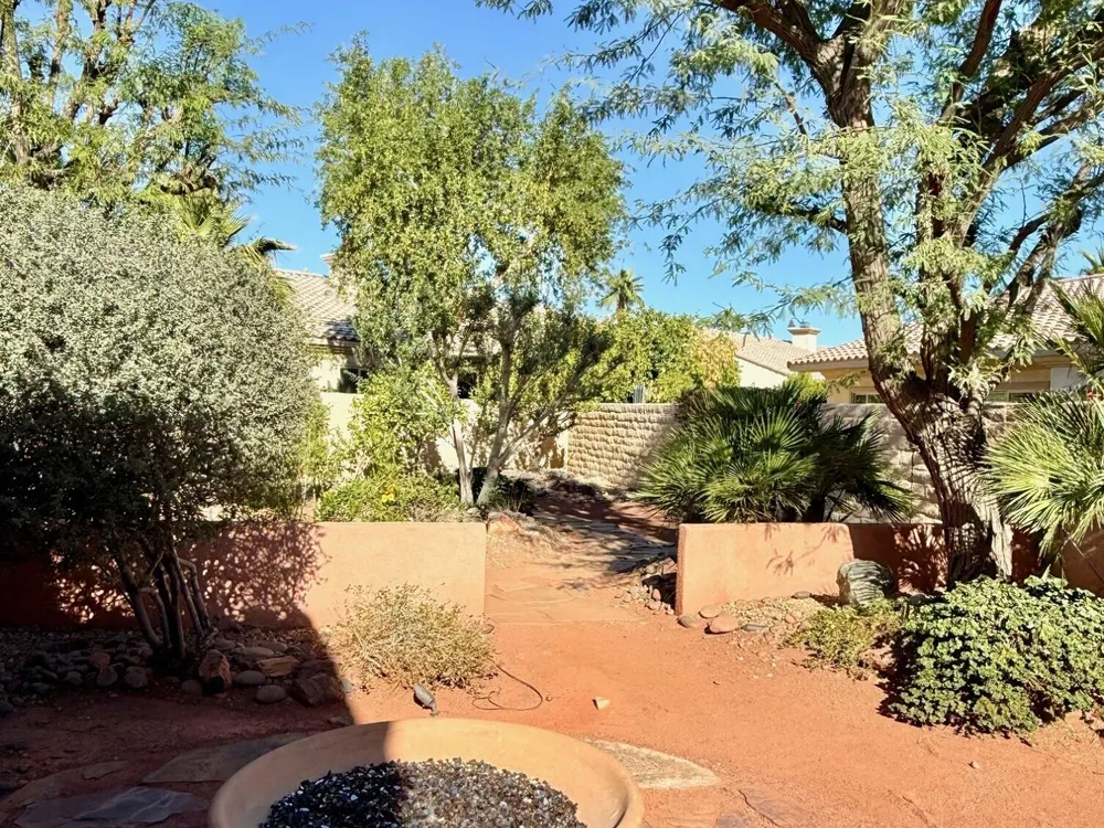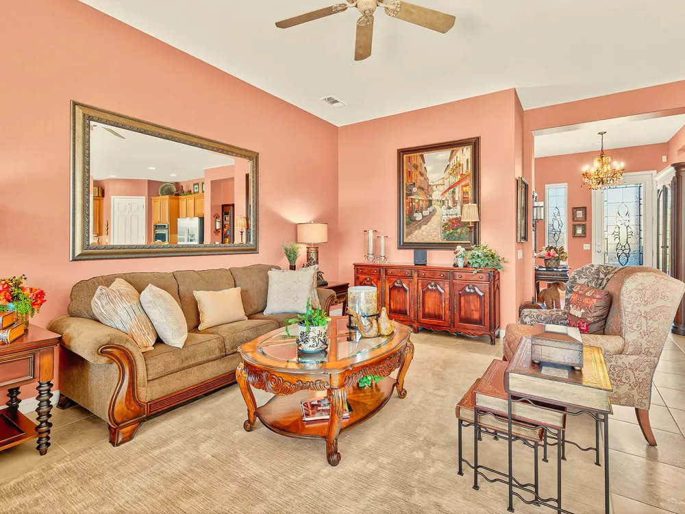 Experience the perfect blend of gracious resort-style living, privacy and lovely outdoor areas in a home designed for comfort and ease. Discover refined comfort and privacy in this beautifully appointed 2-bedroom plus office/den pride-of-ownership home. The open Great Room floor plan creates an easy flow between living, dining, and entertaining spaces, filled with natural light and tasteful design details. The primary suite is a peaceful retreat with a spacious walk-in closet featuring custom built-ins and access to the serene backyard with the large covered patio.. The expansive outdoor area is beautifully landscaped, with multiple private seating areas & meandering flagstone pathways ideal for entertaining or quiet relaxation. You'll also find a dramatic fire-n-ice firepit and a soothing water feature . Additional highlights include newer AC, newer stainless steel kitchen, newer 50 gal hot water heater, chandeliers, beautiful beveled glass door, a garage with epoxy floors, quality finishes and tasteful décor. A cement pathway from the front to the backyard was added for ease of access. Offered fully furnished, including most art and accessories, this home is ready for your enjoyment. . Residents of this gated, over 55 community enjoy country club amenities, including golf, tennis, pickleball, bocce ball fitness centers, swimming pools, and over 50 social clubs—all within a secure and beautifully maintained setting.