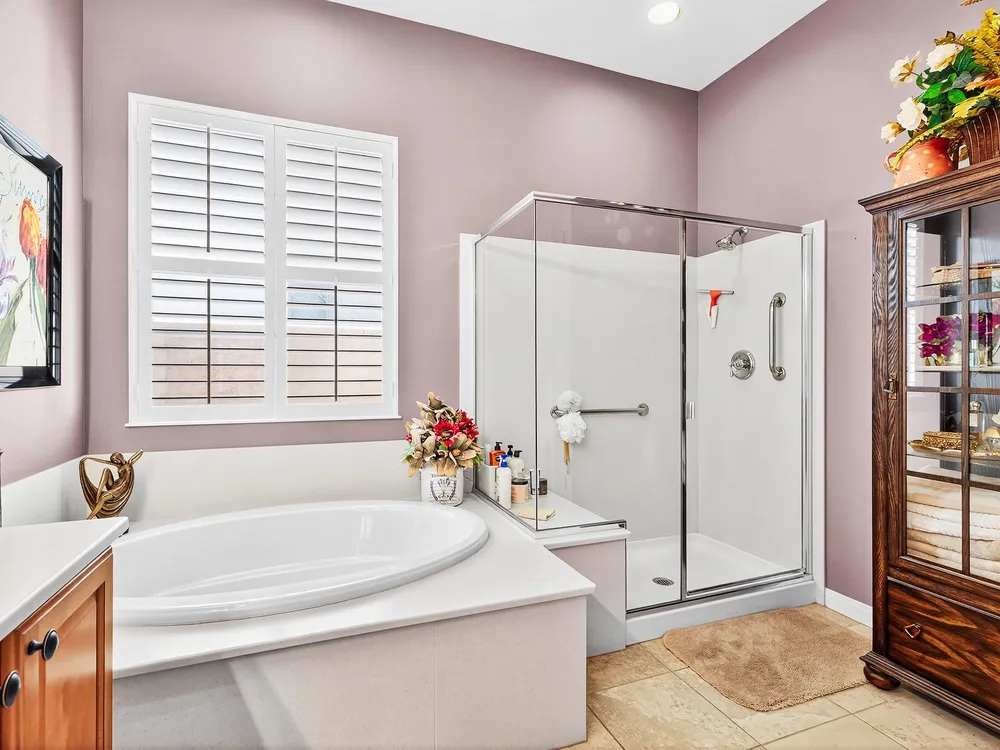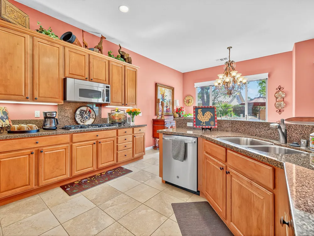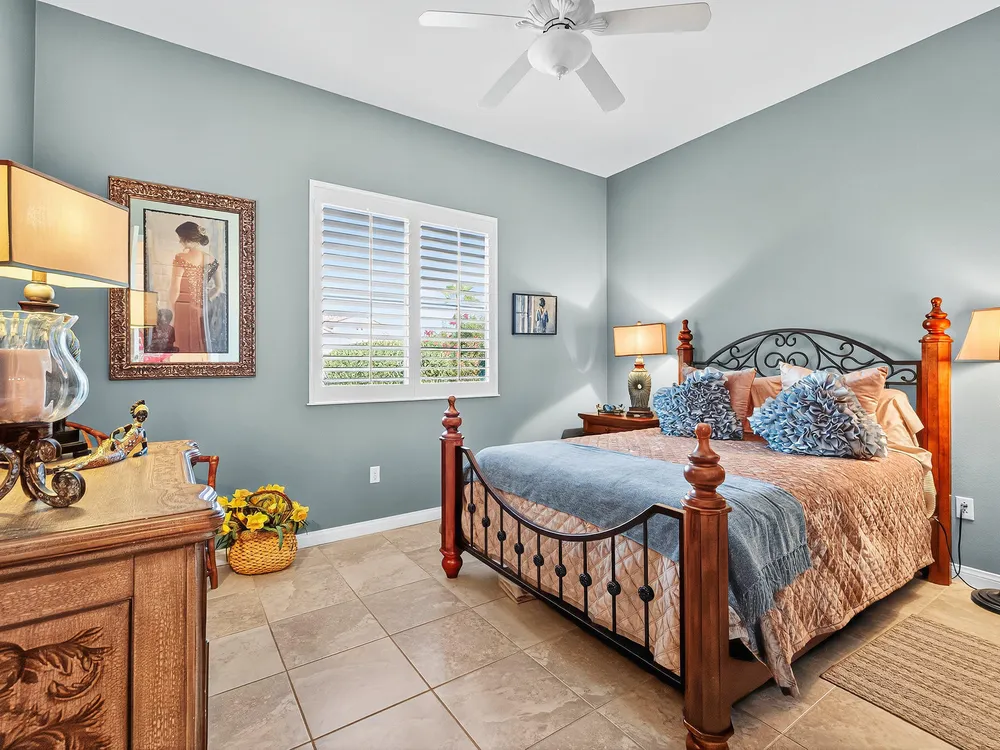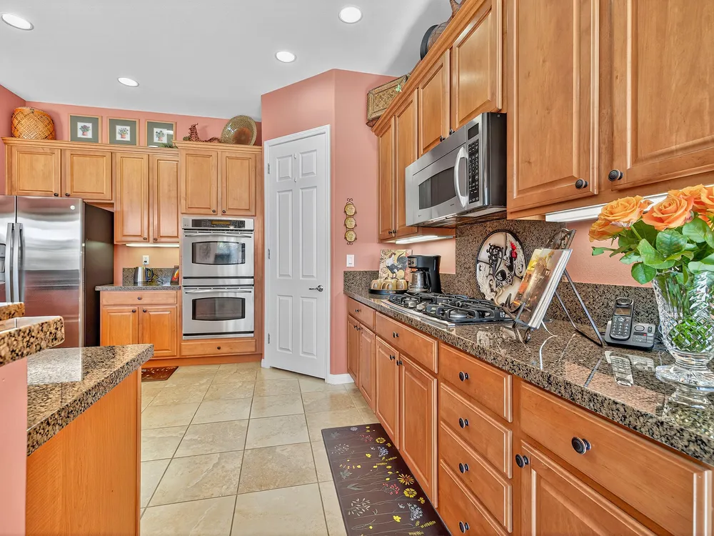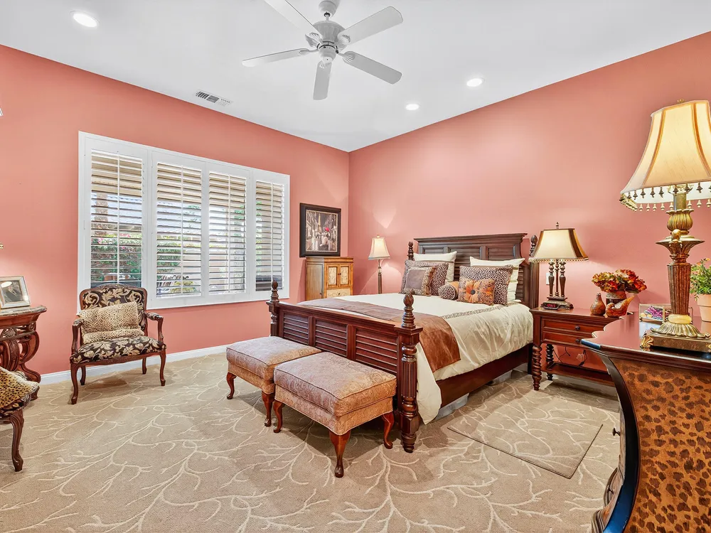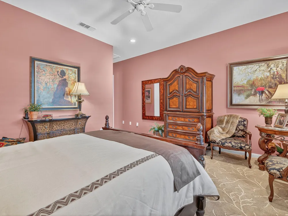 Experience the perfect blend of gracious resort-style living, privacy and lovely outdoor areas in a home designed for comfort and ease. Discover refined comfort and privacy in this beautifully appointed 2-bedroom plus office/den pride-of-ownership home. The open Great Room floor plan creates an easy flow between living, dining, and entertaining spaces, filled with natural light and tasteful design details. The primary suite is a peaceful retreat with a spacious walk-in closet featuring custom built-ins and access to the serene backyard with the large covered patio.. The expansive outdoor area is beautifully landscaped, with multiple private seating areas & meandering flagstone pathways ideal for entertaining or quiet relaxation. You'll also find a dramatic fire-n-ice firepit and a soothing water feature . Additional highlights include newer AC, newer stainless steel kitchen, newer 50 gal hot water heater, chandeliers, beautiful beveled glass door, a garage with epoxy floors, quality finishes and tasteful décor. A cement pathway from the front to the backyard was added for ease of access. Offered fully furnished, including most art and accessories, this home is ready for your enjoyment. . Residents of this gated, over 55 community enjoy country club amenities, including golf, tennis, pickleball, bocce ball fitness centers, swimming pools, and over 50 social clubs—all within a secure and beautifully maintained setting.