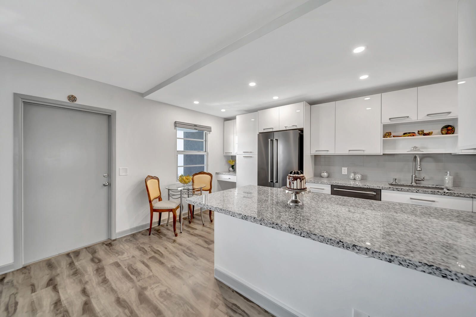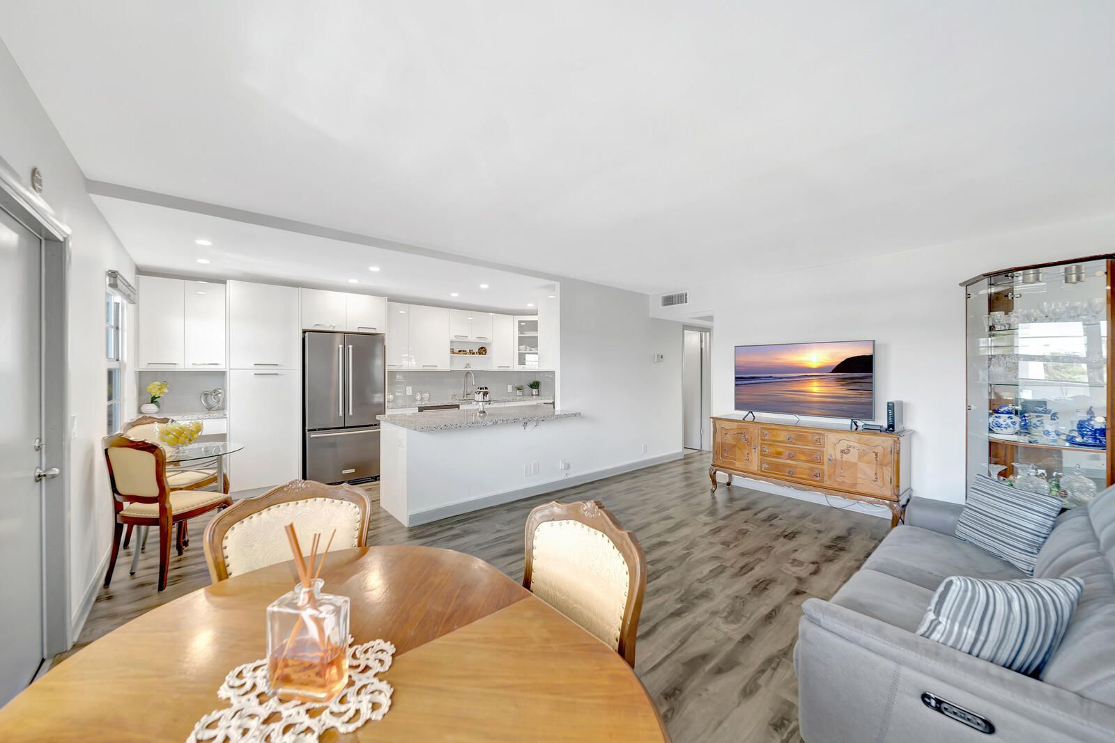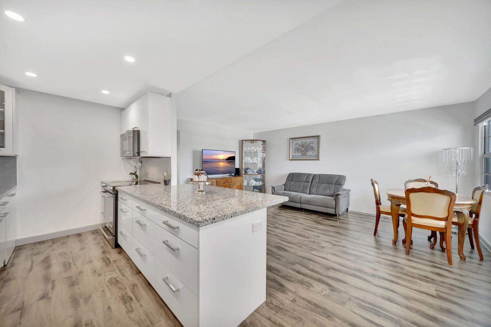 Move right in to this 2/1.5 recently renovated bright penthouse condo with magnificent lake views and prime location just steps away from the pool. Enjoy an expanded open concept designer kitchen with soft close cabinets, granite countertops, black stainless KitchenAid appliances and bright LED recessed lighting to complement. Luxury vinyl flooring in all living areas. All closets complete with organizers, power operated zebra shades and large fans for comfort. The electrical panel has been replaced as well. All windows, sliders and doors have been upgraded to storm impact. Bathrooms completely redone with new vanities, tile flooring, and walk-in shower with glass frameless doors. Relax and enjoy sunsets from your large screened-in balcony that offers the most amazing panoramic lake views The building provides an elevator, outside storage room, and laundry facilities. Century Village is a meticulously manicured, gated 55+ community offering a vibrant lifestyle with endless activities. Residents enjoy a renovated clubhouse, fitness studio, theater, tennis courts, pickleball, bocce ball, and scenic walking trails. The community also features beautifully landscaped grounds, and for added convenience, it offers on-site transportation to nearby shopping centers and grocery stores. The HOA includes internet, cable, and water. Located in the heart of Boca Raton, the property is just minutes away from premier shopping destinations like Mizner Park and Town Center Mall, as well as a variety of dining options and cultural attractions. The nearby Gumbo Limbo Nature Center and Red Reef Park offer opportunities for outdoor recreation and exploration. With easy access to major highways and public transportation. Schedule your showing today and don't miss out!