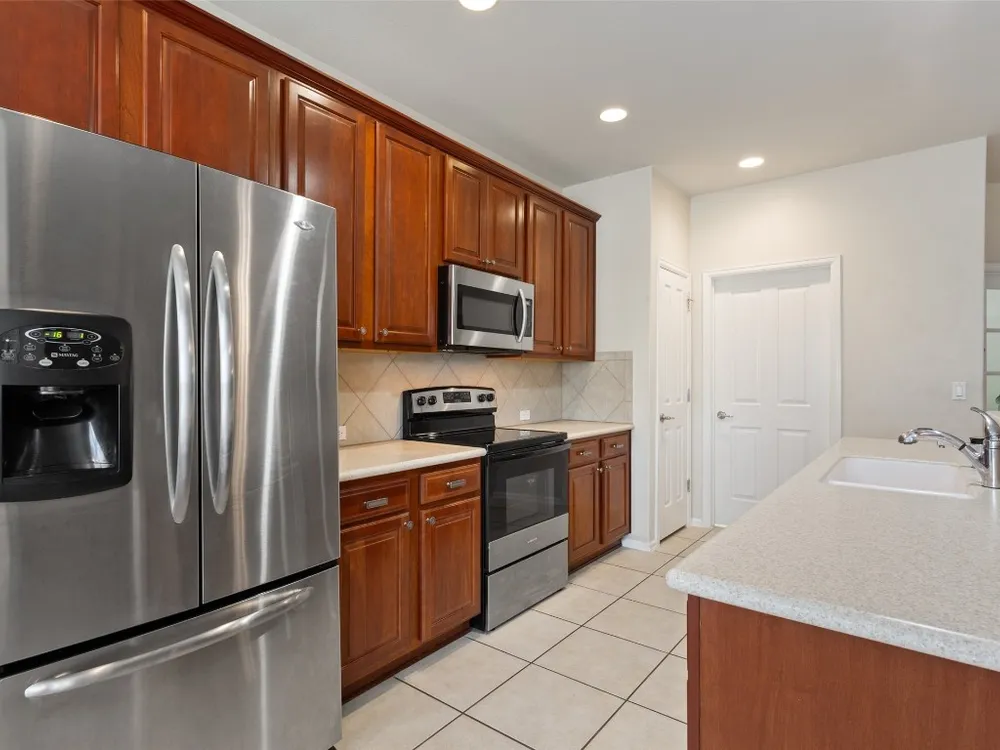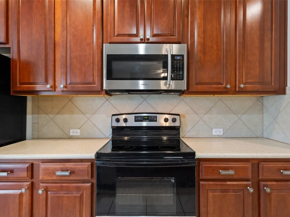 - Dishwasher, Electric Oven, Electric Range, Free-Standing Refrigerator, Disposal, Microwave, Plumbed For Ice Maker, Self Cleaning Oven, Stainless Steel Appliance(s)