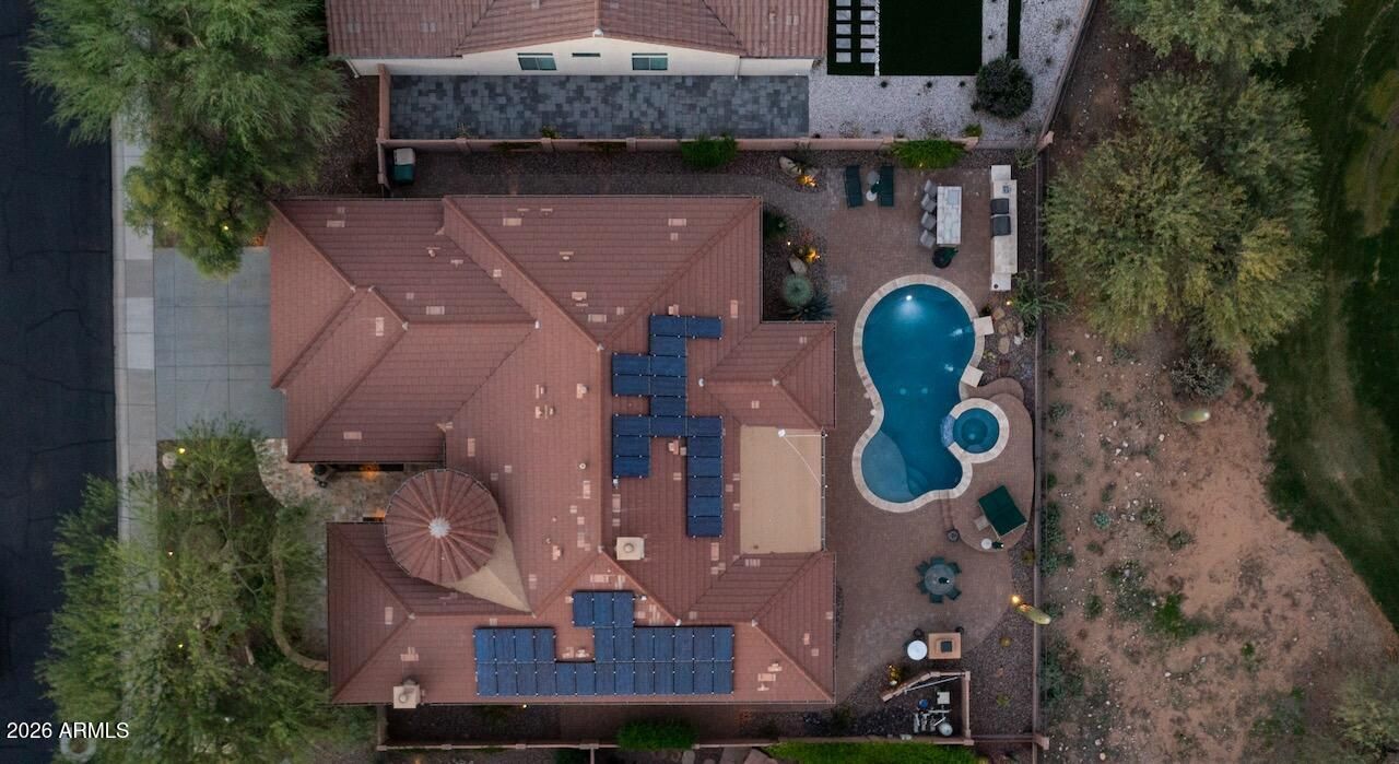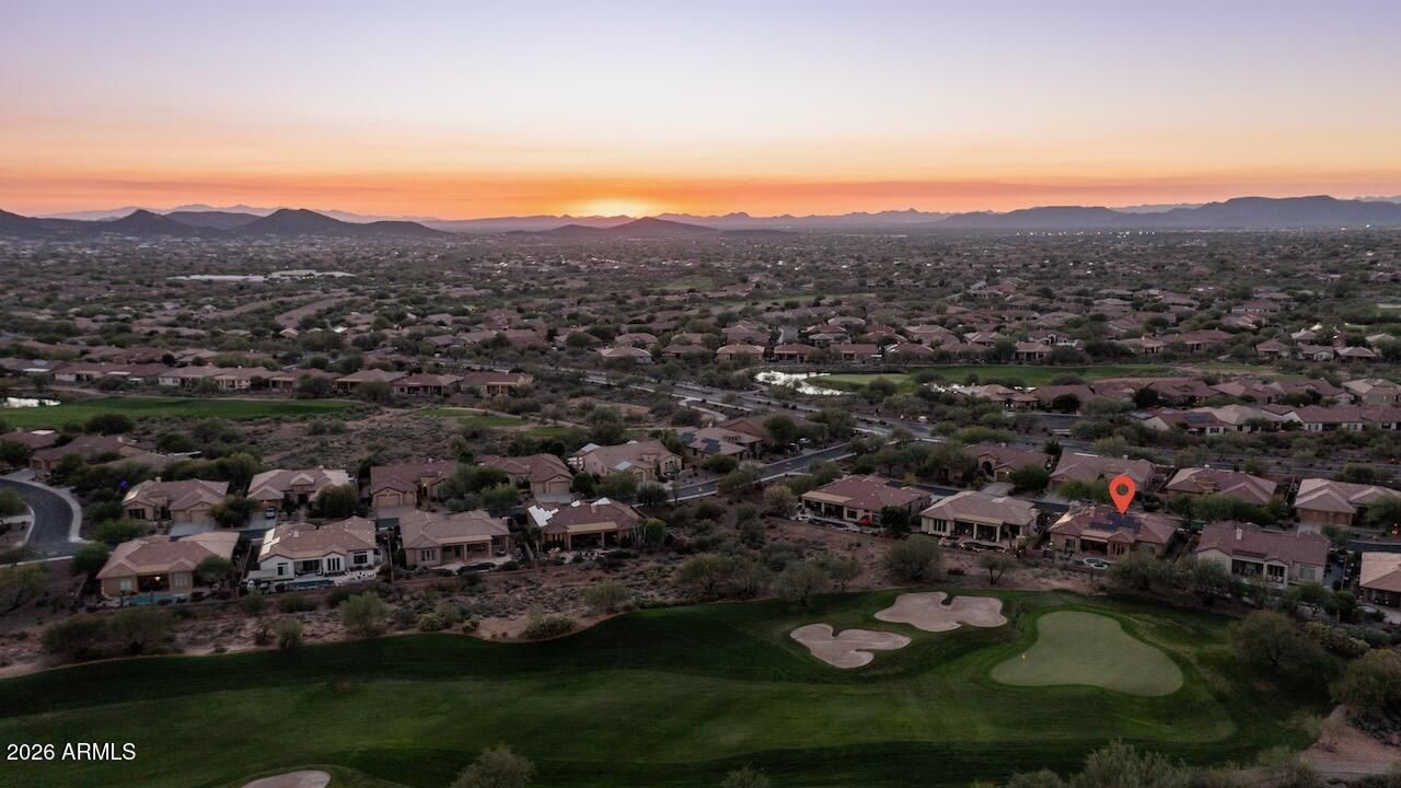 Special Financing Available - ask listing agents for details. Nestled along the 14th green of Anthem Country Club's Ironwood course, this elegant Monterey model showcases a split floor plan and thoughtful upgrades throughout. Inside, 12-foot ceilings, plantation shutters, and stone accents set a refined tone, while the open layout flows effortlessly from the warm wood-cabinet kitchen with granite counters, gas cooktop, double ovens, and wet bar to the inviting family room with fireplace and built-ins. The den offers its own fireplace and custom millwork, while the secondary bedrooms are smartly designed, with two sharing a Jack-and-Jill bath and another enjoying a private en suite with a newly updated walk-in shower. The primary suite captures sweeping golf course views, while the resort- style backyard invites year-round entertaining with pool, spa, built-in BBQ, electronic awning, and automated sunscreens. Owned solar, newer HVAC, and a temperature-controlled three-car garage complete this beautifully refined Anthem Country Club home.