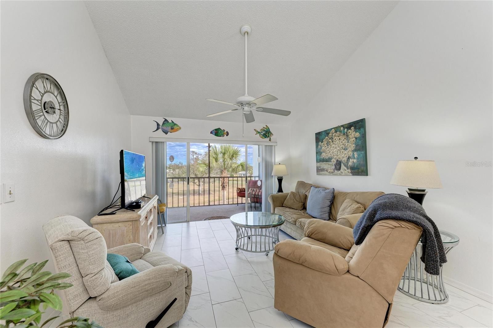 Penthouse unit featuring soaring ceilings and sweeping views of the golf course and lake. This charming 2-bedroom, 2-bathroom condo is offered fully turnkey and furnished, making it move-in ready. Recent updates include a new roof on the building, fresh exterior paint, and newer tile flooring throughout. Light and bright, the condo boasts large sliding glass doors that open to an oversized lanai—perfect for relaxing, entertaining, and taking in the beautiful surroundings that make The Plantation Golf & Country Club so special. Both bedrooms feature en-suite bathrooms and are spacious enough to comfortably accommodate king-size beds. The primary suite includes an updated shower, new flooring, and a very large walk-in closet ideal for storage. A secondary closet houses the washer and dryer for added convenience. Voluminous ceilings enhance the appeal of this top-floor unit, and the building is equipped with an elevator. Located directly across from the unit is a residents-only pool and clubhouse offering frequent social activities, including water aerobics and card games. Social or golf memberships are available separately. Storage closet inside assigned carport. Plenty of guest parking, as well. One covered carport for the unit.