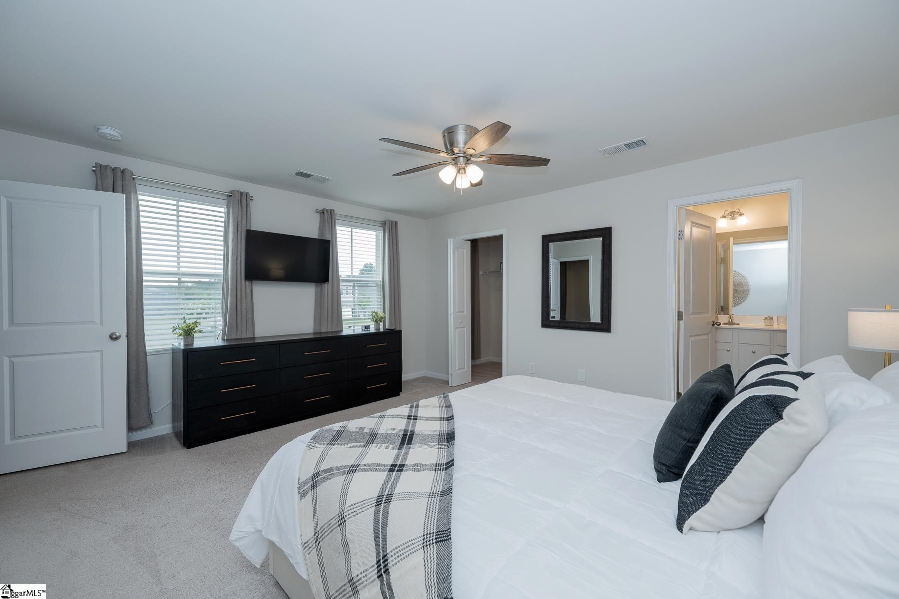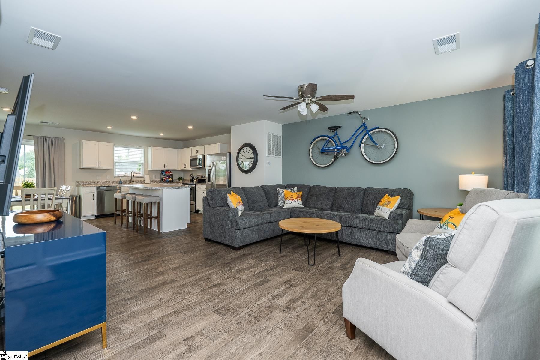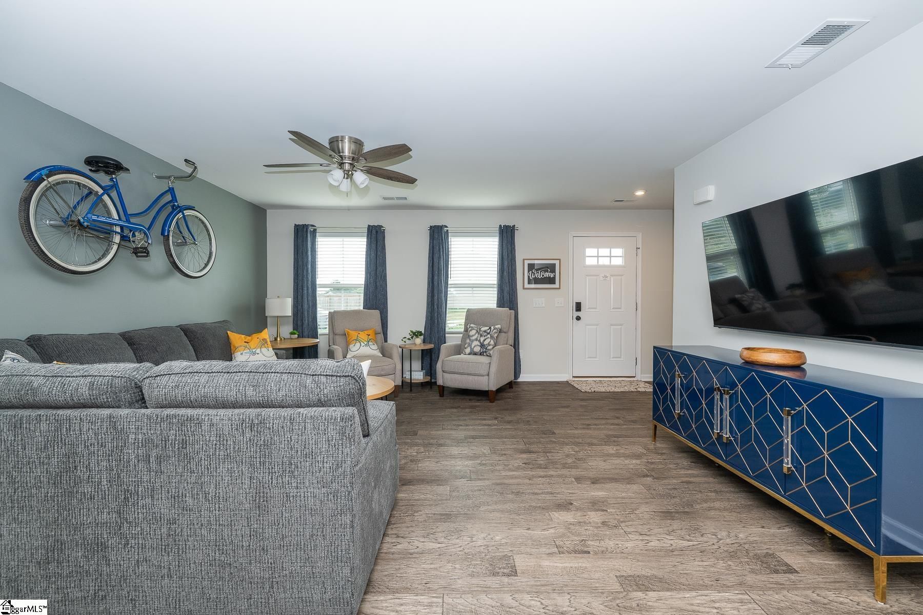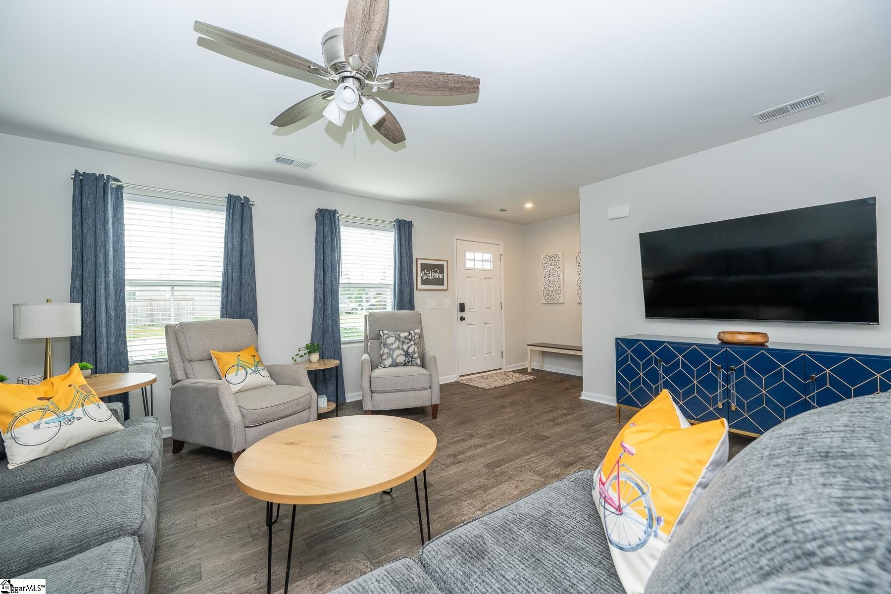 If an active lifestyle and convenience are at the top of your list, this 4-bedroom, 2.5-bath home delivers. Perfectly positioned with neighborhood access to the beloved Swamp Rabbit Trail and beautiful views of Paris Mountain, you’ll enjoy the best of the outdoors while being just minutes from Downtown Greenville and Travelers Rest. Step inside to an inviting, open main level designed for both everyday living and easy entertaining. The spacious living area flows effortlessly into the kitchen, where a large center island anchors the space—ideal for casual meals, morning coffee, or gathering with friends. Stainless steel appliances and abundant counter space make this kitchen as functional as it is stylish. A tucked-away flex room offers the perfect setup for a home office, playroom, or hobby space, along with a conveniently located half bath. Upstairs, all four bedrooms provide comfortable space for family or guests. The primary suite offers a private retreat complete with a walk-in closet, dual vanities, and a roomy shower. A centrally located laundry room makes daily routines simple, and the secondary bath with a tub/shower combo serves the additional bedrooms with ease. Outside, the fully fenced backyard is ready for pets, play, and weekend barbecues. The community also features a neighborhood nature trail leading to the playground, creating even more opportunities to enjoy the outdoors. As an added bonus, all furniture and home furnishings are available for purchase, making this an incredible turnkey opportunity. Move-in ready, lifestyle-focused, and location-driven—this home truly has it all.