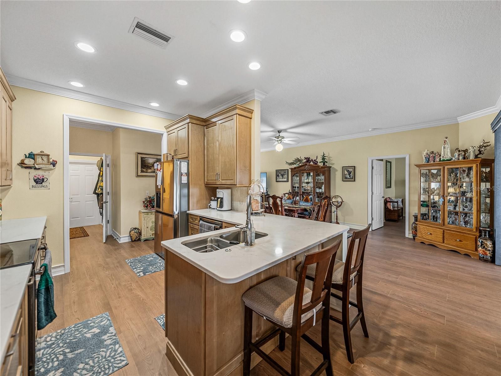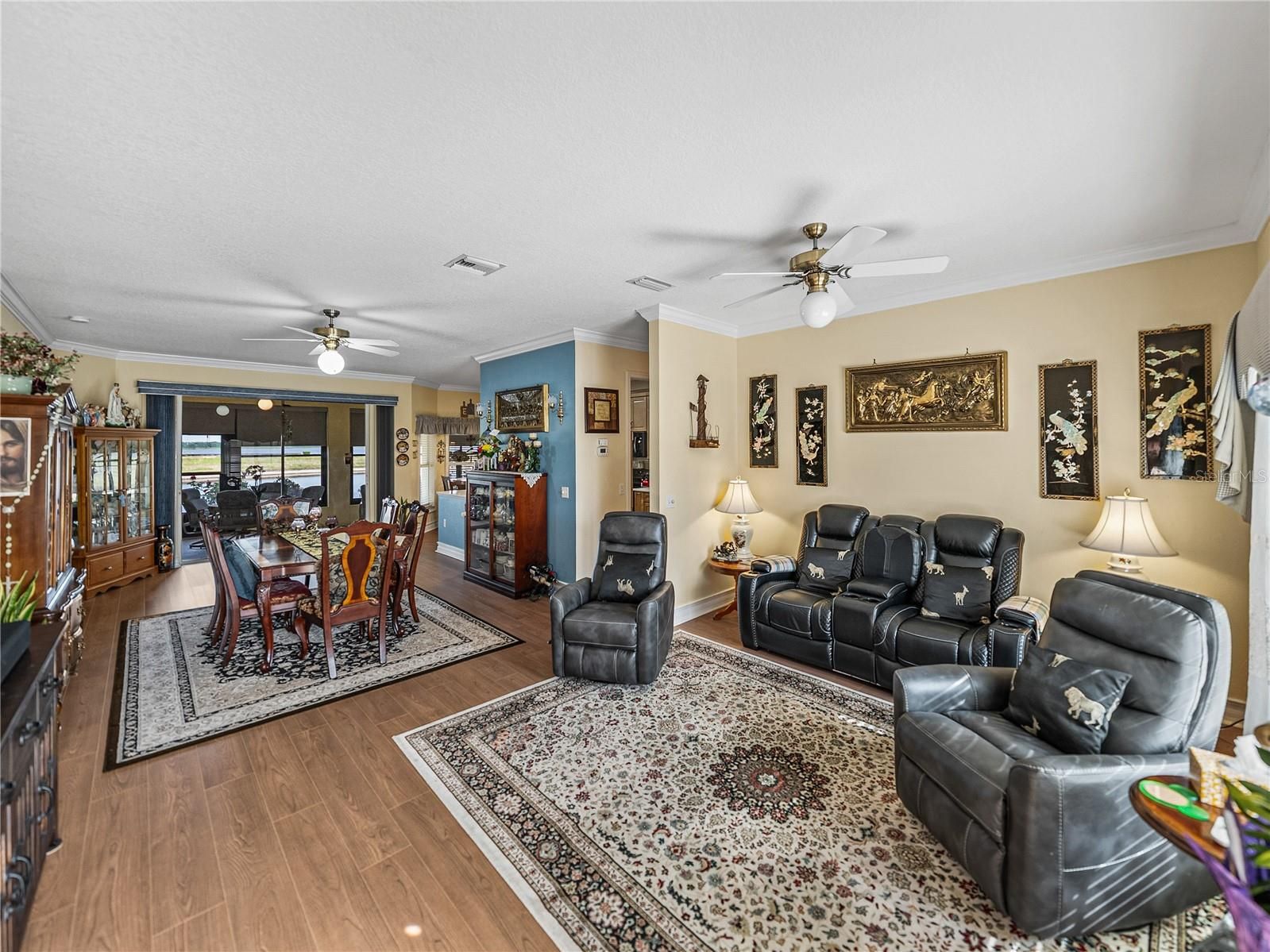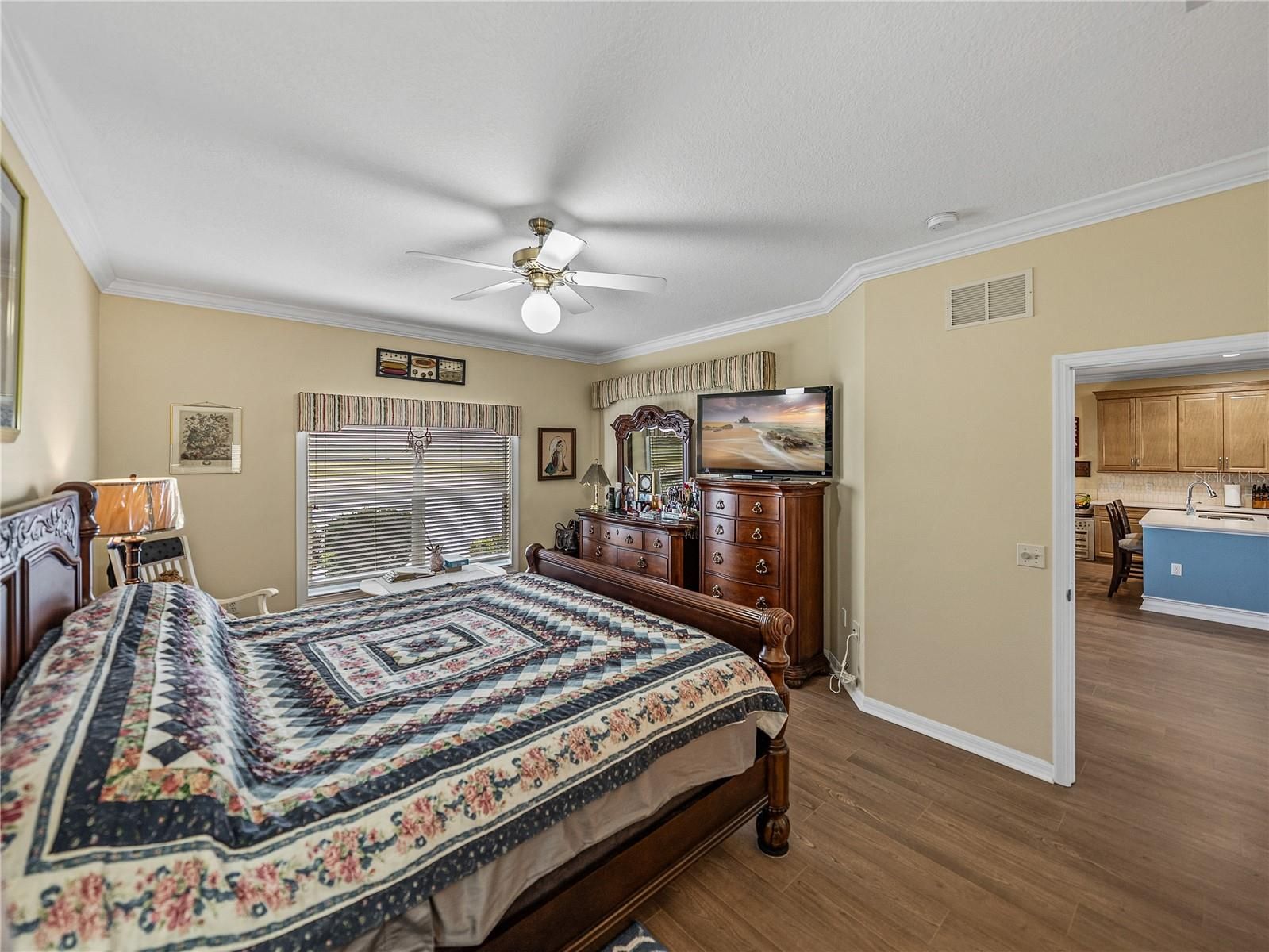 - Ceiling Fan(s), Crown Molding, Eat-in Kitchen, Living/Dining Room, Solid Surface Counters, Solid-Wood Cabinets, Walk-In Closet(s)