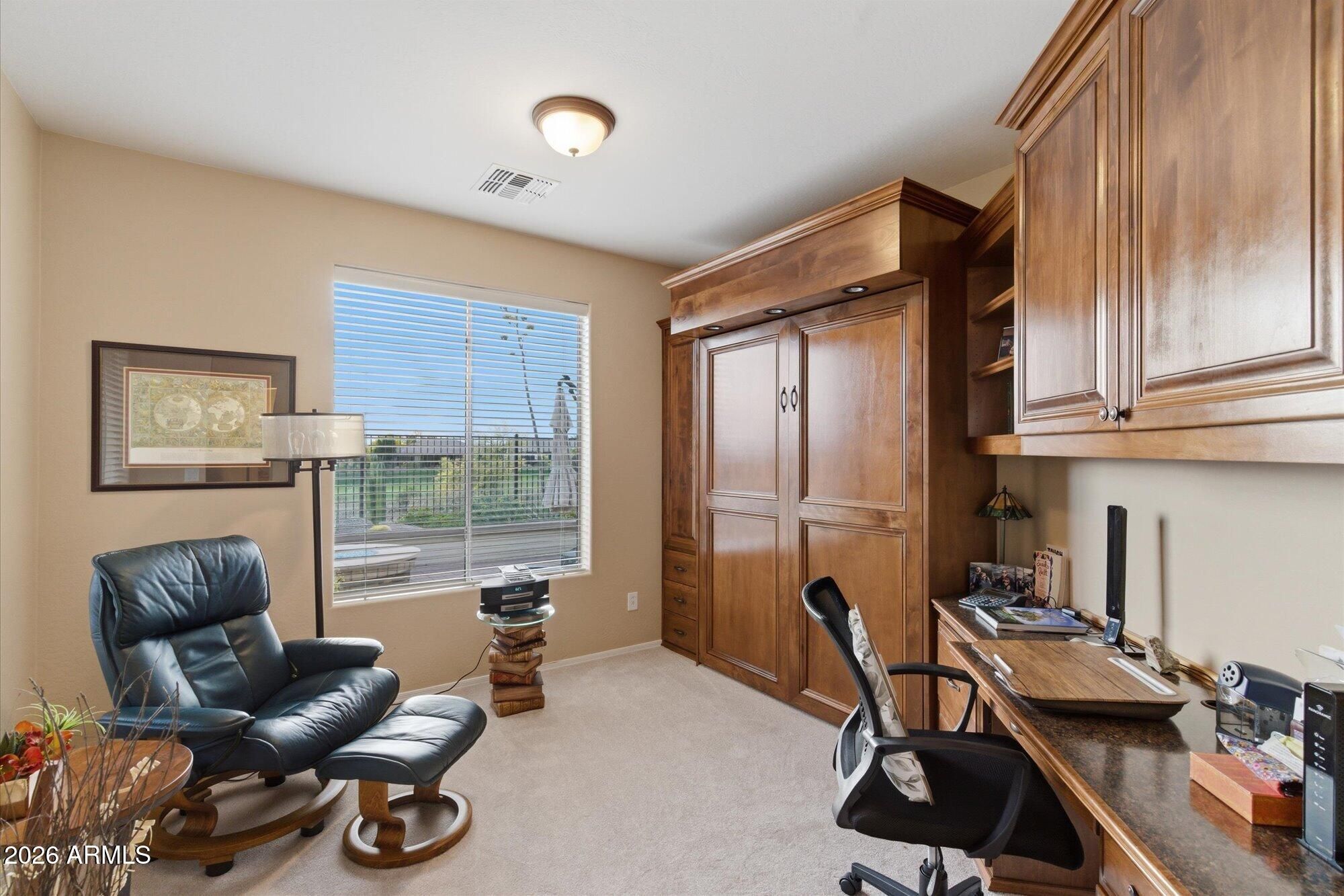 Situated on the 5th hole of Ironwood Golf Course in Anthem Golf & Country Club, this beautiful home offers 2 spacious bedrooms, 2 baths & a versatile office with built-ins + Murphy bed. The open concept kitchen flows seamlessly into the living area with views of the golf course, perfect for everyday living & entertaining. Enjoy your favorite beverage in your private front courtyard & an inviting backyard featuring an outdoor kitchen, fire pit & golf course views. It has solar panels for low to no electric bills. Located in a gated community with resort-style amenities including fitness centers, pools, tennis, pickle ball & dining. Optional golf membership available for purchase. It is convenient to I-17 for trips to Sedona & Flagstaff. Don't miss out on this gorgeous home!