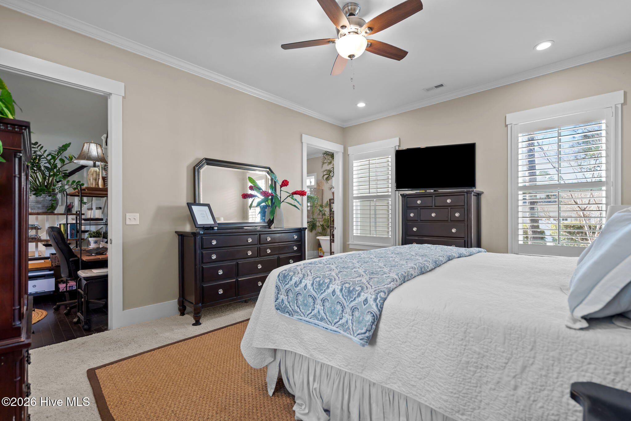- Master Downstairs, Walk-In Closet(s), Tray Ceiling(s), High Ceilings, Mud Room, Bookcases, Kitchen Island, Ceiling Fan(s), Walk-In Shower, Blinds