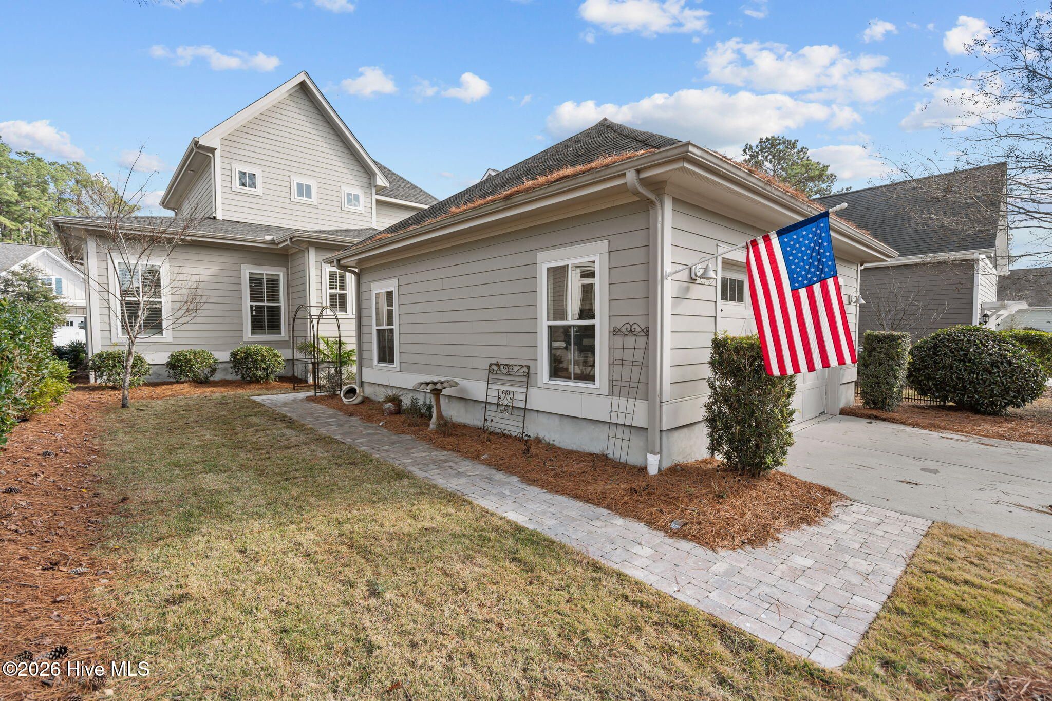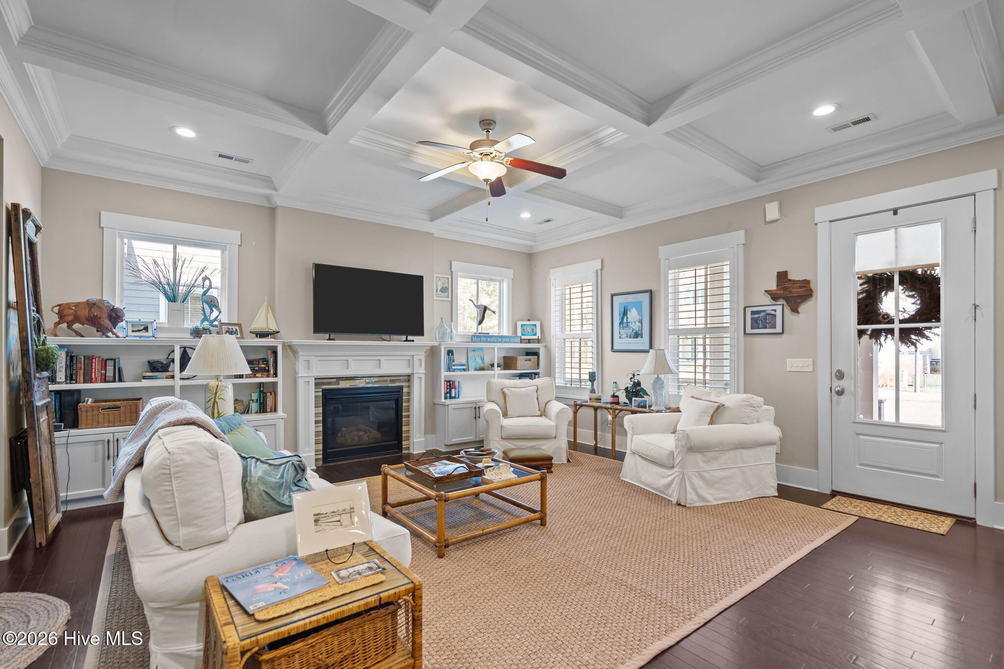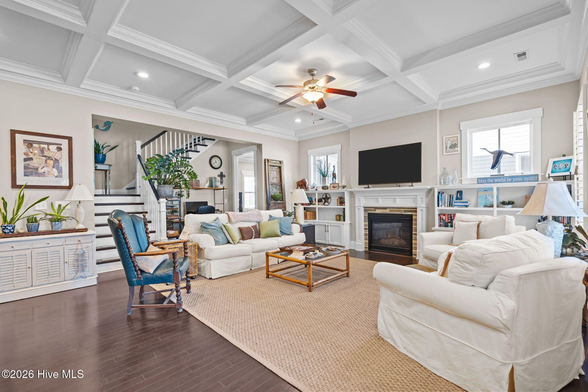 Beautifully situated in River Bluffs, a gated waterfront community, this home offers an exceptional lifestyle with access to a marina and boat ramp, resort-style pools, fitness centers, a half-mile riverwalk, community garden, and more—all just steps away, including the neighborhood pool right around the corner. A welcoming rocking chair front porch opens to a bright, open floor plan filled with architectural detailing and hardwood floors throughout the main living areas. The living room features a stunning 10-foot coffered ceiling, a cozy fireplace, and custom built-ins on either side, creating a warm and inviting gathering space. The chef's kitchen is designed for both function and style, showcasing an oversized island with bar seating, granite countertops, tile backsplash, and seamless flow into the dining area—perfect for entertaining. The primary suite is located on the main level and includes walk-in closets and a spa-like ensuite bath with a walk-in tiled shower, dual-sink vanity, and a freestanding pedestal soaking tub. A convenient laundry/mudroom with a drop zone adds everyday practicality. Upstairs, you'll find a versatile flex space, a second bedroom with an ensuite bath, a third bedroom, and an additional full bath—ideal for guests or family. Outdoor living continues off the mudroom with a back porch and patio that connects the home to the two-car detached garage, offering both charm and functionality. Recent updates include a new irrigation system and refreshed landscaping, enhancing the home's curb appeal and outdoor enjoyment. The HOA includes trash and recycling pickup as well as lawn care, providing low-maintenance living. This thoughtfully designed home combines timeless style, modern comfort, and an unbeatable community setting in River Bluffs.