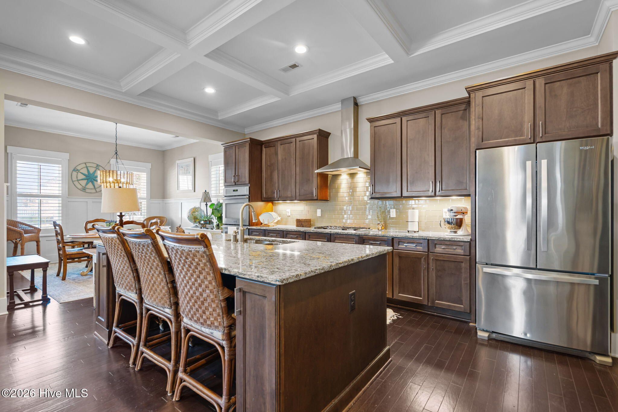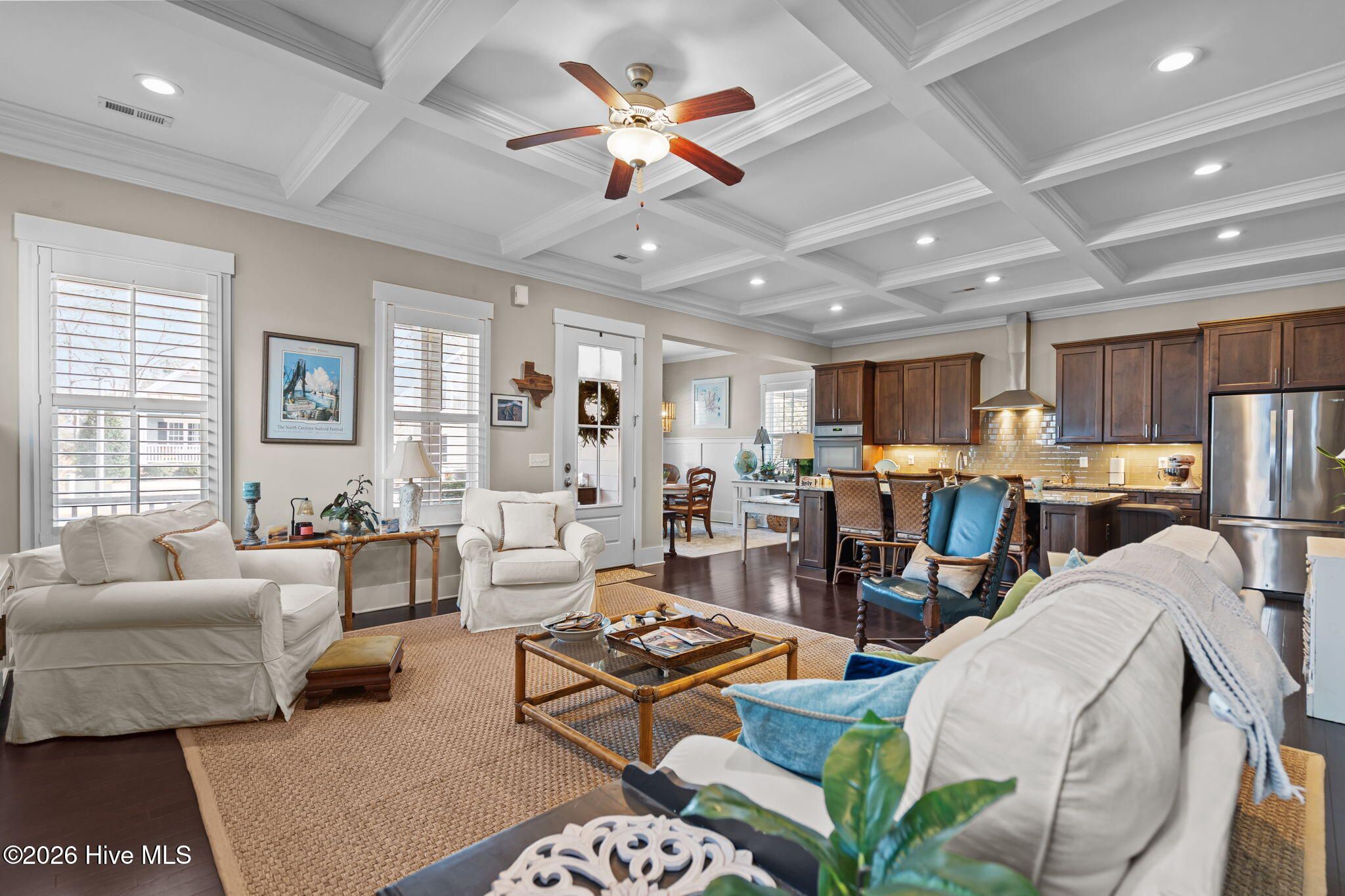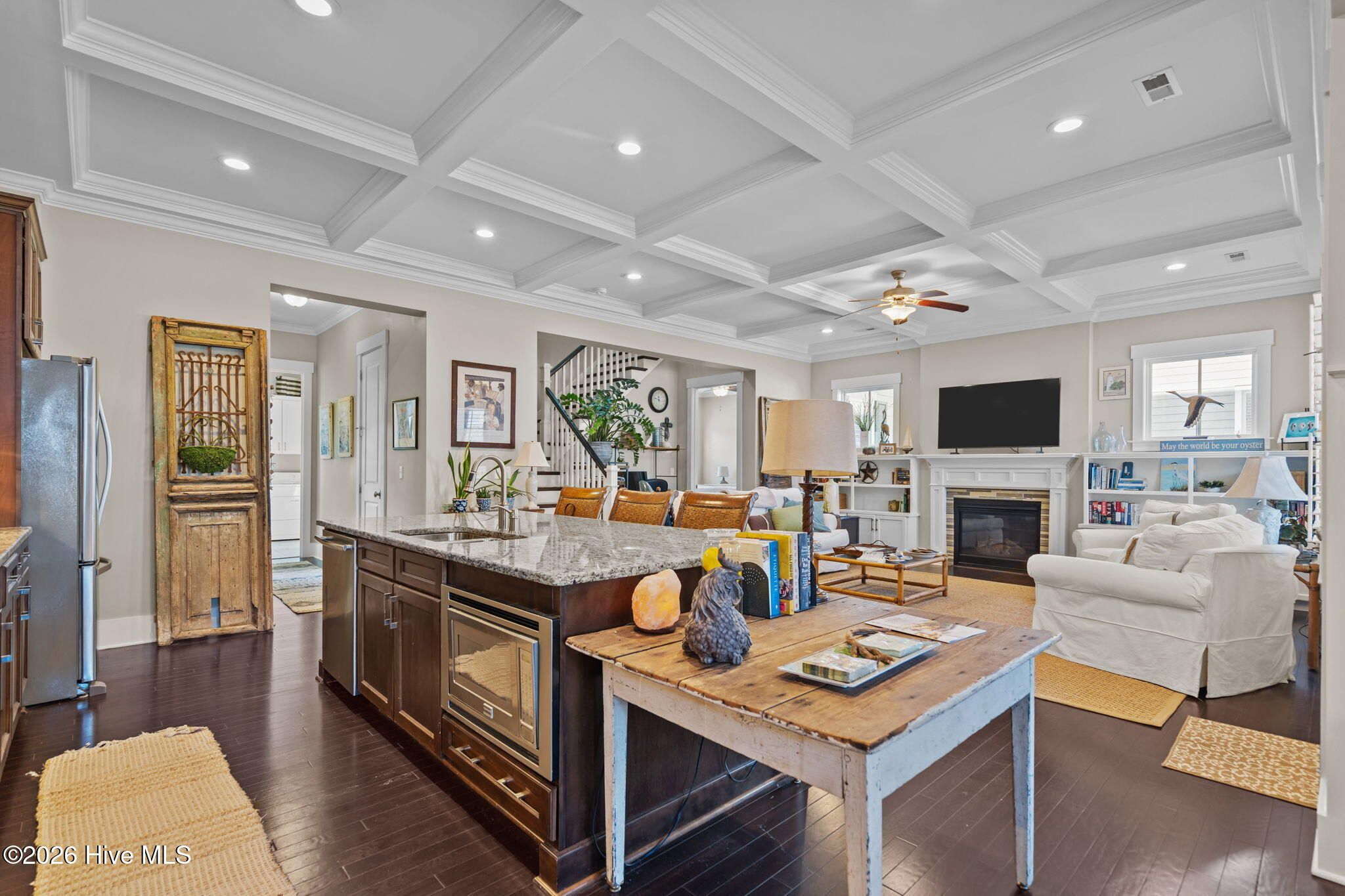 Beautifully situated in River Bluffs, a gated waterfront community, this home offers an exceptional lifestyle with access to a marina and boat ramp, resort-style pools, fitness centers, a half-mile riverwalk, community garden, and more—all just steps away, including the neighborhood pool right around the corner. A welcoming rocking chair front porch opens to a bright, open floor plan filled with architectural detailing and hardwood floors throughout the main living areas. The living room features a stunning 10-foot coffered ceiling, a cozy fireplace, and custom built-ins on either side, creating a warm and inviting gathering space. The chef's kitchen is designed for both function and style, showcasing an oversized island with bar seating, granite countertops, tile backsplash, and seamless flow into the dining area—perfect for entertaining. The primary suite is located on the main level and includes walk-in closets and a spa-like ensuite bath with a walk-in tiled shower, dual-sink vanity, and a freestanding pedestal soaking tub. A convenient laundry/mudroom with a drop zone adds everyday practicality. Upstairs, you'll find a versatile flex space, a second bedroom with an ensuite bath, a third bedroom, and an additional full bath—ideal for guests or family. Outdoor living continues off the mudroom with a back porch and patio that connects the home to the two-car detached garage, offering both charm and functionality. Recent updates include a new irrigation system and refreshed landscaping, enhancing the home's curb appeal and outdoor enjoyment. The HOA includes trash and recycling pickup as well as lawn care, providing low-maintenance living. This thoughtfully designed home combines timeless style, modern comfort, and an unbeatable community setting in River Bluffs.