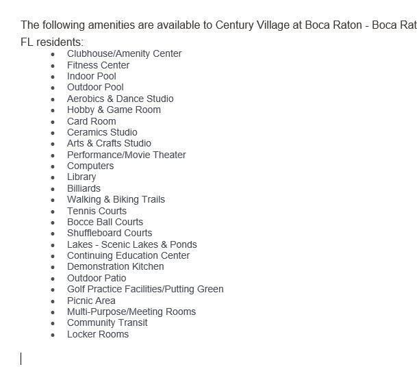 The following amenities are available to Century Village at Boca Raton - Boca Raton, FL residents: