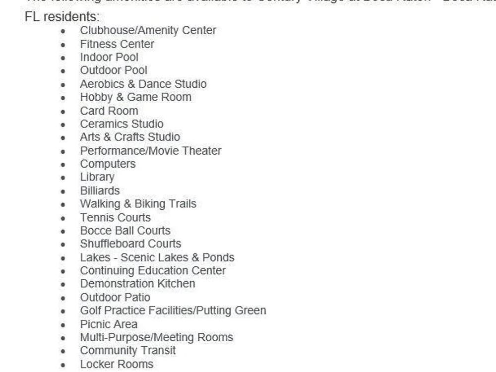The following amenities are available to Century Village at Boca Raton - Boca Raton, FL residents: