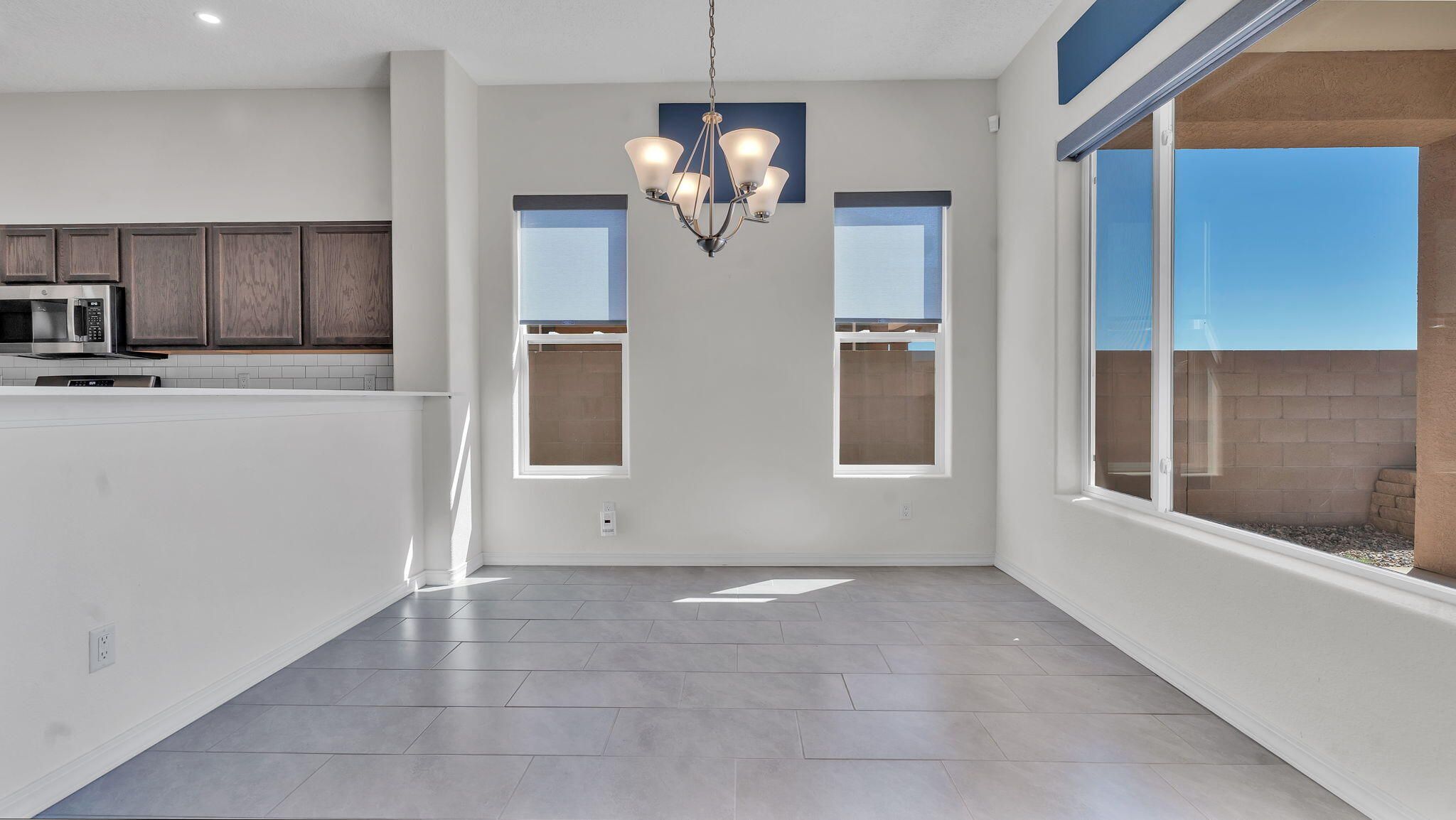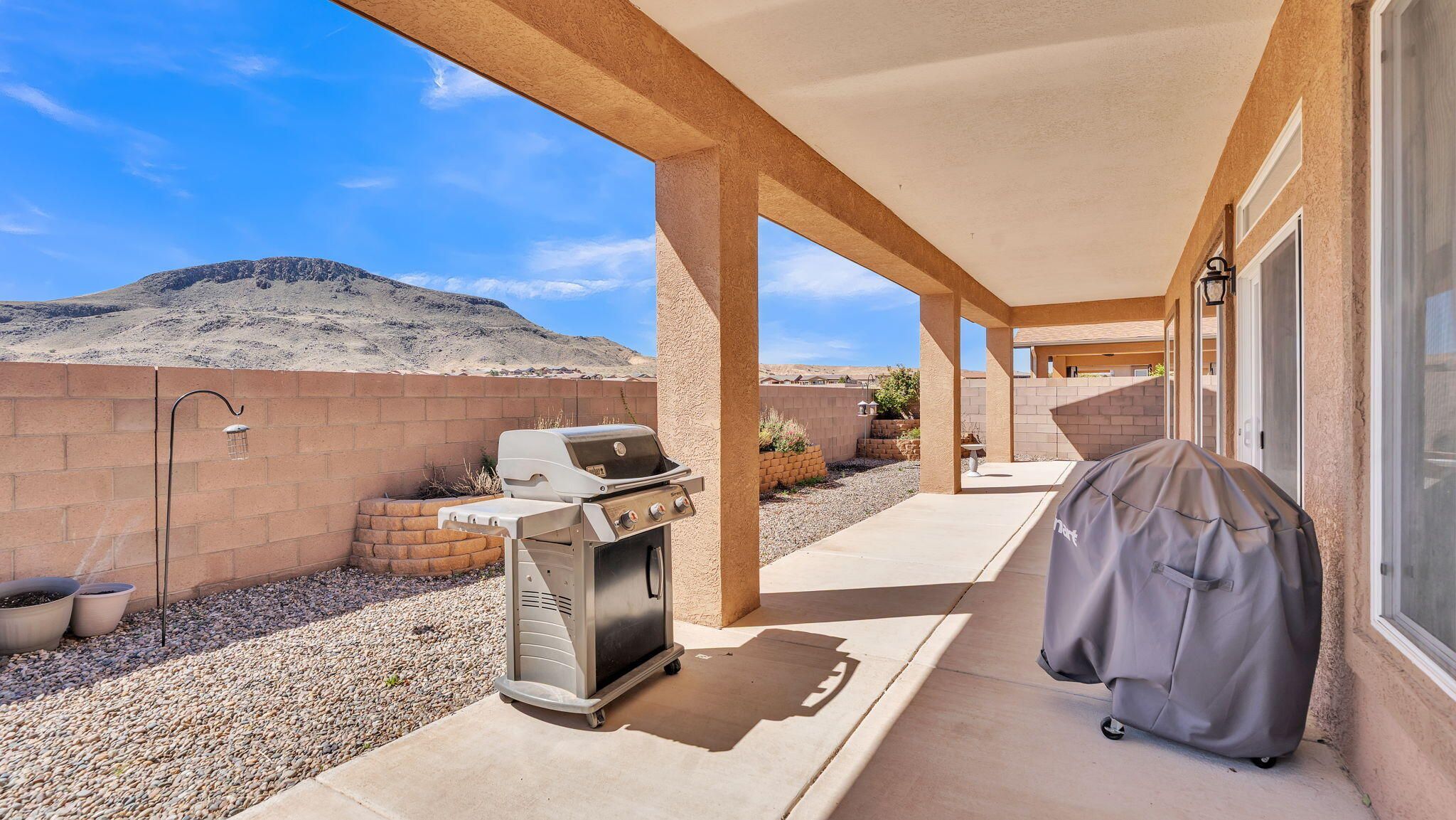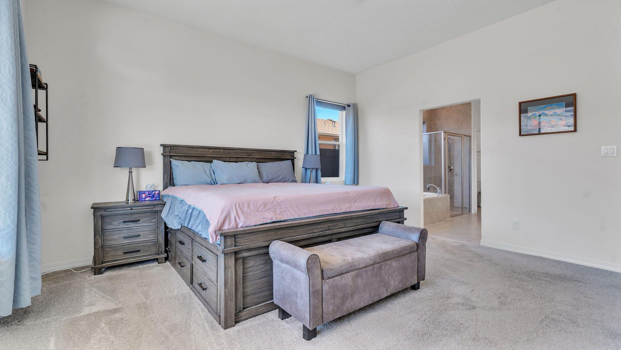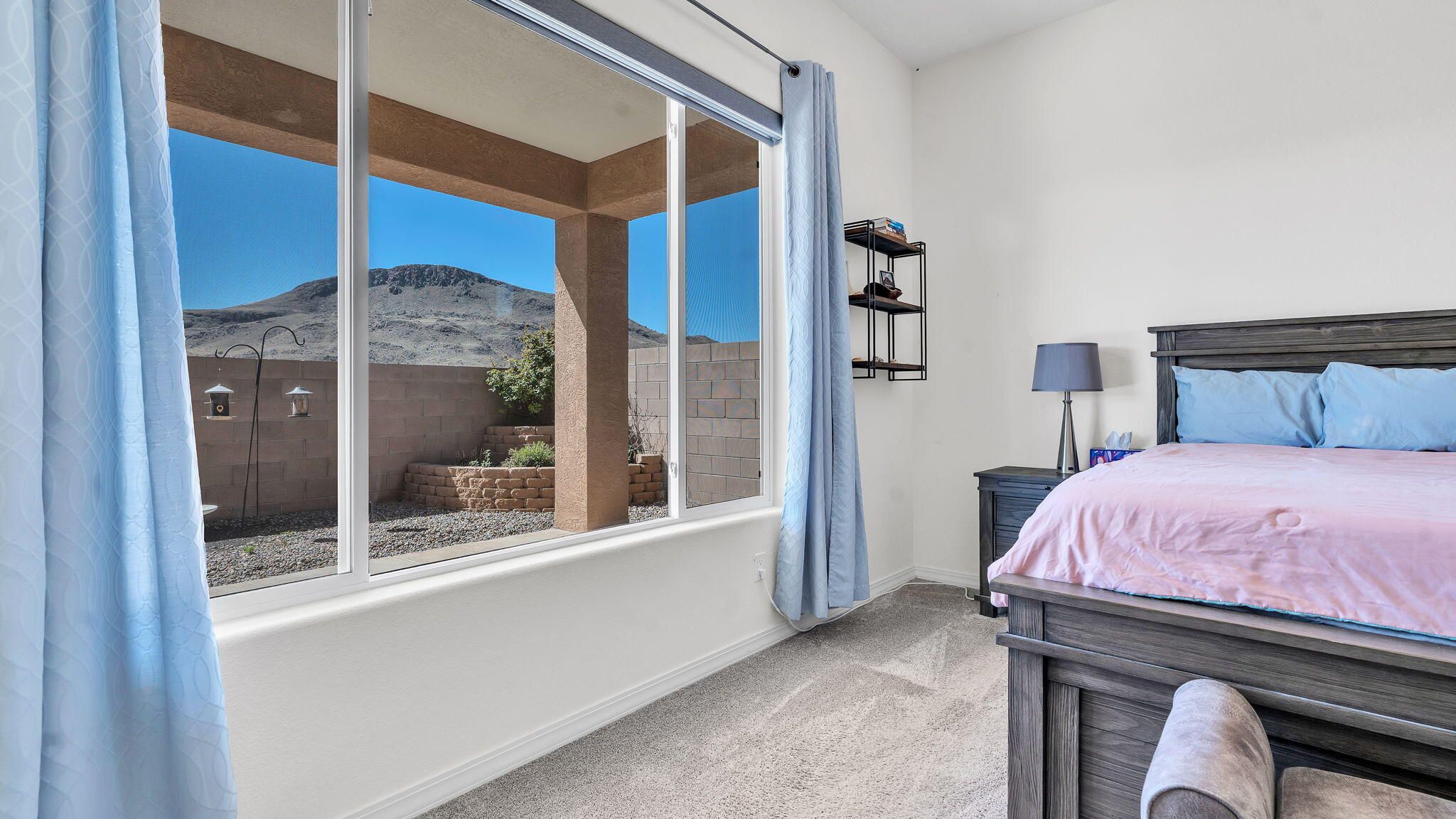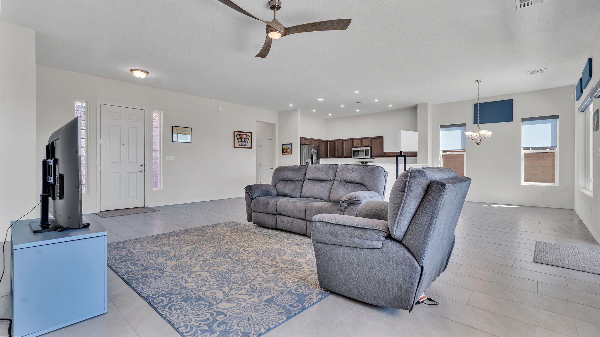 Experience refined, low-maintenance living in this pristine home featuring unobstructed views of El Cerro de Los Lunas. Avoid the upkeep of older properties with this 5 year old move in ready retreat, where over $20,000 in premium Graber blinds and professional landscaping are already in place. The open concept interior is designed for both style and privacy. A chef's kitchen, complete with quartz countertops, a spacious island, and stainless appliances flows seamlessly into the light filled living area. The thoughtful layout ensures maximum independence, as both the owner's suite and the second bedroom feature dedicated ensuite bathrooms, creating private sanctuaries for residents and guests alike. Outdoor living is a highlight, including an easy care backyard for effortless maintenance