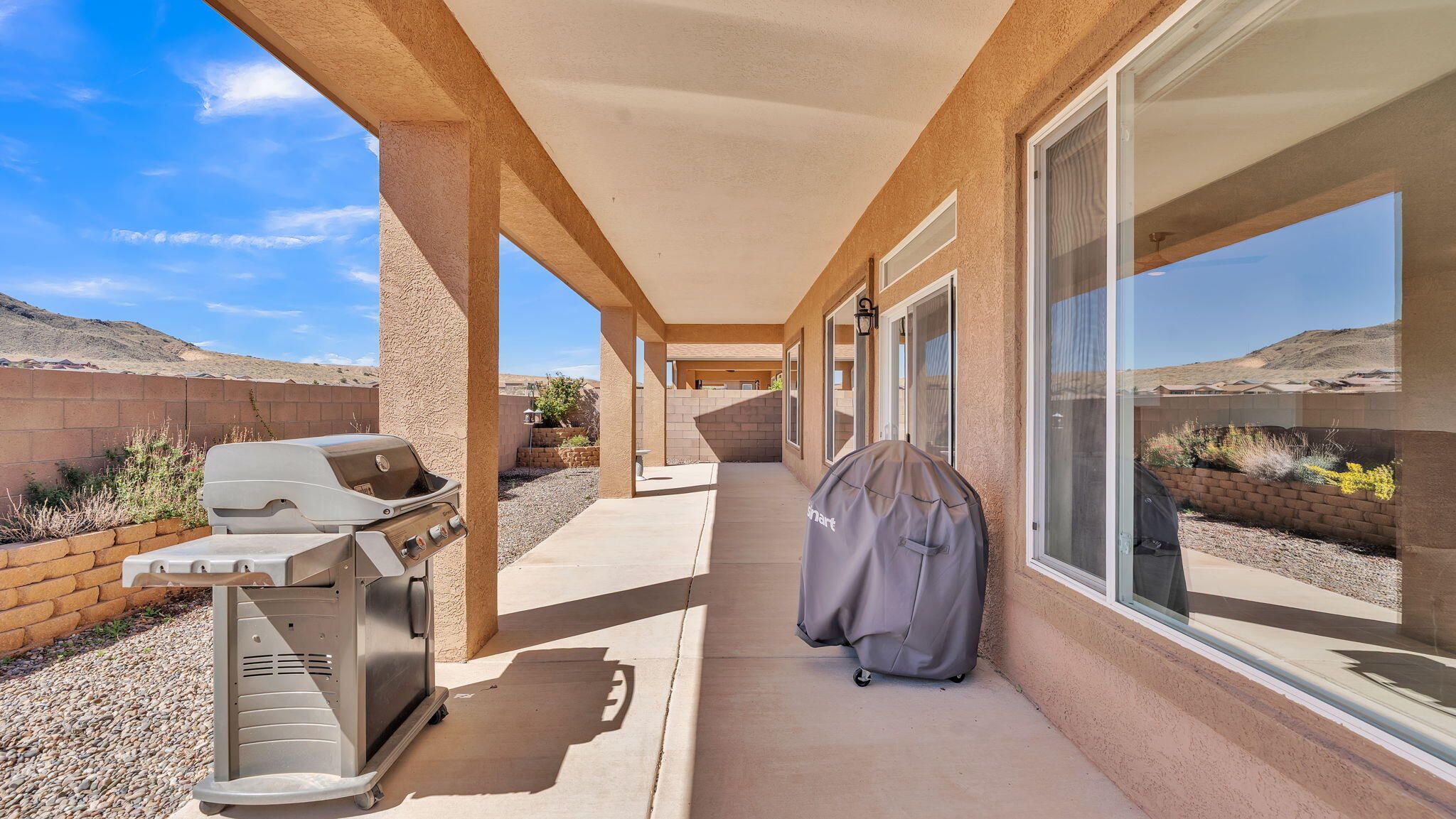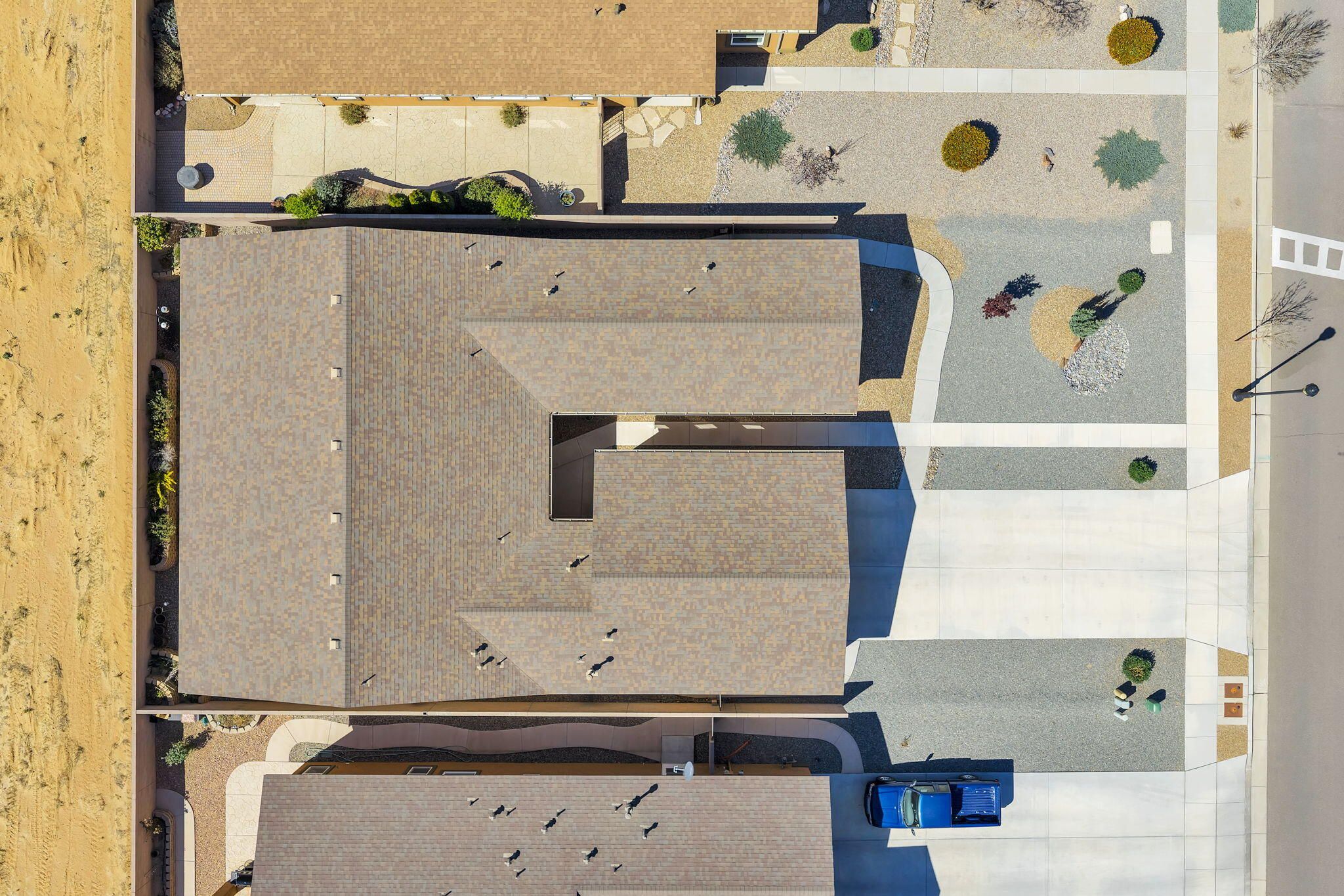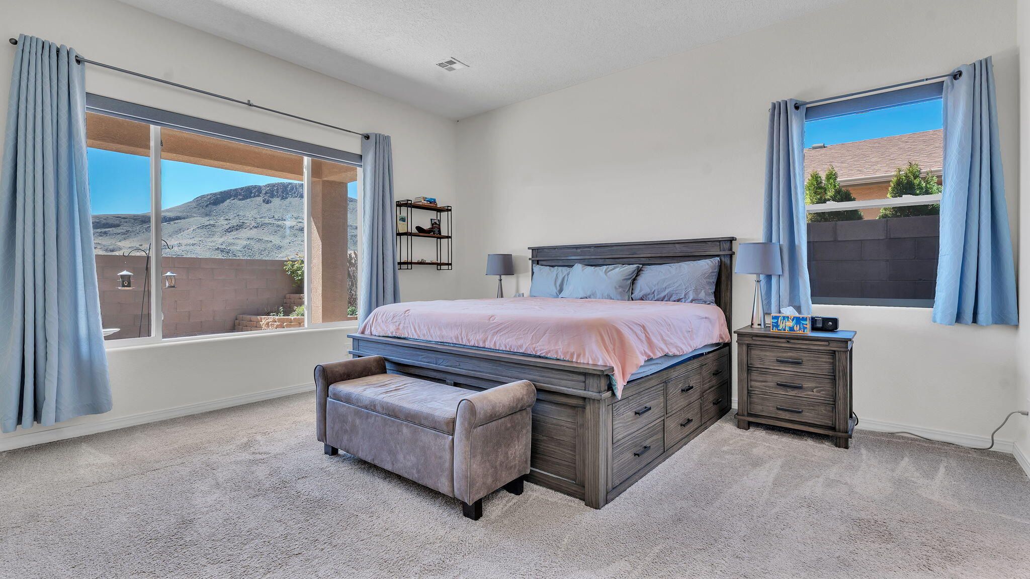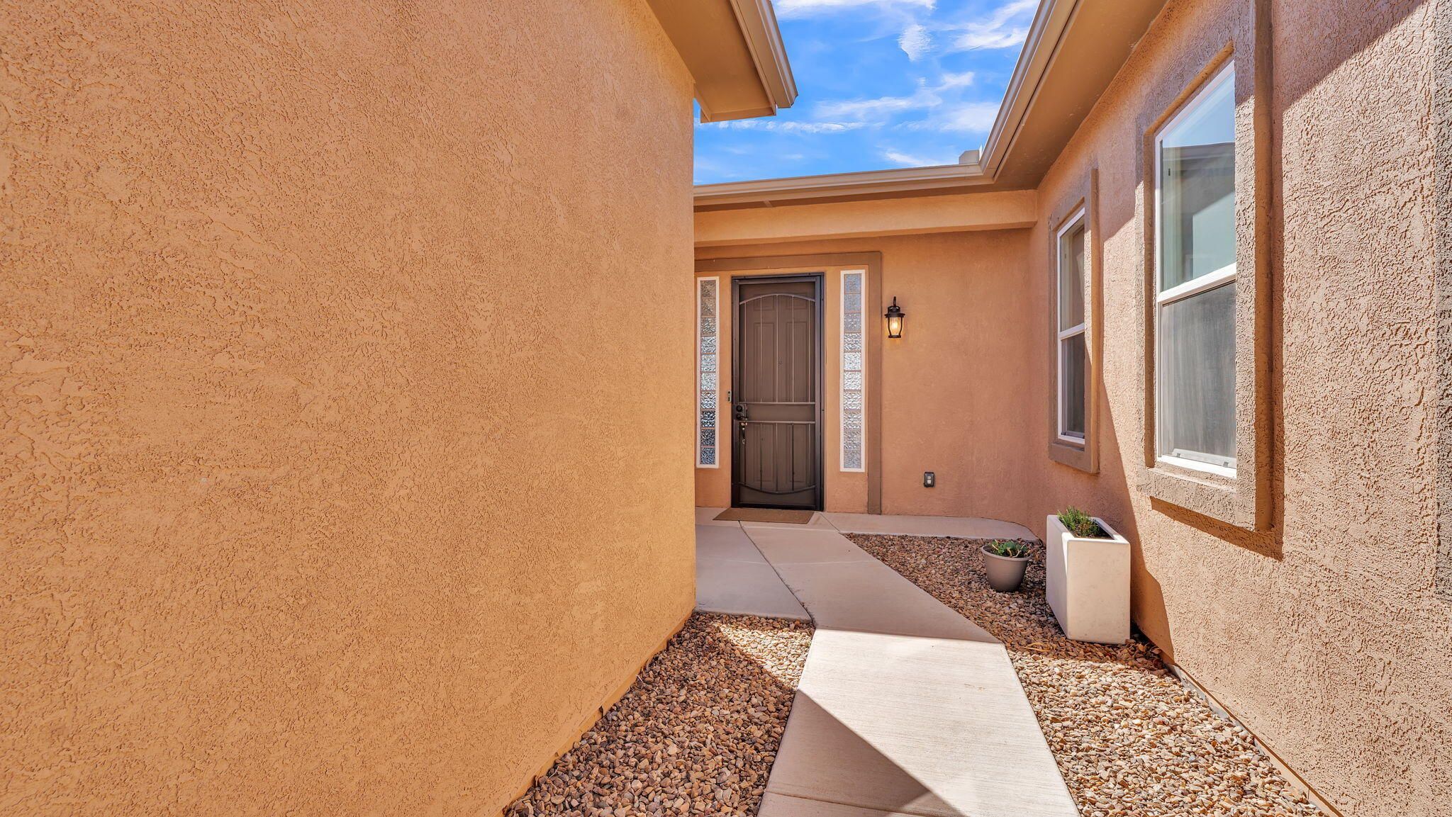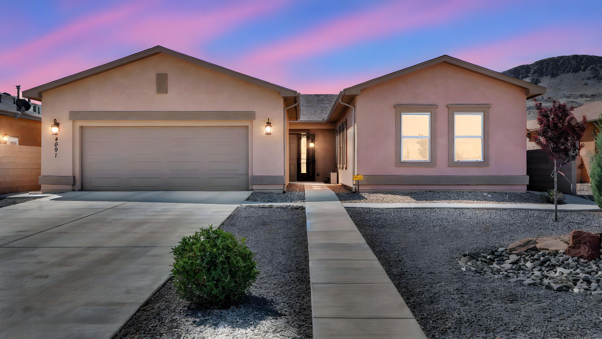 Experience refined, low-maintenance living in this pristine home featuring unobstructed views of El Cerro de Los Lunas. Avoid the upkeep of older properties with this 5 year old move in ready retreat, where over $20,000 in premium Graber blinds and professional landscaping are already in place. The open concept interior is designed for both style and privacy. A chef's kitchen, complete with quartz countertops, a spacious island, and stainless appliances flows seamlessly into the light filled living area. The thoughtful layout ensures maximum independence, as both the owner's suite and the second bedroom feature dedicated ensuite bathrooms, creating private sanctuaries for residents and guests alike. Outdoor living is a highlight, including an easy care backyard for effortless maintenance